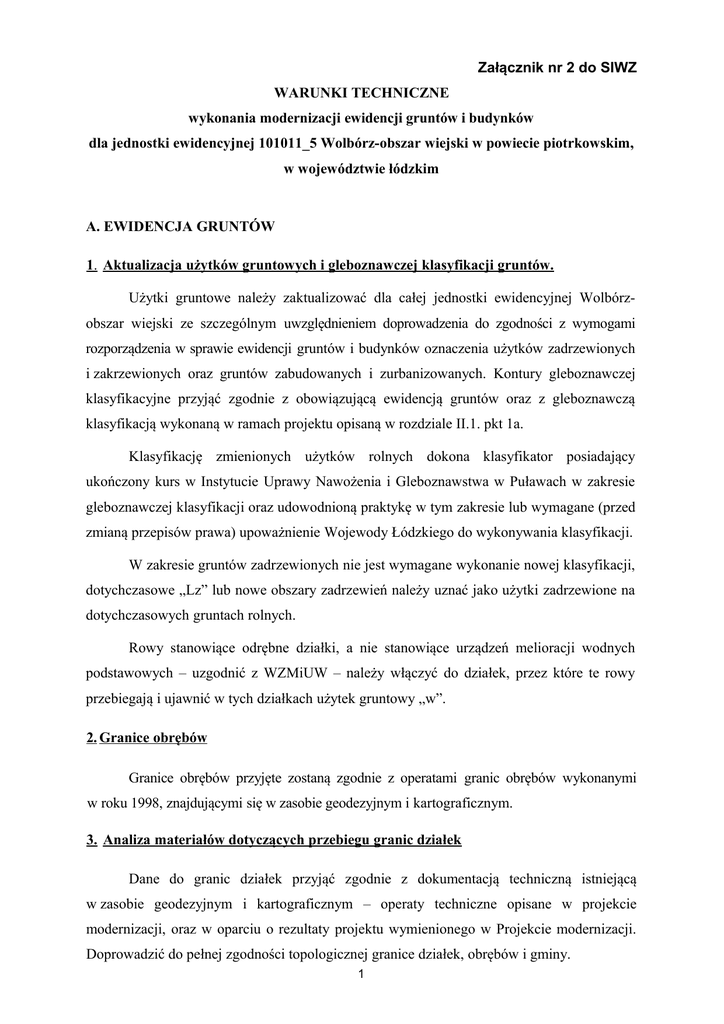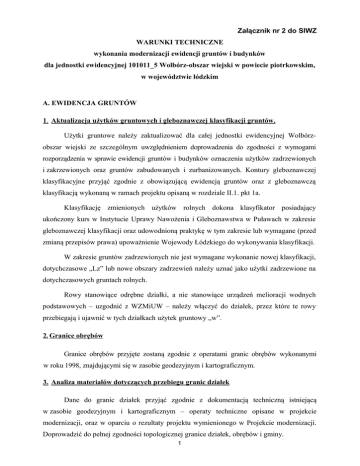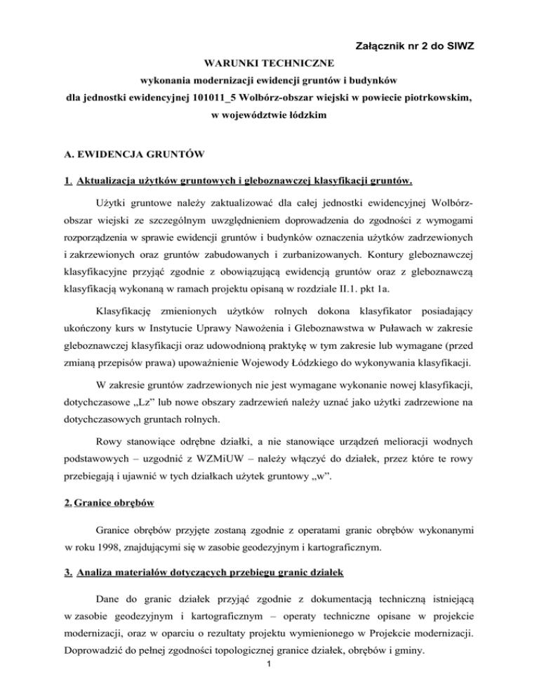 Załącznik nr 2 do SIWZ WARUNKI TECHNICZNE wykonania modernizacji ewidencji gruntów i budynków dla jednostki ewidencyjnej 101011_5 Wolbórz-obszar wiejski w powiecie piotrkowskim, w województwie łódzkim A. EWIDENCJA GRUNTÓW 1. Aktualizacja użytków gruntowych i gleboznawczej klasyfikacji gruntów. Użytki gruntowe należy zaktualizować dla całej jednostki ewidencyjnej Wolbórzobszar wiejski ze szczególnym uwzględnieniem doprowadzenia do zgodności z wymogami rozporządzenia w sprawie ewidencji gruntów i budynków oznaczenia użytków zadrzewionych i zakrzewionych oraz gruntów zabudowanych i zurbanizowanych. Kontury gleboznawczej klasyfikacyjne przyjąć zgodnie z obowiązującą ewidencją gruntów oraz z gleboznawczą klasyfikacją wykonaną w ramach projektu opisaną w rozdziale II.1. pkt 1a. Klasyfikację zmienionych użytków rolnych dokona klasyfikator posiadający ukończony kurs w Instytucie Uprawy Nawożenia i Gleboznawstwa w Puławach w zakresie gleboznawczej klasyfikacji oraz udowodnioną praktykę w tym zakresie lub wymagane (przed zmianą przepisów prawa) upoważnienie Wojewody Łódzkiego do wykonywania klasyfikacji. W zakresie gruntów zadrzewionych nie jest wymagane wykonanie nowej klasyfikacji, dotychczasowe „Lz” lub nowe obszary zadrzewień należy uznać jako użytki zadrzewione na dotychczasowych gruntach rolnych. Rowy stanowiące odrębne działki, a nie stanowiące urządzeń melioracji wodnych podstawowych – uzgodnić z WZMiUW – należy włączyć do działek, przez które te rowy przebiegają i ujawnić w tych działkach użytek gruntowy „w”. 2. Granice obrębów Granice obrębów przyjęte zostaną zgodnie z operatami granic obrębów wykonanymi w roku 1998, znajdującymi się w zasobie geodezyjnym i kartograficznym. 3. Analiza materiałów dotyczących przebiegu granic działek Dane do granic działek przyjąć zgodnie z dokumentacją techniczną istniejącą w zasobie geodezyjnym i kartograficznym – operaty techniczne opisane w projekcie modernizacji, oraz w oparciu o rezultaty projektu wymienionego w Projekcie modernizacji. Doprowadzić do pełnej zgodności topologicznej granice działek, obrębów i gminy. 1 4. Uzupełniający pomiar i ustalenie granic nieruchomości. Uzupełniający pomiar i ustalenie granic nieruchomości wykonane zostanie dla obrębów: Lubiatów, Polichno i Psary. Obszar do pomiaru uzupełniającego obejmuje powierzchnię 2635 ha, 2735 działek ewidencyjnych. Pomiaru i ustalenia granic dla tych działek należy wykonać wg stanu użytkowania (trwałe ogrodzenia, budynki, miedze), który pozostaje niezmienny od lat 60. Czynności powyższe należy wykonać zgodnie z zasadami określonymi w §37 i 38 rozporządzenia w sprawie ewidencji gruntów i budynków. Dopuszcza się powiadomienie o w/w czynnościach zainteresowane osoby w sposób zwyczajowo przyjęty w danej miejscowości. 5. Numeracja działek Numerację działek należy przyjąć zgodnie z obowiązującą w ewidencji gruntów dla poszczególnych obrębów jednostki ewidencyjnej Wolbórz. Wszelkie rozbieżności w tym zakresie należy wyjaśniać z działem ewidencji gruntów gm. Wolbórz. 6. Numeracja budynków Numeracja budynków nadawana będzie zgodnie z zasadą: od 1 do n w ramach danego obrębu. 7. Numeracja punktów granicznych. Numerację punktów granicznych przyjąć zgodnie z mapą numeryczną poszczególnych obrębów gminy Wolbórz. 8. Obliczenie powierzchni działek ewidencyjnych. Powierzchnie: ogólna obrębu i działek ewidencyjnych obliczone zostaną ze współrzędnych określonych z dokładnością zapisu do 0,001m (zgodnie z Zaleceniami ODGiK). Powierzchnia ogólna obrębu i działek zostanie wyrażona z dokładnością zapisu do 0,0001 hektara. Omówić należy wszystkie różnice w powierzchni działek przekraczające dopuszczalne odchyłki wyliczone wg wzoru: dP = 0.001P + 0.02^P (P oznacz powierzchnie w ha). Przy dużych różnicach w powierzchni wykonać pomiar kontrolny stanu zagospodarowania (trwałe miedze, ogrodzenia itp.) i porównać z wyliczonymi danymi dotyczącymi punktów granicznych działek. B. EWIDENCJA BUDYNKÓW I LOKALI 2 Budynki podlegające ewidencji to te, które są budynkami w rozumieniu standardowej klasyfikacji i nomenklatury, wprowadzonych na podstawie ustawy z dnia 29 czerwca 1995r. o statystyce publicznej ( Dz. U. Nr 88 poz. 439 z późn. zm.). Dane o budynkach i lokalach będących przedmiotami odrębnej własności należy uzyskać od właścicieli, władających, administratorów i zarządców, przez pomiar bezpośrednio w terenie, na podstawie badania KW, z operatu ewidencji gruntów. Dane do budynków należy pozyskać: - z istniejącej mapy numerycznej ewidencji gruntów obszaru wiejskiego gminy Wolbórz, zawierającej w swej treści warstwę budynków. - z bezpośredniego, uzupełniajacego pomiaru budynków w terenie . W ramach prac terenowych wykonany zostanie: 1.wywiad terenowy z wykorzystaniem istniejącej mapy zasadniczej w skali 1:1000 obejmujący zaznaczenie na mapie budynków do pomiaru uzupełniającego (brak budynku, zmiana kształtu lub błędy - ogólnie niezgodność mapy z terenem), 2.prace pomiarowe: a. oględziny i opis wszystkich budynków, b. zebranie danych o budynkach na druku „Karta budynków" i danych o lokalach na druku „Karta lokali". c. pomiar uzupełniający położenia i kształtu obrysu budynków zaznaczonych w trakcie wywiadu, oraz tych, dla których brak danych pomiarowych. W przypadkach, gdy właściciel nieruchomości odmówi: - umożliwienia dostępu do pomiaru nieruchomości, - udzielenia istotnych informacji o nieruchomości, wykonawca za każdym razem powiadomi pisemnie Zleceniodawcę. 3. prace kameralne: a) uzupełnienie bazy danych systemu informatycznego (zawierającego część opisową ewidencji gruntów, budynków i lokali) zbiorem danych z kart budynków i kart lokali, b) obliczenie współrzędnych obrysów budynków, c) założenie obiektowej bazy budy