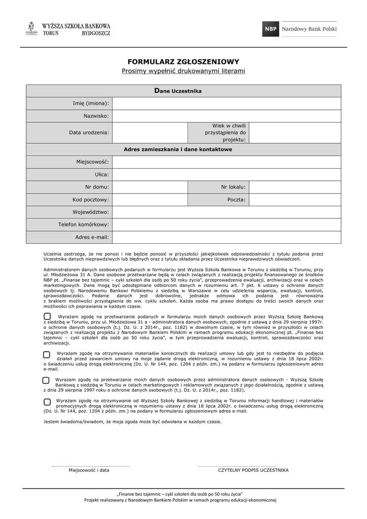 FORMULARZ ZGŁOSZENIOWY Z Prosimy wypełnić drukowanymi literami Dane Uczestnika Imię (imiona): Nazwisko: Wiek w chwili przystąpienia do projektu: Data urodzenia: Adres zamieszkania i dane kontaktowe Miejscowość: Ulica: Nr domu: Nr lokalu: Kod pocztowy: Poczta: Województwo: Telefon komórkowy: Adres e-mail: Uczelnia zastrzega, że nie ponosi i nie będzie ponosić w przyszłości jakiejkolwiek odpowiedzialności z tytułu podania przez Uczestnika danych nieprawdziwych lub błędnych oraz z tytułu składania przez Uczestnika nieprawdziwych oświadczeń. Administratorem danych osobowych podanych w formularzu jest Wyższa Szkoła Bankowa w Toruniu z siedzibą w Toruniu, przy ul. Młodzieżowa 31 A. Dane osobowe przetwarzane będą w celach związanych z realizacją projektu finansowanego ze środków NBP pt. „Finanse bez tajemnic – cykl szkoleń dla osób po 50 roku życia”, życia przeprowadzenia ewaluacji,, archiwizacji oraz w celach marketingowych. Dane mogą być udostępniane odbiorcom danych w rozumieniu art. 7 pkt. 6 ustawy o ochronie danych osobowych tj. Narodowemu Bankowi Polskiemu P z siedzibą w Warszawie w celu udzielenia wsparcia, ewaluacji, kontroli, sprawozdawczości. Podanie danych jest dobrowolne, jednakże odmowa ich podania jest równoważna z brakiem możliwości przystąpienia do ww. cyklu szkoleń. Każda osoba ma prawo dostępu stępu do treści swoich danych oraz możliwości ich poprawiania w każdym czasie. Wyrażam zgodę na przetwarzanie podanych w formularzu moich danych osobowych przez Wyższą Szkolę Bankową z siedzibą w Toruniu, przy ul. Młodzieżowa 31 a - administratora danych h osobowych, zgodnie z ustawą z dnia 29 sierpnia 1997r. o ochronie danych osobowych (t.j. t.j. Dz. U. z 2014r., 2014 poz. 1182)) w dowolnym czasie, w tym również w przyszłości w celach związanych z realizacją projektu z Narodowym Bankiem Polskim w ramach programu edukacji ekonomicznej pt. „Finanse bez tajemnic – cykl szkoleń dla osób po 50 roku życia”, życia”, w tym przeprowadzenia ewaluacji, kontroli, sprawozdawczości oraz archiwizacji. Wyrażam zgodę na otrzymywanie materiałów koniecznych do realizacji umowy lub gdy jest jest to niezbędne do podjęcia działań przed zawarciem umowy na moje żądanie drogą elektroniczną, w rozumieniu ustawy z dnia 18 lipca 2002r. o świadczeniu usług drogą elektroniczną (Dz. U. Nr 144, poz. 1204 z późn. zm.) na podany w formularzu zgłoszeniowym adres e-mail. Wyrażam zgodę na przetwarzanie moich danych osobowych przez administratora danych osobowych - Wyższą Szkołę Bankową z siedzibą w Toruniu w celach marketingowych i reklamowych związanych z jego działalnością, zgodnie z ustawą z dnia 29 sierpnia 1997 roku o ochronie danych osobowych (t.j. Dz. U. z 2014r., poz. 1182). Wyrażam zgodę na otrzymywanie od Wyższej Szkoły Bankowej z siedzibą w Toruniu informacji handlowej i materiałów promocyjnych drogą elektroniczną w rozumieniu ustawy z dnia 18 lipca 2002r. o świadczeniu usług drogą elektroniczną (Dz. U. Nr 144, poz. 1204 z późn. zm.) .) na podany w formularzu zgłoszeniowym adres e-mail. Jestem świadoma/świadom, że moja zgoda może być odwołana w każdym czasie. …………………………………………………………………… Miejscowość i data …………………………………………………………………… CZYTELNY PODPIS UCZESTNIKA „Finanse Finanse bez tajemnic – cykl szkoleń dla osób po 50 roku życia” Projekt realizowany z Narodowym Bankiem Polskim w ramach programu edukacji ekonomicznej
