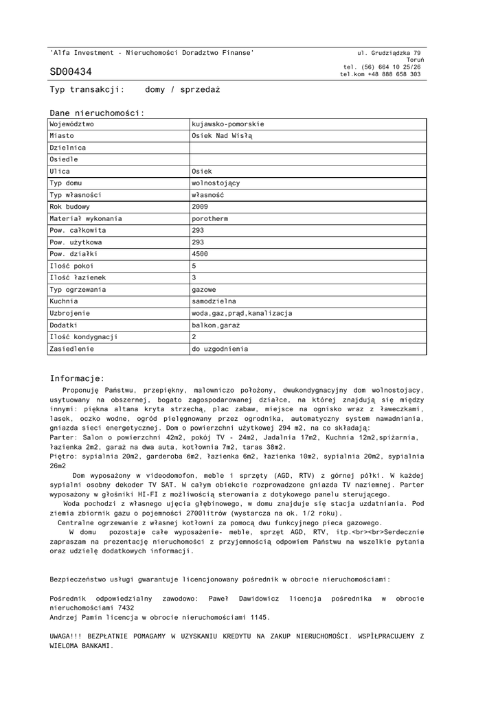 'Alfa Investment - Nieruchomości Doradztwo Finanse' ul. Grudziądzka 79 Toruń tel. (56) 664 10 25/26 tel.kom +48 888 658 303 SD00434 Typ transakcji: domy / sprzedaż Dane nieruchomości: Województwo kujawsko-pomorskie Miasto Osiek Nad Wisłą Dzielnica Osiedle Ulica Osiek Typ domu wolnostojący Typ własności własność Rok budowy 2009 Materiał wykonania porotherm Pow. całkowita 293 Pow. użytkowa 293 Pow. działki 4500 Ilość pokoi 5 Ilość łazienek 3 Typ ogrzewania gazowe Kuchnia samodzielna Uzbrojenie woda,gaz,prąd,kanalizacja Dodatki balkon,garaż Ilość kondygnacji 2 Zasiedlenie do uzgodnienia Informacje: Proponuję Państwu, przepiękny, malowniczo położony, dwukondygnacyjny dom wolnostojacy, usytuowany na obszernej, bogato zagospodarowanej działce, na której znajdują się między innymi: piękna altana kryta strzechą, plac zabaw, miejsce na ognisko wraz z ławeczkami, lasek, oczko wodne, ogród pielęgnowany przez ogrodnika, automatyczny system nawadniania, gniazda sieci energetycznej. Dom o powierzchni użytkowej 294 m2, na co składają: Parter: Salon o powierzchni 42m2, pokój TV - 24m2, Jadalnia 17m2, Kuchnia 12m2,spiżarnia, łazienka 2m2, garaż na dwa auta, kotłownia 7m2, taras 38m2. Piętro: sypialnia 20m2, garderoba 6m2, łazienka 6m2, łazienka 10m2, sypialnia 20m2, sypialnia 26m2 Dom wyposażony w videodomofon, meble i sprzęty (AGD, RTV) z górnej półki. W każdej sypialni osobny dekoder TV SAT. W całym obiekcie rozprowadzone gniazda TV naziemnej. Parter wyposażony w głośniki HI-FI z możliwością sterowania z dotykowego panelu sterującego. Woda pochodzi z własnego ujęcia głębinowego, w domu znajduje się stacja uzdatniania. Pod ziemia zbiornik gazu o pojemności 2700litrów (wystarcza na ok. 1/2 roku). Centralne ogrzewanie z własnej kotłowni za pomocą dwu funkcyjnego pieca gazowego. W domu pozostaje całe wyposażenie- meble, sprzęt AGD, RTV, itp.<br><br>Serdecznie zapraszam na prezentację nieruchomości z przyjemnością odpowiem Państwu na wszelkie pytania oraz udzielę dodatkowych informacji. Bezpieczeństwo usługi gwarantuje licencjonowany pośrednik w obrocie nieruchomościami: Pośrednik odpowiedzialny zawodowo: Paweł Dawidowicz nieruchomościami 7432 Andrzej Pamin licencja w obrocie nieruchomościami 1145. licencja pośrednika w obrocie UWAGA!!! BEZPŁATNIE POMAGAMY W UZYSKANIU KREDYTU NA ZAKUP NIERUCHOMOŚCI. WSPÓŁPRACUJEMY Z WIELOMA BANKAMI. Treść niniejszego ogłoszenia nie stanowi oferty handlowej w rozumieniu przepisów Kodeksu Cywilnego. Więcej ofert na www.alfa-investment.pl. Zapraszamy! Cena: 1 300 000 PLN Dokument wygenerowany ze strony www.alfa-investment.pl Strona 2