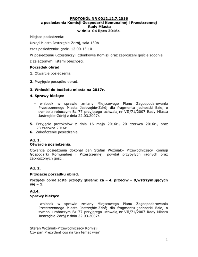 PROTOKÓŁ NR 0012.12.7.2016 z posiedzenia Komisji Gospodarki Komunalnej i Przestrzennej Rady Miasta w dniu 04 lipca 2016r. Miejsce posiedzenia: Urząd Miasta Jastrzębie-Zdrój, sala 130A czas posiedzenia: godz. 12.00-13.10 W posiedzeniu uczestniczyli członkowie Komisji oraz zaproszeni goście zgodnie z załączonymi listami obecności. Porządek obrad 1. Otwarcie posiedzenia. 2. Przyjęcie porządku obrad. 3. Wnioski do budżetu miasta na 2017r. 4. Sprawy bieżące - wniosek w sprawie zmiany Miejscowego Planu Zagospodarowania Przestrzennego Miasta Jastrzębie-Zdrój dla fragmentu jednostki Bzie, o symbolu roboczym Bz 77 przyjętego uchwałą nr VII/71/2007 Rady Miasta Jastrzębie-Zdrój z dnia 22.03.2007r. 5. Przyjęcie protokołów z dnia 16 maja 2016r., 20 czerwca 2016r., oraz 23 czerwca 2016r. 6. Zakończenie posiedzenia. Ad. 1. Otwarcie posiedzenia. Otwarcia posiedzenia dokonał pan Stefan Woźniak– Przewodniczący Komisji Gospodarki Komunalnej i Przestrzennej, powitał przybyłych radnych oraz zaproszonych gości. Ad. 2. Przyjęcie porządku obrad. Porządek obrad został przyjęty głosami: za – 4, przeciw – 0,wstrzymujących się – 1. Ad.4. Sprawy bieżące - wniosek w sprawie zmiany Miejscowego Planu Zagospodarowania Przestrzennego Miasta Jastrzębie-Zdrój dla fragmentu jednostki Bzie, o symbolu roboczym Bz 77 przyjętego uchwałą nr VII/71/2007 Rady Miasta Jastrzębie-Zdrój z dnia 22.03.2007r. Stefan Woźniak-Przewodniczący Komisji Czy pan Prezydent coś na ten temat wie? 1 Janusz Buda-Zastępca Prezydenta Miasta Myślę, że będzie więcej informacji… Stefan Woźniak-Przewodniczący Komisji We wrześniu na Komisji. Janusz Buda-Zastępca Prezydenta Miasta Tak. Stefan Woźniak-Przewodniczący Komisji Czyli, ten wniosek będzie rozpatrywany we wrześniu. Każdy radny dostał do skrzynki i przeczyta. Tadeusz Markiewicz-radny RM To znaczy panie Prezydencie, że dostaniemy pełne wyjaśnienie? Chociaż z tego można wyczytać, jak i co było. Janusz Buda-Zastępca Prezydenta Miasta Treści tego pisma nie widziałem, bo przeszło to drogą służbową i poszło do wydziałów, które są poza moim zakresem odpowiedzialności. Natomiast, jeżeli to wpłynęło niedawno… Stefan Woźniak-Przewodniczący Komisji To wpłynęło teraz tj.27 czerwca. Tadeusz Markiewicz-radny RM Oczywiście, że było to związane z tym, że najpierw była hala, potem kurnik, a potem inne, ale dostał z gminy pozwolenie na to i nie powinien tego dostać. Janusz Buda-Zastępca Prezydenta Miasta Temat przeciąga się i jest to na pewno poza ochroną środowiska, ponieważ została tam ilość kurczaków zmniejszona. Tadeusz Markiewicz-radny RM Była decyzja? Mariusz Rogala-Naczelnik Wydziału Ochrony Środowiska To było poza decyzją. Janusz Buda-Zastępca Prezydenta Miasta Tak, poza decyzją i w tym momencie Wydział Architektury. Jeżeli teraz to wpłynęło, będą przygotowane materiały, żeby to na wrzesień omówić. Mariusz Rogala-Naczelnik Wydziału Ochrony Środowiska Proszę państwa, zawsze była tam strefa produkcyjna i zawsze była działalność rolnicza na tym terenie. Stefan Woźniak-Przewodniczący Komisji Panie Naczelniku, jeżeli była tam strefa, to kto wydał decyzję o budowie domków jednorodzinnych? 2 Janusz Buda-Zastępca Prezydenta Miasta Jeżeli były tam tereny przeznaczone na budownictwo, to strefy gdzieś przenikają i tak naprawdę nie mamy przepisów odnośnie tzw. odoru. Ustawa dopiero się pojawia i w najbliższym czasie mówi się, że mają być specjaliści, którzy będą stwierdzali, czy jest to uciążliwe, czy nie? To są trudne rzeczy, jak zmierzyć natężenie? Powiem tak, strefy nachodziły na siebie i kiedy była prowadzona mniej intensywna hodowla, być może było to mniej uciążliwe. Natomiast, przy bardziej intensywnej hodowli trzody, bo tam była i trzoda, to zupełnie inaczej. Te interesy musimy gdzieś pogodzić tj. przedsiębiorcy i mieszkańców. Tadeusz Markiewicz-radny RM Droga dzieli jednostki urbanistyczne, ponieważ tam jest inny plan i tutaj inny i jedynie można by było skorzystać z takich rozstrzygnięć, jak na jednej i drugiej działce zabudowy. Janusz Buda-Zastępca Prezydenta Miasta Stosowne materiały będą na wrzesień. Stefan Woźniak-Przewodniczący Komisji We wrześniu na Komisji na pewno tą sprawą się zajmiemy. Ryszard Piechoczek-radny RM Chciałem zapytać o grunt po byłym targowisku na ul.Północnej, czy są jakieś plany zagospodarowania tego gruntu? Daniel Zarzycki-Naczelnik Wydziału Mienia Nie znam żadnych planów, co do tego obszaru. To jest rezerwa terenu pod połączenie ulicy Pochwacie. Ryszard Piechoczek-radny RM Wczoraj zrobiło się zamieszanie o to, że miasto chce postawić kontenery na mieszkania tymczasowe. Jest to grunt Miejskiego Zarządu Nieruchomości, więc chciałem to wyjaśnić, żeby ludzi uspokoić. Janusz Buda-Zastępca Prezydenta Miasta Na pewno nie będzie pod mieszkania tymczasowe, a jeżeli już, to stanie tzw. ogrzewalnia i to jest obiekt na zimę. Ze względu na to, że tam jest bardzo łatwo podłączyć media i kanalizację. Myślę, że nie będzie to bardziej uciążliwe, niż to co było na dworcu. Nie będzie tworzone nowe mieszkalnictwo, to jest tylko w okresie, kiedy będzie ogrzewalnia. Ryszard Piechoczek-radny RM Czy to akurat w centrum miasta? Ta działka np. w przyszłości może mieć konkretnie dużą cenę. Janusz Buda-Zastępca Prezydenta Miasta Dlatego, to jest w kontenerach, bo były różne propozycje. Pierwsza propozycja, to ul.Pszczyńska i tam były dwie przesłanki za tym, żeby tam nie stawiać, bo po pierwsze nagromadzenie problemu społecznego w jednym miejscu, a po drugie, są to dodatkowe koszty, bo nie ma możliwości podłączenia kontenerów pod kanalizację, czy inne media. Znacznie drożej by nas to kosztowało. Było jeszcze na ul.Stodoły, gdzie są działki miasta, ale tam całkowicie byłoby to oderwane od rzeczywistości i może bardziej 