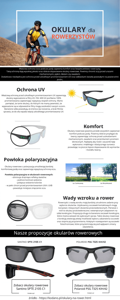 Właściwa ochrona oczu podczas jazdy zapewnia komfort oraz bezpieczeństwo rowerzysty. Taką ochronę dają wysokiej jakości oraz dobrze dopasowane okulary rowerowe. Powinny chronić oczy przed urazami mechanicznymi, pyłem, błotem czy owadami. Dodatkowo niezbędna jest ochrona przed szkodliwym promieniowaniem UV oraz odblaskami światła powstałymi na powierzchni jezdni. Ochrona UV Właściwą ochronę przed szkodliwym promieniowaniem UV zapewniają okulary wyposażone w filtry UV. Filtr 400 UV pochłania 100% promieniowania zapewniając najwyższy stopień ochrony. Warto pamiętać, że tanie okulary, do których nie mamy pewności, że wyposażone są w odpowiednie filtry mogą zaszkodzić naszym oczom. Barwione szkła powodują, że źrenica się rozszerza, a brak filtrów sprawia, że do oka wpada więcej szkodliwego promieniowania UV. Komfort Okulary rowerowe powinny przede wszystkim zapewniać komfort podczas jazdy. Powinny dobrze przylegać do twarzy zapewniając ochronę przed uszkodzeniami mechanicznymi, owadami oraz przenikaniem promieni słonecznych. Najlepiej aby noski i zauszniki były wykonane z miękkiego i elastycznego surowca pozwalając na jeszcze lepsze dopasowanie do wymiarów i kształtu twarzy. Powłoka polaryzacyjna Okulary rowerowe z polaryzacją umożliwiają bardziej komfortową jazdę oraz zapewniają najwyższą ochronę oczu. Powłoka polaryzacyjna w okularach rowerowych: - eliminuje drażniące refleksy świetlne - podnosi kontrast widzenia - polepsza widzenie kolorów - w pełni chroni przed promieniowaniem UVA i UVB - powoduje mniejsze zmęczenie oczu Wady wzroku a rower Rowerzyści z wadą wzroku mają bardziej utrudnione zadanie przy wyborze okularów. Użytkownicy soczewek kontaktowych mogą korzystać z klasycznych okularów przeciwsłonecznych. Pierwsze z nich to okulary przeciwsłoneczne z wewnętrznym adapterem na szkła korekcyjne. Propozycja druga to barwione soczewki korekcyjne, które można wstawić do wybranych opraw. Takie okulary rowerowe z korekcją otwierają wtedy możliwość wyboru zabarwienia soczewki oraz stopnia jej przyciemnienia. Kolejnym rozwiązaniem są soczewki fotochromowe, które przyciemniają się pod wpływem zmiany oświetlenia. Nasze propozycje okularów rowerowych Zobacz okulary rowerowe Santino SPTE 2105 C1 Zobacz okulary rowerowe Polaroid PSG 7325 KIH/42 Kodano.pl Kodano.pl źródło - https://kodano.pl/okulary-na-rower.html