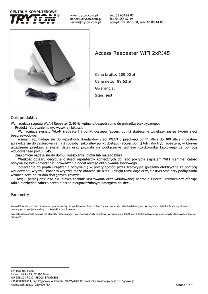www.tryton.com.pl [email protected] [email protected] tel. 56 658 62 00 fax 56 658 62 19 pon-pt: 10.00-18.00, sob: 10.00-14.00 Access Reapeater WiFi 2xRJ45 Cena brutto: 109,00 zł Cena netto: 88,62 zł Gwarancja: Stan: jest Opis produktu: Wzmacniacz sygnału WLAN Repeater 2,4GHz wpinany bezpośrednio do gniazdka elektrycznego. Produkt fabrycznie nowy, wysokiej jakości. Wzmacniacz sygnału WLAN (repeater) i punkt dostępu (access point) skutecznie zwiększy zasięg twojej sieci bezprzewodowej. Wzmacniacz nadaje się do wszystkich standardów sieci WLAN o prędkości od 11 Mb/s do 300 Mb/s i idealnie sprawdza się do zastosowania na 2 sposoby: jako silny punkt dostępu (access point) lub jako tryb repeatera, w którym urządzenie przekazuje sygnał dalej oraz pozwala na podłączenie jednego użytkownika kablowego za pomocą wbudowanego portu RJ45. Znakomicie nadaje się do domu, mieszkania, bloku lub małego biura. Wielkość obszaru decyduje o ilości repeaterów koniecznych do jego pokrycia sygnałem WIFI niemniej całość odbywa się bez konieczności prowadzenia dodatkowego okablowania sieciowego. Podłączenie do prądu urządzenia odbywa się w prosty sposób przez tradycyjne gniazdko elektryczne za pomocą wbudowanej wtyczki. Ponadto wtyczka może obracać się o 90° i dzięki temu daje dużą elastyczność przy podłączaniu wzmacniacza do trudno dostępnych gniazdek. Dzięki pełnej obsłudze aktualnych technik szyfrowania oraz wbudowanej ochronie Firewall wzmacniacz oferuje także niezbędne zabezpieczenie przed nieupoważnionym dostępem do sieci. Parametry: Mimo dołożenia wszelkich starań nie gwarantujemy, że publikowane dane techniczne nie zawierają uchybień lub błędów. W przypadku jakichkolwiek wątpliwości prosimy przed podjęciem decyzji o kontakt z handlowcem. Przedstawiona oferta cenowa ma charakter informacyjny, nie stanowi oferty handlowej w rozumieniu Art.66 par.1 Kodeksu Cywilnego oraz innych właściwych przepisów prawnych. TRYTON Sp. z o.o. Szosa Lubicka 13, 87-100 Toruń NIP 956-20-37-243, REGON 871526851 KRS 0000006913, Sąd Rejonowy w Toruniu, VII Wydział Gospodarczy Krajowego Rejestru Sądowego kapitał zakładowy: 250 000 PLN Strona 1 z 1