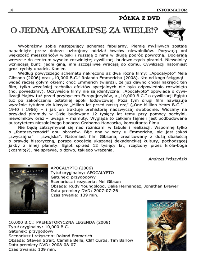 18 INFORMATOR PÓâKA Z DVD O JEDNð APOKALIPSõ ZA WIELE!? WyobraĨmy sobie nastĊpujący schemat fabularny. PlemiĊ myĞliwych zostaje napadniĊte przez dobrze uzbrojony oddziaá áowców niewolników. Porywają oni wiĊkszoĞü mieszkaĔców wioski i ruszają z nimi w dáugą podróĪ powrotną. Docierają wreszcie do centrum wysoko rozwiniĊtej cywilizacji budowniczych piramid. Niewolnicy wzniecają bunt: jedni giną, inni szczĊĞliwie wracają do domu. Cywilizacji natomiast grozi rycháy upadek. Koniec. Wedáug powyĪszego schematu nakrĊcono aĪ dwa róĪne filmy: „Apocalypto” Mela Gibsona (2006) oraz „10,000 B.C.” Rolanda Emmericha (2008). Kto od kogo Ğciągnąá – widaü raczej goáym okiem; choü Emmerich twierdzi, Īe juĪ dawno chciaá nakrĊciü ten film, tylko wczeĞniej technika efektów specjalnych nie byáa odpowiednio rozwiniĊta (no, powiedzmy). OczywiĞcie filmy nie są identyczne: „Apocalypto” opowiada o cywilizacji Majów tuĪ przed przybyciem Europejczyków, a „10,000 B.C.” o cywilizacji Egiptu tuĪ po zakoĔczeniu ostatniej epoki lodowcowej. Poza tym drugi film nawiązuje wyraĨnie tytuáem do klasyka „Milion lat przed naszą erą” („One Million Years B.C.” – 1940 i 1966) – i jak on traktuje prehistoriĊ nadzwyczaj swobodnie. Widzimy na przykáad piramidy w Gizie budowane 12 tysiĊcy lat temu przy pomocy pochylni, niewolników oraz – uwaga – mamuty. Wygląda to caákiem fajnie i jest podbudowane autorytetem niezaleĪnego badacza Grahama Hancocka, konsultanta filmu. Nie bĊdĊ zatrzymywaá siĊ nad róĪnicami w fabule i realizacji. WspomnĊ tylko o „fantastycznoĞci” obu obrazów. Bije ona w oczy u Emmericha, ale jest jakoĞ „zwyczajna” i „swojska”. Natomiast film Gibsona, zrealizowany z duĪą dbaáoĞcią o prawdĊ historyczną, poraĪa obcoĞcią ukazanej dekadenckiej kultury, pochodzącej jakby z innej planety. Egipt sprzed 12 tysiĊcy lat, rządzony przez króla-boga (kosmitĊ?), nie sprawia, o dziwo, takiego wraĪenia. Andrzej PrószyĔski APOCALYPTO (2006) Tytuá oryginalny: APOCALYPTO Gatunek: przygodowy Scenariusz i reĪyseria: Mel Gibson Obsada: Rudy Youngblood, Dalia Hernandez, Jonathan Brewer Data premiery DVD: 2007-07-26 Czas trwania: 139 min. 10,000 B.C.: PREHISTORYCZNA LEGENDA (2008) Tytuá oryginalny: 10,000 B.C. Gatunek: przygodowy Scenariusz i reĪyseria: Roland Emmerich Obsada: Steven Strait, Camilla Belle, Cliff Curtis, Tim Barlow Data premiery DVD: 2008-08-07 Czas trwania: 109 min.