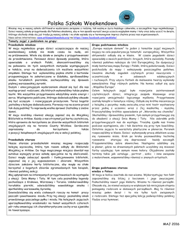 Polska Szkoła Weekendowa Miesiąc maj w naszej szkole obfitował w wydarzenia związane z rodziną, tak ważną w życiu każdego człowieka, a szczególnie tego najmłodszego. Dzieci naszej szkoły przygotowały dla Państwa akademię, aby w ten sposób wyrazić swoje uczucia względem mamy i taty oraz żeby uczcić to święto, którego obchody stały się już tradycją naszej szkoły i na stałe wpisały się w harmonogram imprez chętnie przez nas organizowanych. Nasz adres internetowy: www.arklowpolskaszkola.orgi na https://www.facebook.com/pwskleks/ Tematy zajęć z podziałem na grupy: Przedszkole młodsze W maju najmłodsza grupa dzieci uczęszczająca do naszej weekendowej szkoły nie miała czasu na nudę, ani na próżnowanie. Wiele się działo w związku z przygotowaniami do przedstawienia. Ponieważ dzieci śpiewały piosenkę, która opowiadała o urokach Polski, skoncentrowaliśmy się na pokazaniu im tych wszystkich motywów występujących w tekście, oraz na doświadczeniu ich możliwie wszystkimi zmysłami. Dlatego też wykonaliśmy piękne statki z kartonów przypominające te zakotwiczone w Gdańsku, spróbowaliśmy smaku toruńskich pierników, zachwycaliśmy się śpiewem pięknej warszawskiej syrenki. Dużym i emocjonującym wydarzeniem okazał się być dla nas występ przed rodzicami, dla których wykonaliśmy także piękne laurki. We wszystkie przygotowania włożyliśmy wiele energii i serca. Wystąpienie publiczne, którego doświadczyliśmy okazało się być uczącym i rozwijającym przeżyciem. Teraz bogatsi jesteśmy o kolejne doświadczenia. Pierwszy raz na scenie przed tak dużą publiką! To naprawdę wielka sprawa! Jesteśmy z siebie dumni. W maju mieliśmy również okazję zapisać się do Miejskiej Biblioteki w Arklow. Każdy z nas otrzymał już kartę czytelniczą, która uprawnia do korzystania ze zbiorów wszystkich bibliotek znajdujących się na terenie County Wicklow. Serdecznie zapraszamy do korzystania także z pozycji książkowych znajdujących się w sekcji polskiej. Przedszkole starsze Nasze starsze przedszkolaki miesiąc majowy rozpoczęły kolejną wycieczką, którą tym razem odbyły do Biblioteki Miejskiej w Arklow. Do tego magicznego miejsca dowiózł nas autobus wynajęty przez szkołę specjalnie na tę okoliczność. Dzieci mogły zobaczyć sposób i funkcjonowanie biblioteki, zapoznać się z jej wyposażeniem i zbiorami. Wszystkim dzieciom założono karty biblioteczne, aby mogły na stałe korzystać z bogatych zbiorów zgromadzonych tam książek, również polskiej sekcji. Maj upłynął nam na intensywnych przygotowaniach do występów z okazji Dnia Mamy i Taty. W tym celu poznaliśmy legendy pochodzące z Krakowa, Warszawy i Torunia. Udekorowaliśmy toruńskie pierniki, odwiedziliśmy wawelskiego smoka i spotkaliśmy warszawską Syrenkę. Dowiedzieliśmy się wielu ciekawych rzeczy na temat pracy pszczół i powstawania miodu. Przy tej okazji poznaliśmy smak prawdziwego pszczelego pyłku i miodu. Na kolejnych zajęciach uporządkowaliśmy wiadomości na temat wszystkich czterech pór roku omawiając ich charakterystyczne cechy oraz zjawiska im towarzyszące. Grupa podstawowa młodsza „Europa naszym domem” to jeden z tematów zajęć majowych mający na celu popularyzację tematyki europejskiej. Wszystkie aktywności odbyły się w klasie. W czasie pogadanki dzieci opowiadały o swoich podróżach i krajach, które zwiedziły. Poznały również państwa należące do Unii Europejskiej. Do dyspozycji miały konturową mapę Europy i Polski, którą pokolorowały. Dzieci podchodziły do mapy i wskazywały poszczególne państwa. Uważnie słuchały zagadek czytanych przez nauczyciela i uczestniczyły w zabawach edukacyjnych i ruchowych. Przy użyciu farbek do malowania twarzy wykonały samodzielnie flagi różnych państw. Na koniec odbył się quiz „Wspólna Europa”. Celem kolejnych zajęć było rozwijanie zainteresowań czytelniczych dzieci, integracja zespołu klasowego oraz rozwijanie umiejętności logicznego myślenia. Przygotowane zostały książki o tematyce różnej. Odbyła się krótka inscenizacja z książką z pacynką- małą owieczką oraz mini teatr wystawiony przez jedną z uczennic wraz z Jej maskotką - myszką. Przeczytaliśmy krótkie opowiadanie pt „Weronika ma chomika”. Słuchaliśmy i śpiewaliśmy piosenki, tym samym przygotowując się do akademii z okazji Dnia Mamy i Taty. Nie zabrakło prób przygotowujących nas do występu. Troszkę zjadła nas trema podczas wystąpienia, ale i tak świetnie się przy tym bawiliśmy. Ostatnie zajęcia to warsztaty plastyczne w plenerze. Poranek rozpoczęliśmy w klasie. Dzieci wykonywały pracę ołówkiem ucząc się rysowania misia. Krok po kroku poznawaliśmy technikę rysowania starając się dopracować każdy szczegół. Przypomnieliśmy sobie słownictwo. Następnie udaliśmy się w plener, gdzie na drewnianych paletach uczyliśmy się mieszać farby uzyskując tym samym nowe kolory. Objaśnione zostały terminy takie jak: sztaluga , portret , szkic i inne związane z malarstwem, wspomnieliśmy również o znanych artystach. Grupa podstawowa starsza wiedza o Polsce W maju w końcu zawitała do nas wiosna. Wykorzystując ten fakt zapoznaliśmy się bliżej z bocianem i jego zwyczajami. Posłuchaliśmy nawet jego klekotu. Wiosna to również porządki. Okazało się, że niemal wszyscy w większym lub mniejszym stopniu pomagamy rodzicom w domowych porządkach. Maj to również miesiąc pełen świąt i to nie tylko tych związanych z rodzicami. Dlatego też specjalną lekcję poświęciliśmy polskiej fladze oraz hymnowi. MAJ 2016 Polska Szkoła Weekendowa Grupa zaawansowana język polski W maju najstarsza grupa rozmawiała o poezji. Wprowadziliśmy pojęcia poezja, proza. Uczniowie uczyli się o tym jak zbudowany jest wiersz, dowiedzieli się co to wers, zwrotka, czym jest rym. Następnie wykonaliśmy szereg ćwiczeń poszukując rym