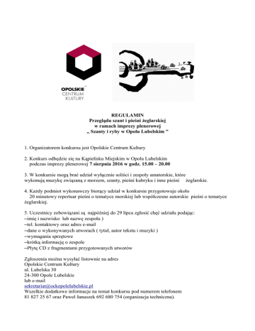 REGULAMIN Przeglądu szant i pieśni żeglarskiej w ramach imprezy plenerowej „ Szanty i ryby w Opolu Lubelskim ” 1. Organizatorem konkursu jest Opolskie Centrum Kultury 2. Konkurs odbędzie się na Kąpielisku Miejskim w Opolu Lubelskim podczas imprezy plenerowej 7 sierpnia 2016 w godz. 15.00 – 20.00 3. W konkursie mogą brać udział wyłącznie soliści i zespoły amatorskie, które wykonują muzykę związaną z morzem, szanty, pieśni kubryku i inne pieśni żeglarskie. 4. Każdy podmiot wykonawczy biorący udział w konkursie przygotowuje około 20 minutowy repertuar pieśni o tematyce morskiej lub współczesne autorskie pieśni o tematyce żeglarskiej. 5. Uczestnicy zobowiązani są najpóźniej do 29 lipca zgłosić chęć udziału podając: –imię i nazwisko lub nazwę zespołu ) –tel. kontaktowy oraz adres e-mail –dane o wykonywanych utworach ( tytuł, autor tekstu i muzyki ) –wymagania sprzętowe –krótką informację o zespole –Płytę CD z fragmentami przygotowanych utworów Zgłoszenia można wysyłać listownie na adres Opolskie Centrum Kultury ul. Lubelska 30 24-300 Opole Lubelskie lub e-mail [email protected] Wszelkie dodatkowe informacje na temat konkursu pod numerem telefonem 81 827 25 67 oraz Paweł Januszek 692 680 754 (organizacja techniczna). Organizator nie zapewnia uczestnikom konkursu noclegów. W przypadku nocowania przez uczestników konkursu we własnym zakresie w namiotach, organizator zapewnia darmowe miejsce przeznaczone do rozbicia namiotów oraz bezpłatne korzystanie z sanitariatów podczas festiwalu. 6. Organizator zastrzega sobie prawo dowolnego doboru uczestników konkursu w dowolnej liczbie spośród nadesłanych zgłoszeń bez podania przyczyny. Organizator zastrzega sobie prawo odwołania konkursu z przyczyn losowych takich jak np. klęska żywiołowa, pożar, powódź, niesprzyjające warunki pogodowe, żałoba narodowa lub lokalna, awaria głównego zasilania elektrycznego itp. 7. Kolejność występów w konkursie będzie ustalona przez Organizatora. Organizator powołuje niezawisłe Jury, które będzie decydować o uzyskaniu miejsc w konkursie i przyznaniu nagród. Ogłoszenie wyników konkursu nastąpi tego samego dnia przed koncertem głównym. 8. Organizator przewiduje nagrodę publiczności 9. Każdy z uczestników otrzyma dyplom uczestnictwa, a zwycięzcy nagrody rzeczowe PRZEGLĄD SZANT I PIEŚNI ŻEGLARSKIEJ „ Szanty i ryby w Opolu Lubelskim” 7 sierpnia 2016 KARTA ZGŁOSZENIA 1.Imię i nazwisko wykonawcy ( nazwa zespołu ) …......................................................................................................................... 2. Kontakt telefoniczny i e-mail ….......................................................................................................................... 3. Repertuar ( tytuł, autor tekstu, kompozytor ) …......................................................................................................................... …......................................................................................................................... ….......................................................................................................................... …......................................................................................................................... 4. Rodzaj akompaniamentu ( wymagania techniczne ) ….......................................................................................................................... ….......................................................................................................................... …................................................. ( podpis uczestnika lub opiekuna ) •W przypadku zespołu proszę wpisać wszystkich członków zespołu – imię, nazwisko Wyrażam zgodę na przetwarzanie danych osobowych wykonawcy w celu przeprowadzenia Konkursu szant i pieśni żeglarskiej w Opolu Lubelskim zgodnie z Ustawą z dnia 29 sierpnia 1997 r. o ochronie danych osobowych ( tekst jedn. Dz. U. Z 2014 r. poz.1182 ) …................................................................ ( podpis wykonawcy lub rodzica/opiekuna ) Wyrażam zgodę na bezpłatne wykorzystanie wizerunku ( zdjęcia, filmy ) z Konkursu szant i pieśni żeglarskiej w Opolu Lubelskim przez Opolskie Centrum Kultury ( m.in. w prasie, na stronie internetowej, tablicach informacyjnych ) zgodnie z Ustawą z r. nr 90 poz. 631 z późn. zm.). …................................................................. ( podpis wykonawcy lub rodzica/opiekuna)