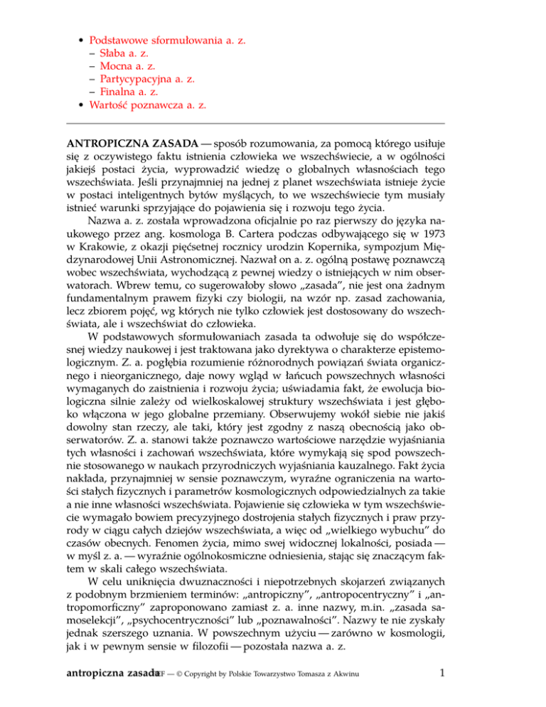 • Podstawowe sformułowania a. z. – Słaba a. z. – Mocna a. z. – Partycypacyjna a. z. – Finalna a. z. • Wartość poznawcza a. z. ANTROPICZNA ZASADA — sposób rozumowania, za pomocą którego usiłuje się z oczywistego faktu istnienia człowieka we wszechświecie, a w ogólności jakiejś postaci życia, wyprowadzić wiedzę o globalnych własnościach tego wszechświata. Jeśli przynajmniej na jednej z planet wszechświata istnieje życie w postaci inteligentnych bytów myślących, to we wszechświecie tym musiały istnieć warunki sprzyjające do pojawienia się i rozwoju tego życia. Nazwa a. z. została wprowadzona oficjalnie po raz pierwszy do języka naukowego przez ang. kosmologa B. Cartera podczas odbywającego się w 1973 w Krakowie, z okazji pięćsetnej rocznicy urodzin Kopernika, sympozjum Międzynarodowej Unii Astronomicznej. Nazwał on a. z. ogólną postawę poznawczą wobec wszechświata, wychodzącą z pewnej wiedzy o istniejących w nim obserwatorach. Wbrew temu, co sugerowałoby słowo „zasada”, nie jest ona żadnym fundamentalnym prawem fizyki czy biologii, na wzór np. zasad zachowania, lecz zbiorem pojęć, wg których nie tylko człowiek jest dostosowany do wszechświata, ale i wszechświat do człowieka. W podstawowych sformułowaniach zasada ta odwołuje się do współczesnej wiedzy naukowej i jest traktowana jako dyrektywa o charakterze epistemologicznym. Z. a. pogłębia rozumienie różnorodnych powiązań świata organicznego i nieorganicznego, daje nowy wgląd w łańcuch powszechnych własności wymaganych do zaistnienia i rozwoju życia; uświadamia fakt, że ewolucja biologiczna silnie zależy od wielkoskalowej struktury wszechświata i jest głęboko włączona w jego globalne przemiany. Obserwujemy wokół siebie nie jakiś dowolny stan rzeczy, ale taki, który jest zgodny z naszą obecnością jako obserwatorów. Z. a. stanowi także poznawczo wartościowe narzędzie wyjaśniania tych własności i zachowań wszechświata, które wymykają się spod powszechnie stosowanego w naukach przyrodniczych wyjaśniania kauzalnego. Fakt życia nakłada, przynajmniej w sensie poznawczym, wyraźne ograniczenia na wartości stałych fizycznych i parametrów kosmologicznych odpowiedzialnych za takie a nie inne własności wszechświata. Pojawienie się człowieka w tym wszechświecie wymagało bowiem precyzyjnego dostrojenia stałych fizycznych i praw przyrody w ciągu całych dziejów wszechświata, a więc od „wielkiego wybuchu” do czasów obecnych. Fenomen życia, mimo swej widocznej lokalności, posiada — w myśl z. a. — wyraźnie ogólnokosmiczne odniesienia, stając się znaczącym faktem w skali całego wszechświata. W celu uniknięcia dwuznaczności i niepotrzebnych skojarzeń związanych z podobnym brzmieniem terminów: „antropiczny”, „antropocentryczny” i „antropomorficzny” zaproponowano zamiast z. a. inne nazwy, m.in. „zasada samoselekcji”, „psychocentryczności” lub „poznawalności”. Nazwy te nie zyskały jednak szerszego uznania. W powszechnym użyciu — zarówno w kosmologii, jak i w pewnym sensie w filozofii — pozostała nazwa a. z. antropiczna zasada PEF — © Copyright by Polskie Towarzystwo Tomasza z Akwinu 1 Podstawowe sformułowania a. z. W zależności od charakteru i rodzajów powiązań życia biologicznego z własnościami wszechświata jako całości, zaproponowano różne sformułowania z. a.: Carter — tzw. słabą i mocną wersję z. a., J. A. Wheeler — tzw. partycypacyjną zasadę, F. J. Tipler — zasadę finalną. S ł a b a a. z. Najbardziej znane sformułowania słabej z. a. podane zostały przez: a) B. Cartera: „Nie twierdzimy, że wszechświat nie istniałby, gdyby nas nie było, lecz twierdzimy tylko, że skoro jesteśmy i możemy prowadzić obserwacje, to wszechświat musi być taki jaki jest”; b) J. Barrowa: „Obserwowane wartości zmieniających się w czasie wielkości fizycznych nie są dowolne, ale przybierają wartości V(x, t) wyznaczone przez warunek przestrzenny taki, że (x ∈ L), gdzie L oznacza zbiór miejsc, w którym może rozwijać się życie, oraz przez warunek ograniczający czas t do okresu biologicznej i kosmologicznej ewolucji organizmów żywych i środowiska podtrzymującego życie”; c) J. Barrowa i F. Tiplera: „obserwowane wartości wszystkich fizycznych i kosmologicznych wielkości nie są w równym stopniu prawdopodobne, lecz są wyznaczone takimi własnościami wszechświata, dzięki którym oparte na węglu życie może ewoluować, a wszechświat jest wystarczająco stary, by taka ewolucja mogła mieć miejsce”. Wspólną cechą wszystkich tych sformułowań jest to, że stwierdzają, iż własności wszechświata, które a priori jawią się jako zadziwiająco nieprawdopodobne, mogą być zrozumiane tylko z punktu widzenia obecności w tym wszechświecie świadomych obserwatorów. Słaba wersja z. a. nie stwierdza nic ponad to, o czym mówią dane obserwacyjne. Dane te pokazują zaś, że we wszechświecie istnieją pewne subtelne dostrojenia, bez których życie w ogóle nie mogłoby zaistnieć i rozwijać się. Dostrojenia te jawią się głównie jako warunki konieczne do zaistnienia tego życia. W konsekwencji słaba wersja z. a. nie wyjaśnia bezwzględnych wartości liczbowych, stałych fizycznych lub ich kombinacji, ani nie podaje oryginalnych przewidywań dotyczących globalnej ewolucji wszechświata lub jego lokalnych struktur. Z tej racji naraża się na zarzut tautologii i braku znaczącej wartości poznawczej, wnoszonej do naszej wiedzy o wszechświecie. Mimo to większość uczonych przypisuje jej ważną rolę w odsłanianiu szerokiego zakresu istniejących w przyrodzie powiązań i wzajemnych uwarunkowań, pozwalających m.in. na włączenie ewolucji biologicznej w ogólne przemiany całego wszechświata. Przypisuje jej również pewną rolę wyjaśniającą w odniesieniu do własności wszechświata i zachodzącyc