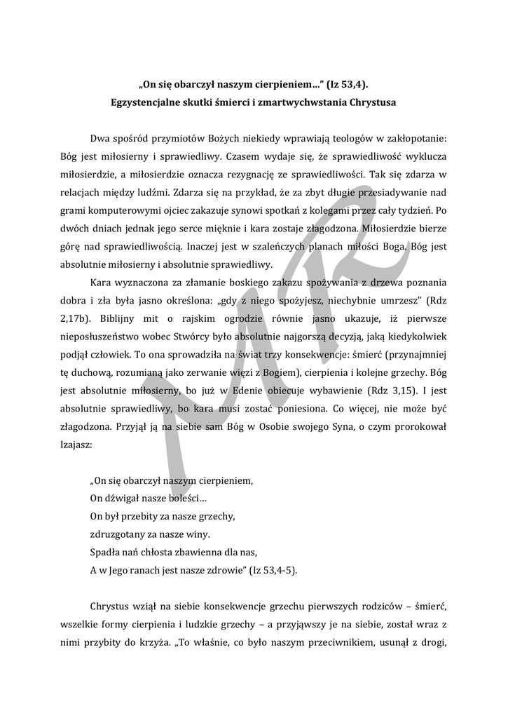 „On się obarczył naszym cierpieniem…” (Iz 53,4). Egzystencjalne skutki śmierci i zmartwychwstania Chrystusa Dwa spośród przymiotów Bożych niekiedy wprawiają teologów w zakłopotanie: Bóg jest miłosierny i sprawiedliwy. Czasem wydaje się, że sprawiedliwość wyklucza miłosierdzie, a miłosierdzie oznacza rezygnację ze sprawiedliwości. Tak się zdarza w relacjach między ludźmi. Zdarza się na przykład, że za zbyt długie przesiadywanie nad grami komputerowymi ojciec zakazuje synowi spotkań z kolegami przez cały tydzień. Po dwóch dniach jednak jego serce mięknie i kara zostaje złagodzona. Miłosierdzie bierze górę nad sprawiedliwością. Inaczej jest w szaleńczych planach miłości Boga. Bóg jest absolutnie miłosierny i absolutnie sprawiedliwy. Kara wyznaczona za złamanie boskiego zakazu spożywania z drzewa poznania dobra i zła była jasno określona: „gdy z niego spożyjesz, niechybnie umrzesz” (Rdz 2,17b). Biblijny mit o rajskim ogrodzie równie jasno ukazuje, iż pierwsze nieposłuszeństwo wobec Stwórcy było absolutnie najgorszą decyzją, jaką kiedykolwiek podjął człowiek. To ona sprowadziła na świat trzy konsekwencje: śmierć (przynajmniej tę duchową, rozumianą jako zerwanie więzi z Bogiem), cierpienia i kolejne grzechy. Bóg jest absolutnie miłosierny, bo już w Edenie obiecuje wybawienie (Rdz 3,15). I jest absolutnie sprawiedliwy, bo kara musi zostać poniesiona. Co więcej, nie może być złagodzona. Przyjął ją na siebie sam Bóg w Osobie swojego Syna, o czym prorokował Izajasz: „On się obarczył naszym cierpieniem, On dźwigał nasze boleści… On był przebity za nasze grzechy, zdruzgotany za nasze winy. Spadła nań chłosta zbawienna dla nas, A w Jego ranach jest nasze zdrowie” (Iz 53,4-‐5). Chrystus wziął na siebie konsekwencje grzechu pierwszych rodziców – śmierć, wszelkie formy cierpienia i ludzkie grzechy – a przyjąwszy je na siebie, został wraz z nimi przybity do krzyża. „To właśnie, co było naszym przeciwnikiem, usunął z drogi, przygwoździwszy do krzyża” (Kol 2,14). W niedzielny poranek Chrystus opuścił grób, natomiast konsekwencje grzechu pierwszych rodziców pozostają nadal „ukrzyżowane”. Oto niezwykłe dzieło odkupienia, dostępne dla każdego, kto wierzy w Jezusa. Co wynika z faktu, że Chrystus obarczył się naszym cierpieniem? Jakie są egzystencjalne skutki Jego śmierci i zmartwychwstania? Czy ta śmierć rzeczywiście rozwiązuje problem cierpienia? Jak widzieć z jej perspektywy ludzkie choroby? Niniejszy esej to garść refleksji, która jest próbą poszukiwania odpowiedzi na tak postawione pytania. Próbą, która – mamy nadzieję – może okazać się przysłowiowym „kijem w mrowisku”. „On był przebity za nasze grzechy” -‐ z wyżyn błogosławieństwa w dolinę przekleństwa Przed wejściem do Ziemi Obiecanej, wędrujący przez pustynię Izraelici otrzymali od Boga za pośrednictwem Mojżesza prostą zasadę postępowania, którą niektórzy egzegeci nazwali „prawem dwóch dróg”. Została ona zapisana w tradycji deuteronomistycznej w następującym ujęciu: „Patrz! Kładę dziś przed tobą życie i szczęście, śmierć i nieszczęście. Ja dziś nakazuję ci miłować Pana, Boga twego, i chodzić Jego drogami, pełniąc Jego polecenia, prawa i nakazy, abyś żył i mnożył się, a Pan, Bóg twój, będzie ci błogosławił w kraju, który idziesz posiąść. Ale jeśli swe serce odwrócisz, nie usłuchasz, zbłądzisz i będziesz oddawał pokłon obcym bogom, służąc im -‐ oświadczam wam dzisiaj, że na pewno zginiecie, niedługo zabawicie na ziemi, którą idziecie posiąść, po przejściu Jordanu” (Pwt 30,15-‐18). Przesłanie tego Bożego oświadczenia w pierwotnych formach religijności Izraela było niezwykle proste: kto zachowa Boże przykazania, ten osiągnie szczęście, którego wyrazem będzie Boże błogosławieństwo; kto zaś przekroczy Boże przepisy, ten naraża się na cierpienie i śmierć. Szybko stało się jasne dla samych Izraelitów, że wszyscy znaleźli się na drodze przekleństwa. „Nie ma sprawiedliwego ani nawet jednego” (Rz 3,10), „wszyscy bowiem zgrzeszyli i pozbawieni są chwały Bożej” (Rz 3,24). Co w takim wypadku czyni Bóg w Osobie swego Syna? Sam schodzi na drogę przekleństwa, by ponieść karę zamiast ludzi. Kenoza rozumiana jako uniżenie Syna Bożego, który istniał w preegzystencji na równi z Bogiem, stała się kluczem Pawłowego opisu dzieła odkupienia, skierowanego do mieszkańców Filippi. Apostoł stwierdza najpierw, że Chrystus istniał w postaci Bożej, lecz nie skorzystał ze sposobności, aby na równi być z Bogiem, lecz stał się człowiekiem (Flp 2,6-‐7). Własną decyzją z drogi błogosławieństwa przeszedł na drogę przekleństwa, na którą poprzez przekroczenia Prawa wkroczył każdy człowiek. Jezus stał się w pełni człowiekiem, doświadczając śmierci krzyżowej. Bóg jednak nie pozostawił Go w stanie śmierci, lecz wywyższył Go ponad wszelkie rodzaje istot duchowych, „aby na imię Jezusa zgięło się każde kolano istot niebieskich i ziemskich, i podziemnych” (Flp 2,10)1. W ten sposób Chrystus powrócił na drogę błogosławieństwa, a kara za ludzki grzech została odpokutowana. Bóg okazał się w pełni miłosierny, bo otworzył drogę zbawienia. Okazał się absolutnie sprawiedliwy, bo kara za grzech została poniesiona w całej surowości. „Spadła Nań chłosta zbawienna dla nas” – co wynika dla mnie z tego faktu? Poprzez to, iż Bóg okazał się absolutnie miłosierny i w pełni sprawiedliwy, gdy Jezus Chrystus poniósł karę za nasze grzechy – otworzył drogę do zbawienia dla każdego, kto w Niego uwierzy. Dzieło odkupienia dokonane przez Jezusa ma charakter obiektywny: dokonało się i jest faktem. Jednak przyjęcie tego dzieła domaga się osobistej decyzji wiary w Chrystusa; tylko dla tego jest ono skuteczn