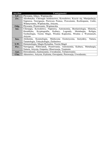Atrybut Umiejętności Pływanie, Siłacz, Wspinaczka S.F. Akrobatyka, Chirurgia Jeździectwo, Kowalstwo, Krycie się, Manipulacja, Zw. Naprawa, Nawigacja, Pierwsza Pomoc, Powożenie, Rozbrajanie, Uniki, Włamywanie, Wspinaczka, Artyzm, Pływanie, Przetrwanie, Wspinaczka Odp. Chirurgia, Kowalstwo, Naprawa, Astronomia, Bestiariologia, Historia, Int. Heraldyka, Kryptografia, Kultury, Legendy, Metalurgia, Religia, Technologia, Teoria Magii, Wiedza Kupiecka, Wiedza o Wymiarach, Artyzm Alchemia, Kosmologia, Medycyna Ezoteryczna, Instynkty, Natura, Inu. Tanatologia, Toksykologia, Zielarstwo Demonologia, Magia Rytualna, Teoria Magii S.W. Nawigacja, Półświatek, Przetrwanie, Astronomia, Kultury, Metalurgia, Per. Natura, Artyzm, Empatia, Obserwacja, Tropienie Dowodzenie, Zastraszanie, Uwodzenie, Torturowanie; Aut. Aktorstwo, Artyzm, Etykieta, Oswajanie, Perswazja, Uwodzenie; Cha.