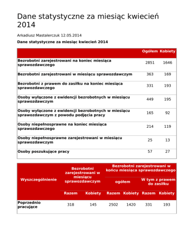 Dane statystyczne za miesiąc kwiecień 2014 Arkadiusz Mastalerczuk 12.05.2014 Dane statystyczne za miesiąc kwiecień 2014 Ogółem Kobiety Bezrobotni zarejestrowani na koniec miesiąca sprawozdawczego 2851 1646 Bezrobotni zarejestrowani w miesiącu sprawozdawczym 363 169 Bezrobotni z prawem do zasiłku na koniec miesiąca sprawozdawczego 331 193 Osoby wyłączone z ewidencji bezrobotnych w miesiącu sprawozdawczym 449 195 Osoby wyłączone z ewidencji bezrobotnych w miesiącu sprawozdawczym z powodu podjęcia pracy 165 92 Osoby niepełnosprawne na koniec miesiąca sprawozdawczego 214 119 Osoby niepełnosprawne zarejestrowani w miesiącu sprawozdawczym 25 13 Osoby poszukujące pracy 57 27 Wyszczególnienie Poprzednio pracujące Bezrobotni zarejestrowani w miesiącu sprawozdawczym Razem Kobiety 318 145 Bezrobotni zarejestrowani w końcu miesiąca sprawozdawczego ogółem W tym z prawem do zasiłku Razem Kobiety Razem Kobiety 2502 1420 331 193 Z tego zwolnione z przyczyn zakładu pracy 17 10 235 159 102 Dotychczas niepracujące 45 24 349 226 0 64 0 W tym osoby będące w szczególnej sytuacji na rynku pracy: Do 25 roku życia Powyżej 50 roku życia Długotrwale bezrobotni Ogółem Kobiety Ogółem Kobiety Ogółem Kobiety Bezrobotni na koniec miesiąca sprawozdawczego 418 235 686 350 1334 846 89 45 56 26 125 69 Osoby wyłączone z ewidencji bezrobotnych w miesiącu sprawozdawczym 127 49 66 24 124 57 Osoby wyłączone z ewidencji bezrobotnych w miesiącu sprawozdawczym z powodu podjęcia pracy 35 18 18 6 37 16 Bezrobotni zarejestrowani w miesiącu sprawozdawczym Stopa bezrobocia w kraju w województwie i w mieście Mysłowice na podstawie danych z Głównego Urzędu Statystycznego Kraj Śląsk Mysłowice Stopa bezrobocia (%) 13 10,9 9,7