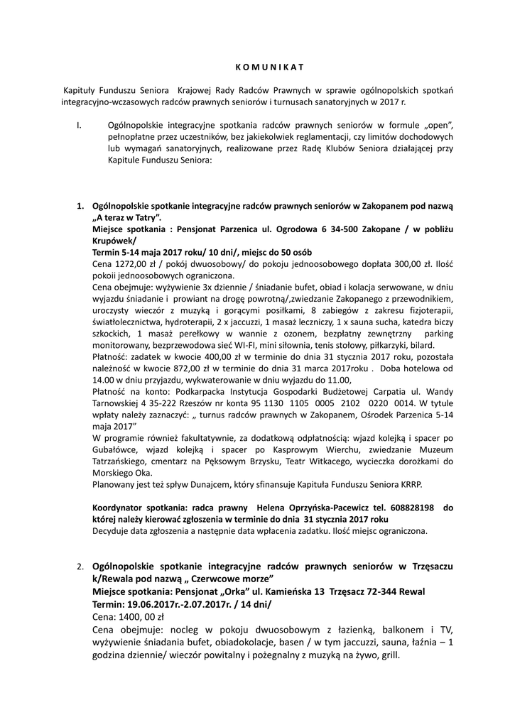 KOMUNIKAT Kapituły Funduszu Seniora Krajowej Rady Radców Prawnych w sprawie ogólnopolskich spotkań integracyjno-wczasowych radców prawnych seniorów i turnusach sanatoryjnych w 2017 r. I. Ogólnopolskie integracyjne spotkania radców prawnych seniorów w formule „open”, pełnopłatne przez uczestników, bez jakiekolwiek reglamentacji, czy limitów dochodowych lub wymagań sanatoryjnych, realizowane przez Radę Klubów Seniora działającej przy Kapitule Funduszu Seniora: 1. Ogólnopolskie spotkanie integracyjne radców prawnych seniorów w Zakopanem pod nazwą „A teraz w Tatry”. Miejsce spotkania : Pensjonat Parzenica ul. Ogrodowa 6 34-500 Zakopane / w pobliżu Krupówek/ Termin 5-14 maja 2017 roku/ 10 dni/, miejsc do 50 osób Cena 1272,00 zł / pokój dwuosobowy/ do pokoju jednoosobowego dopłata 300,00 zł. Ilość pokoii jednoosobowych ograniczona. Cena obejmuje: wyżywienie 3x dziennie / śniadanie bufet, obiad i kolacja serwowane, w dniu wyjazdu śniadanie i prowiant na drogę powrotną/,zwiedzanie Zakopanego z przewodnikiem, uroczysty wieczór z muzyką i gorącymi posiłkami, 8 zabiegów z zakresu fizjoterapii, światłolecznictwa, hydroterapii, 2 x jaccuzzi, 1 masaż leczniczy, 1 x sauna sucha, katedra biczy szkockich, 1 masaż perełkowy w wannie z ozonem, bezpłatny zewnętrzny parking monitorowany, bezprzewodowa sieć WI-FI, mini siłownia, tenis stołowy, piłkarzyki, bilard. Płatność: zadatek w kwocie 400,00 zł w terminie do dnia 31 stycznia 2017 roku, pozostała należność w kwocie 872,00 zł w terminie do dnia 31 marca 2017roku . Doba hotelowa od 14.00 w dniu przyjazdu, wykwaterowanie w dniu wyjazdu do 11.00, Płatność na konto: Podkarpacka Instytucja Gospodarki Budżetowej Carpatia ul. Wandy Tarnowskiej 4 35-222 Rzeszów nr konta 95 1130 1105 0005 2102 0220 0014. W tytule wpłaty należy zaznaczyć: „ turnus radców prawnych w Zakopanem, Ośrodek Parzenica 5-14 maja 2017” W programie również fakultatywnie, za dodatkową odpłatnością: wjazd kolejką i spacer po Gubałówce, wjazd kolejką i spacer po Kasprowym Wierchu, zwiedzanie Muzeum Tatrzańskiego, cmentarz na Pęksowym Brzysku, Teatr Witkacego, wycieczka dorożkami do Morskiego Oka. Planowany jest też spływ Dunajcem, który sfinansuje Kapituła Funduszu Seniora KRRP. Koordynator spotkania: radca prawny Helena Oprzyńska-Pacewicz tel. 608828198 do której należy kierować zgłoszenia w terminie do dnia 31 stycznia 2017 roku Decyduje data zgłoszenia a następnie data wpłacenia zadatku. Ilość miejsc ograniczona. 2. Ogólnopolskie spotkanie integracyjne radców prawnych seniorów w Trzęsaczu k/Rewala pod nazwą „ Czerwcowe morze” Miejsce spotkania: Pensjonat „Orka” ul. Kamieńska 13 Trzęsacz 72-344 Rewal Termin: 19.06.2017r.-2.07.2017r. / 14 dni/ Cena: 1400, 00 zł Cena obejmuje: nocleg w pokoju dwuosobowym z łazienką, balkonem i TV, wyżywienie śniadania bufet, obiadokolacje, basen / w tym jaccuzzi, sauna, łaźnia – 1 godzina dziennie/ wieczór powitalny i pożegnalny z muzyką na żywo, grill. W pensjonacie jest winda. Parking bezpłatny, odległość do morza ca 50 m, do miejscowości Rewal 1 km. Doba hotelowa od 14.00 w dniu przyjazdu, wykwaterowanie w dniu wyjazdu do 10.00, Płatność: zadatek w kwocie 400, 00 zł od osoby w terminie do dnia 28 lutego 2017 roku, pozostała należność w terminie do dnia 31 maja 2017 roku na konto Pensjonat Orka ul. Kamieńska 13 Trzęsacz 72-344 Rewal nr konta 86 9376 0001 3002 0015 2145 0001 z dopiskiem:” turnus radców prawnych od 19.06.17do 2.07.17.” Fakultatywnie jest zwiedzanie okolic, Gosań, Międzyzdroje, Szczecin. Kapituła Funduszu Seniora KRRP sfinansuje wycieczkę do Szczecina Koordynator spotkania: radca prawny Helena Oprzyńska-Pacewicz tel. 608828198 , do której należy kierować zgłoszenia w terminie do dnia 28 lutego 2017 roku Decyduje data zgłoszenia i wpłacenia zadatku. Ilość miejsc ograniczona 3. Ogólnopolskie spotkanie integracyjne radców prawnych seniorów pod nazwą „ Poznań i okolice” Miejsce spotkania Hotel Ikar w Poznaniu. ul. Kościuszki 118 / blisko centrum/ Termin spotkania: 19-23.07.2017r. / 5 dni/ Cena:680,00 zł plus bilety wstępu do zwiedzanych obiektów 52,00 zł Cena obejmuje: nocleg w pokojach dwuosobowych w Hotelu Ikar w Poznaniu, wyżywienie śniadanie, obiadokolacja, zwiedzanie: Poznań, Kórnik, Biskupin, Gniezno, Rogalin. Planowane jest spotkanie z radcami prawnymi seniorami w Klubie OIRP Poznań, fakultatywnie spektakl w Teatrze w Poznaniu / nazwa teatru, spektaklu, cena biletu oraz termin wpłaty na bilet, zostanie podana, dla zainteresowanych, w terminie późniejszym/ Wpłaty należności: zaliczka w kwocie 210,00 zł w terminie do dnia 30 marca 2017 roku na konto Biuro Podróży Juwentur ul. Ślusarska 15 61-778 Poznań numer konta 40 1500 1621 1216 2004 3935 0000 Pozostała należność w kwocie 522,00 zł w terminie do dnia 15 czerwca 2017 roku na wskazane wyżej konto W tytule wpłaty należy wpisać: „wycieczka radców prawnych 19.07-23.07.2017r.” Koordynator spotkania: radca prawny Helena Oprzyńska-Pacewicz tel.608828198, do której należy kierować zgłoszenia w terminie do dnia 15 marca 2017 roku Ilość miejsc ograniczona, decyduje data zgłoszenia i wpłaty zaliczki Kapituła Funduszu Seniora KRRP sfinansuje koszty autokaru, przewodnika i pilota. 4. Ogólnopolskie spotkanie integracyjne radców prawnych seniorów pod nazwą „Długopole” Miejsce spotkania: Uzdrowisko Długopole S.A. ul.Wolności 4 57-540 Lądek-Zdrój Termin: 24.08-08.09.2017r. /15 dni/ Cena 1547,00 zł Cena obejmuje: noclegi w pokojach dwuosobowych w budynku „Józef”, gdzie znajduje się kompleksowa baza zabiegowa, jadalnia, kawiarnia, winda, basen termalny, internet bezprzewodowy, wyżywienie: śniadanie, obiad, kolacja, 20 zabiegów leczniczych wg wskazań lekarza, całodobowa opieka pielęgniarska i lekarska w razie potrzeby, kąpiel w basenie termalnym w Zdroju „Wojciech