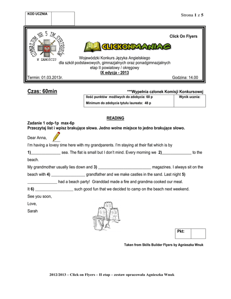 KOD UCZNIA Strona 1 z 5 Click On Flyers Wojewódzki Konkurs Języka Angielskiego dla szkół podstawowych, gimnazjalnych oraz ponadgimnazjalnych etap II powiatowy / okręgowy IX edycja - 2013 Termin: 01.03.2013r. Godzina: 14.00 Czas: 60min ***Wypełnia członek Komisji Konkursowej Ilość punktów możliwych do zdobycia: 60 p Wynik ucznia: Minimum do zdobycia tytułu laureata: 48 p READING Zadanie 1 odp-1p max-6p Przeczytaj list i wpisz brakujące słowa. Jedno wolne miejsce to jedno brakujące słowo. Dear Anna, I’m having a lovely time here with my grandparents. I’m staying at their flat which is by 1)______________ sea. The flat is small but I don’t mind. Every morning we 2)______________ to the beach. My grandmother usually lies down and 3) _________________________ magazines. I always sit on the beach with 4) ________________ grandfather and we make castles in the sand. Last night 5) ______________ had a beach party! Granddad made a fire and grandma cooked our meal. It 6) __________________ such good fun that we decided to camp on the beach next weekend. See you soon, Love, Sarah Pkt: Taken from Skills Builder Flyers by Agnieszka Wnuk 2012/2013 – Click on Flyers – II etap – zestaw opracowała Agnieszka Wnuk Strona 2 z 5 Zadanie 2 odp-1p max- 10p Przeczytaj podane niżej definicje. Wstaw odpowiedni wyraz. Dla ułatwienia podane są wyrazy jednak nie wszystkie pasują do podanych definicji. 1. There are usually cars, motorbikes and buses on this. ________________ 2. You can put the things you need in this when you go climbing or walking. _______________ 3. People wait here in a line. _________________________ 4. You can go to this place with your friends to have a drink. ____________________ 5. You can buy this every day and read about important things that have happened. __________________ 6. This person’s job is to fly planes. _____________________ 7. If the bus is late, you can take this to get to work on time. ______________________ 8. Some people, like doctors or policemen, have to wear this at work. ______________________ 9. It is in space and goes around the sun. __________________________ 10. You can cross a river or road if you walk on this. ________________________ A street A bridge The world A bus stop A pilot An address A rucksack A flag A uniform A planet A cafe´ A suitcase A newspaper A taxi The sky A cave Pkt: Taken from Skills Builder Flyers by Agnieszka Wnuk VOCABULARY Zadanie 3 odp-1p max- 6p Uzupełnij wyrazy wpisując brakujące litery. I've got a terrible H __ __ __ __ __ __ __ You should take two __ __ L __ S twice a day. I've had a C __ __ while I was chopping an onion. My grandma broke his leg and he had to use a W __ E __ __ C __ __ __ R When you go on holiday you should take F __ __ __ T / A __ D / K __ __ with you. 2013 – Click on Flyers – II etap – zestaw opracowała Agnieszka Wnuk 2 Strona 3 z 5 My sister had a terrible E __ __ A __ __ E and we had to take her to the doctor. Pkt: Prepared by Justyna Babiarz - Furmanek Zadanie 4 odp-1p max- 8p Rozszyfruj wyrazy z rozsypanek wyrazowych, następnie uzupełnij krzyżówkę. DOWN: 2. I know (e a m c e i c r) is not healthy, but I like it a lot! 3. My favourite food is ( g h e t i s a p t ) Bolognese. 4. I always order ( i e s F r n c h r e f ) with my burger. 5. You shouldn’t drink ( o l a c ) every day. 7. There’s too much ( i l l i c h ) in this sauce. ▬►ACROSS: 1. Alessandro is Italian. That’s why he is crazy about spaghetti and ( z z a p i ). 6. I don’t like bitter ( o c h o l t e c a ) ! It’s not sweet enough. 7. A ( c e r m u b u c ) ia a healthy vegetable. Pkt: Taken from Fairyland 6 by Agnieszka Wnuk 2013 – Click on Flyers – II etap – zestaw opracowała Agnieszka Wnuk 3 Strona 4 z 5 GRAMMAR Zadanie 5 odp-1p max-10p Wpisz czasowniki w nawiasach w czasie Future Simple lub w odpowiedniej formie ‘be going to’: 1. Watch out! You ______________________ ( fall ). 2. I think I ____________________________ (cook) spaghetti for supper. 3. “I don’t have any water.” “ Don’t worry. I_______________________ (give) it to you.” 4. It’s hot in here. I _____________________ (open) the window. 5. Look! He ___________________________ (have) a car crash. 6. I’m sure we _________________________ (win) . 7. What do you think life _______________________________ (look) like in a hundred years’ time? 8. Anna has bought a lot of fruit. She _______________________ (make) some fruit salad. 9. Kate and Adam ___________________________ (get) married in June . 10. I’m so hungry! I think I ________________________ (eat) a chicken sandwich. Pkt: Zadanie 6 odp-1p max-10p Ułóż wyrazy w odpowiedniej kolejności. Prepared by Agnieszka Wnuk 1. put on / and / costume / to work / Lucy / her / went / funny/ ____________________________________________________________________________ 2. fits / This / you / perfectly / jumper/ ____________________________________________________________________________ 3. is / Carol / shortest / in / the / class / his/ ____________________________________________________________________________ 4. weather / The / will / in / cream / melt / the / ice / hot / ____________________________________________________________________________ 5. year / went / holiday / to / on / We / last / Spain / ____________________________________________________________________________ 6. because / I / take / drizzling / is / only / an / won’t / it / umbrella / ____________________________________________________________________________ 7. transport / to / use / My / to / school / public / friends / go / ____________________________________________________________________________ 8. wasn’t / on / because / Jack / the / he / magazines / bored / plane / read / ____________________________________________________________________________ 2013 – Click on Flyers – II etap – zestaw opracowała Agnieszka Wnuk 4 Strona 5 z 5 9. in / The / hottest / in / place / Iran