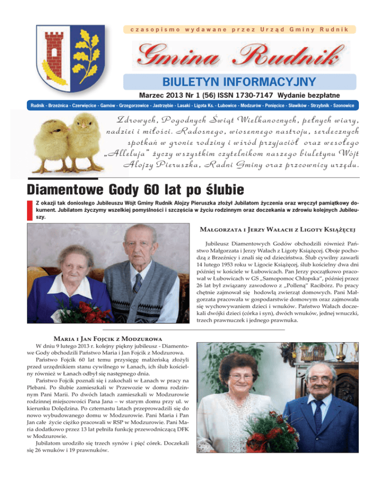 czasopismo wydawane przez Urz¹d Gminy Rudnik BIULETYN INFORMACYJNY Marzec 2013 Nr 1 (56) ISSN 1730-7147 Wydanie bezp³atne Rudnik - BrzeŸnica - Czerwiêcice - Gamów - Grzegorzowice - Jastrzêbie - Lasaki - Ligota Ks. - £ubowice - Modzurów - Poniêcice - S³awików - Strzybnik - Szonowice Zdrowych, Pogodnych Świąt Wielkanocnych, pełnych wiary, nadziei i miłości. Radosnego, wiosennego nastroju, serdecznych spotkań w gronie rodziny i wśród przyjaciół oraz wesołego „Alleluja” życzy wszystkim czytelnikom naszego biuletynu Wójt Alojzy Pieruszka, Radni Gminy oraz przcownicy urzędu. Diamentowe Gody 60 lat po ślubie Z okazji tak doniosłego Jubileuszu Wójt Gminy Rudnik Alojzy Pieruszka złożył Jubilatom życzenia oraz wręczył pamiątkowy dokument. Jubilatom życzymy wszelkiej pomyślności i szczęścia w życiu rodzinnym oraz doczekania w zdrowiu kolejnych Jubileuszy. Małgorzata i Jerzy Wałach z Ligoty Książęcej Jubileusz Diamentowych Godów obchodzili również Państwo Małgorzata i Jerzy Wałach z Ligoty Książęcej. Oboje pochodzą z Brzeźnicy i znali się od dzieciństwa. Ślub cywilny zawarli 14 lutego 1953 roku w Ligocie Książęcej, ślub kościelny dwa dni później w kościele w Łubowicach. Pan Jerzy początkowo pracował w Łubowicach w GS „Samopomoc Chłopska”, później przez 26 lat był związany zawodowo z „Polleną” Racibórz. Po pracy chętnie zajmował się hodowlą zwierząt domowych. Pani Małgorzata pracowała w gospodarstwie domowym oraz zajmowała się wychowywaniem dzieci i wnuków. Państwo Wałach doczekali dwójki dzieci (córka i syn), dwóch wnuków, jednej wnuczki, trzech prawnuczek i jednego prawnuka. Maria i Jan Fojcik z Modzurowa W dniu 9 lutego 2013 r. kolejny piękny jubileusz - Diamentowe Gody obchodzili Państwo Maria i Jan Fojcik z Modzurowa. Państwo Fojcik 60 lat temu przysięgę małżeńską złożyli przed urzędnikiem stanu cywilnego w Łanach, ich ślub kościelny również w Łanach odbył się następnego dnia. Państwo Fojcik poznali się i zakochali w Łanach w pracy na Plebani. Po ślubie zamieszkali w Przewozie w domu rodzinnym Pani Marii. Po dwóch latach zamieszkali w Modzurowie rodzinnej miejscowości Pana Jana – w starym domu przy ul. w kierunku Dolędzina. Po czternastu latach przeprowadzili się do nowo wybudowanego domu w Modzurowie. Pani Maria i Pan Jan całe życie ciężko pracowali w RSP w Modzurowie. Pani Maria dodatkowo przez 13 lat pełniła funkcję przewodniczącą DFK w Modzurowie. Jubilatom urodziło się trzech synów i pięć córek. Doczekali się 26 wnuków i 19 prawnuków. Spotkanie hodowców Gołębi Bal w Ligocie Książęcej Bal w Ligocie Książęcej Dzień seniora Szonowice Koncert kolęd Modzurów Dzień babci i dziadka Szonowice Dzień kobiet KGW Szonowice Konkurs potraw regionalnych Pietrowice Wielkie strona - 2 Gmina Rudnik - Biuletyn informacyjny Z a p o w i e d z i Ogólnopolski Bieg na Łyżworolkach W dniu 18 mają odbedzie się III Ogólnopolski Bieg na Łyżworolach na trasie Modzurów – Pawłów – Modzurów.Pierwsze starty dla dzieci i młodzieży o godz. 14.00. Start do biegu głownego na dystansie 23 km o godz. 15.00 W programie następujące kategorie biegowe: Pożegnaliśmy dwóch aktywnych społeczników W dniu 19 lutego 2013 roku pożegnaliśmy wielkiego społecznika Joahannesa Szczuka z Rudnika Johannes Szczuka urodził się 4 grudnia 1933 roku w Rudniku. Całe swoje życie spędził na ziemi rudnickiej gdzie wspólnie z żoną Heleną mieszkali i wychowywali troje dzieci. Zawsze zaangażowany w sprawy swojej miejscowości był inicjatorem powstania zespołu tanecznego Sanssoci, który w roku 2009 obchodził 10 lecie swojej działalności. Przez wszystkie lata zespół działał przy gminnej bibliotece i pod patronatem koła DFK w Rudniku. W roku 2010 Pan Johannes Szczuka otrzymał wyróżnienie społecznika roku. Uroczystości pogrzebowe odbyły się w kościele parafialnym w Rudniku w dniu 23 lutego 2013 roku. Łączymy się w żalu z pogrążoną w smutku rodziną. W dniu 28 grudnia 2012 roku w kościele parafialnym w Łubowicach pożegnaliśmy Józefa Patera W dniu 25 grudnia zmarł człowiek wielkiego serca i społecznik - Józef Pater, od urodzenia związany z naszą małą ojczyzną. Józef Pater urodził się 1 kwietnia 1940r w Łubowicach. Był inicjatorem i członkiem oraz założycielem komitetu organizacyjnego Towarzystwa Miłośników Eichendorffa. Opiekunem zabytkowego młyna w Brzeźnicy. Zawsze związany z Towarzystwem Eichendorffa, aktywnie uczestniczył w życiu społeczno – kulturalnym Łubowic. Wiele lat był też Radnym Gminy Rudnik. W 2010 roku Józef Pater otrzymał prestiżowe wyróżnienie Górnośląskiego Centrum Spotkań im. Eichendorffa, które wręczył mu praprawnuk poety, Georg von Eichendorff hrabia Stachwitz. Józef Pater, otrzymał także wyróżnienie "Zasłużony dla gminy Rudnik". Z wielkim żalem tłumy bliskich i przyjaciół żegnały człowieka o wielkim sercu. Gmina Rudnik - Biuletyn informacyjny Szkoła podstawowa: 1. klasy l - III (dziewczyny) — 200 m. 2. klasy l - III (chłopcy) - 200 m. 3. klasy IV — VI (dziewczyny) — 800 m. 4 klasy IV — VI (chłopcy) — 800 m. Gimnazjum: 1. klasy l - III (dziewczyny) — 2000 m. 2. klasy l - III (chłopcy) - 2000 m. Mężczyźni: 1. kategoria do 39 lat — 23000 m. 2. kategoria od 40 lat — 49 lat —23000 m. 3. kategoria od 50 lat — 59 lat - 23000 m. Kobiety: 1. kategoria do 35 lat 11500 m. 2. kategoria powyżej 35 lat 11500 m. 4. kategoria powyżej 60 lat – 23000 m. Przewiduje się nagrody dla: - najmłodszego zawodnika (zawodniczkii) i najstarszego zawodnika (zawodniczki). - najlepszego mieszkańca Gminy Rudnik i Pietrowice Wlk. - najlepszego zawodnika z zagranicy. Na zwycięzców czekają puchary i atrakcyjne nagrody za miejsca I – III w kategoriach wiekowych. XI Rudnicki Bieg Uliczny W dniu 3 czerwca o godz. 10.00 odbędzie się XI Rudnicki Bieg 