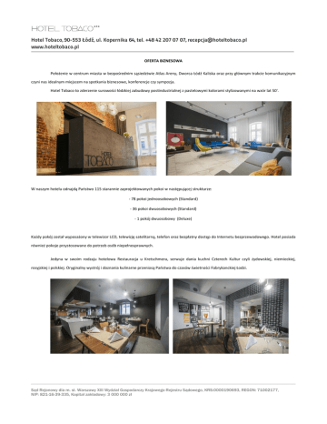 OFERTA BIZNESOWA Położenie w centrum miasta w bezpośrednim sąsiedztwie Atlas Areny, Dworca Łódź Kaliska oraz przy głównym trakcie komunikacyjnym czyni nas idealnym miejscem na spotkania biznesowe, konferencje czy sympozja. Hotel Tobaco to zderzenie surowości łódzkiej zabudowy postindustrialnej z pastelowymi kolorami stylizowanymi na wzór lat 50'. W naszym hotelu odnajdą Państwo 115 starannie zaprojektowanych pokoi w następującej strukturze: - 78 pokoi jednoosobowych (Standard) - 36 pokoi dwuosobowych (Standard) - 1 pokój dwuosobowy (Deluxe) Każdy pokój został wyposażony w telewizor LCD, telewizję satelitarną, telefon oraz bezpłatny dostęp do Internetu bezprzewodowego. Hotel posiada również pokoje przystosowane do potrzeb osób niepełnosprawnych. Jedyna w swoim rodzaju hotelowa Restauracja u Kretschmera, serwuje dania kuchni Czterech Kultur czyli żydowskiej, niemieckiej, rosyjskiej i polskiej. Oryginalny wystrój i doznania kulinarne przeniosą Państwa do czasów świetności Fabrykanckiej Łodzi. Sąd Rejonowy dla m. st. Warszawy XIII Wydział Gospodarczy Krajowego Rejestru Sądowego, KRS:0000190693, REGON: 71002177, NIP: 821-16-39-335, Kapitał zakładowy: 3 000 000 zł KONFERENCJE I SZKOLENIA Hotel Tobaco dysponuje pięcioma nowoczesnymi i klimatyzowanymi salami konferencyjnymi, które zostały wyposażone w najnowszy sprzęt audiowizualny oraz bezpłatny dostęp do Internetu WiFi. Poniżej prezentujemy możliwości ustawienia i wymiary sal: Dodatkowo posiadamy jeden przenośny rzutnik z ekranem. Wyposażenie dodatkowo płatne : - Laptop - Odtwarzacz DVD Dodatkowo oferujemy bogaty wybór przerw kawowych oraz zestawów lunchowych dostosowanych specjalnie do Państwa potrzeb. W przypadku zainteresowania naszą ofertą prosimy o kontakt z działem marketingu i sprzedaży, który odpowie na Państwa wszelkie pytania oraz sugestie. Sąd Rejonowy dla m. st. Warszawy XIII Wydział Gospodarczy Krajowego Rejestru Sądowego, KRS:0000190693, REGON: 71002177, NIP: 821-16-39-335, Kapitał zakładowy: 3 000 000 zł