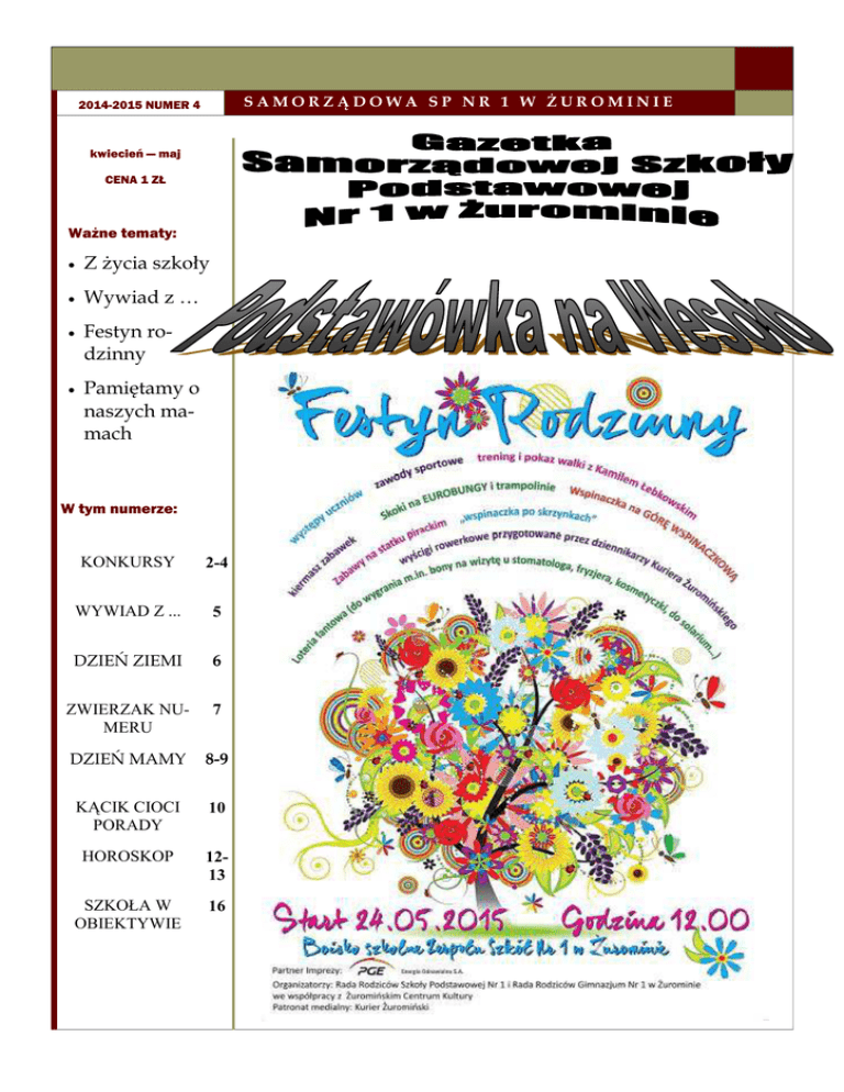 SAMORZĄDOWA SP NR 1 W ŻUROMINIE 2014-2015 NUMER 4 kwiecień — maj CENA 1 ZŁ Ważne tematy: • Z życia szkoły • Wywiad z … • Festyn rodzinny • Pamiętamy o naszych mamach W tym numerze: KONKURSY 2-4 WYWIAD Z ... 5 DZIEŃ ZIEMI 6 ZWIERZAK NUMERU 7 DZIEŃ MAMY 8-9 KĄCIK CIOCI PORADY 10 HOROSKOP 1213 SZKOŁA W OBIEKTYWIE 16 Podstawówka na wesoło Z ŻYCIA SZKOŁY ZESPÓŁ REDAKCYJNY GAZETKI „RUSZ SIĘ CZŁOWIEKU” Antoszewska Monika W dniu 20 marca 2015 roku w naszej szkole odbył się klasowy turniej piłki nożnej pt. „Rusz się, człowieku”. Udział w tym turnieju brały klasy IV-VI. Każda Czaplińska Monika klasa wyznaczała 6 osób do swojej drużyny: trzech chłopców i trzy dziewczy- Karczewski Artur ny. Klasy zostały podzielone na 2 grupy , grupę A oraz grupę B. Każdy mecz Kawczyński Kamil trwał 10 minut, Osoby , które nie grały w klasowej drużynie, mogły przygotować plakaty lub hasła dopingujące drużynę. Rywalizacja między klasami była bardzo zacięta , dochodziło nawet do rzutów karnych. Ostatecznie wygrała klasa 6a, które pokonała w Kąpińska Ania Kraszewska Angelika Lipski Mateusz finale klasę 6c. Trzecie miejsce zaję- Radzimska Zuzia ła klasa 5a . Smulski Tobiasz Dziękujemy wszystkim klasom za udział w turnieju i liczymy na jeszcze większe zaangażowanie w przyszłym roku ! Sobiech Julia Szablewska Dominika Wiśniewski Miłosz Wojtkiewicz Ola KONKURSY, KONKURSY… Zawiercichowska Agata Piątek 8 maja to szczęśliwy dzień dla naszej szkoły. Odbyły się dwa konkursy Opieka w których odnieśliśmy sukces. Pierwszy z nich to Konkurs Ekologiczny prze- Pawlak Hanna znaczony dla uczniów powiatu żuromińskiego. Składał się z dwóch części: praktycznej w której zbieraliśmy surowce wtórne, sprzątaliśmy las, organizo- Kaczmarczyk Katarzyna waliśmy obchody Dnia Ziemi oraz teoretycznej w której dwóch uczniów Nata- Dobies Marcin lia Żujewska i Julian Zakrzewski pisało test dotyczący ekologii i ochrony środowiska. W finale powiatowym części praktycznej i teoretycznej zajęliśmy I miejsce. W naszej szkole odbył się tego samego dnia konkurs BRD. Drużyna w składzie: Natalia Żujewska, Kasia Ulanowska, Michał Lemański i Jacek Michalski najlepiej napisali test i pokonali tor przeszkód. Zasłużenie zdobyli I miejsce. W etapie rejonowym, który odbył się 15 maja w Mławie naszej drużynie zabrakło trochę szczęścia i zajęła IV miejsce. Gratulujemy wszystkim i życzymy dalszych sukcesów. Kontakt Przez członków zespołu redakcyjnego Podstawówka na wesoło Z ŻYCIA SZKOŁY KONKURS POŻARNICZY Jak co roku w naszej gminie, odbył się konkurs pożarniczy pod tytułem „Młodzież zapobiega pożarom”. Uczniowie naszej szkoły – Jacek Michalski, Julian Zakrzewski, Ola Wojtkiewicz i Tobiasz Smulski pilnie przygotowywali się do konkursu. Julian Zakrzewski wywalczył I miejsce i przeszedł do etapu powiatowego w którym zajął II miejsce. Niestety tylko zwycięzcy zakwalifikowali się do etapu wojewódzkiego. Jesteśmy dumni z naszych uczniów i życzymy im powodzenia w następnym roku. OGÓLNOPOLSKI KONKURS POLONISTYCZNY „Z POPRAWNĄ POLSZCZYZNĄ NA CO DZIEŃ” Tradycją w naszej szkole stał się już udział uczniów w Ogólnopolskim Konkursie Polonistycznym „Z poprawną polszczyzną na co dzień”. Zawsze osiągamy tam jakieś sukcesy. Nie inaczej jest w tym roku. Mamy 5 finalistów, o dwóch więcej niż w zeszłym roku. Są nimi: Dominika Grzywińska (kl. 1a), Julia Łuczkiewicz (kl. 2a), Oliwia Nadolska (kl. 2b), Marta Rogowska (kl. 3c) oraz Natalia Żujewska (kl. 5a). Uczniom gratulujemy i trzymamy kciuki 22 maja, bowiem wtedy w Warszawie, w Pałacu Staszica na Nowym Świecie, odbędzie się finał. Życzymy powodzenia! MIĘDZYNARODOWY KONKURS MATEMATYCZNY „KANGUR” W dniu 19 marca 2015 r. trzydziestu czterech uczniów z klas III-VI naszej szkoły wzięło udział w Międzynarodowym Konkursie Matematycznym „Kangur”. W tym roku nikomu nie udało się uzyskać tytułu laureata (w ubiegłym roku była nim Natalia Żujewska), ale pięciu uczniów otrzymało wyróżnienia w tym prestiżowym i bardzo trudnym konkursie. Są to: Artur Karczewski – kl. 6b Natalia Żujewska – kl. 5a Agnieszka Gesek – kl. 4b Tomasz Pudlak – kl. 3a Mateusz Gniadkowski – kl. 3b Wszystkim wyróżnionym gratulujemy!!!! Podstawówka na wesoło Z ŻYCIA SZKOŁY „Savoir-vivre na co dzień” Niedawno uczniowie naszej szkoły zmierzyli się z kolejnym konkursem. Dotyczył on zasad kulturalnego zachowania się. Zagadnienia konkursowe były bardzo rozbudowane. Trzeba było poznać m.in.: zasady powitania, przedstawiania, pierwszeństwa przy wchodzeniu i wychodzeniu, ubioru w sytuacjach oficjalnych i nieoficjalnych, zachowania się przy stole i w podróży oraz postępowania wobec osób z niepełnosprawnością i wiele innych. Bez rzetelnej nauki było bardzo trudno rozwiązać poprawnie test. Oto przykładowe pytania: Zaznacz prawidłową odpowiedź/odpowiedzi: Widelec kładziemy zębami do dołu po lewej stronie talerza. Widelec kładziemy zębami do góry po lewej stronie talerza. Nóż kładziemy po prawej stronie zawsze ostrzami do wewnątrz. Nóż kładziemy po prawej stronie zawsze ostrzami do zewnątrz. Nóż powinien : służyć do krojenia mięsa. służyć do krojenia makaronu. w ograniczony sposób pomagać w nakładaniu porcji. służyć do krojenia sałaty. Podstawową zasadą powitania jest to, że: starszy wita młodszego, mężczyzna – kobietę, przełożony – podwładnego. młodszy wita starszego, mężczyzna – kobietę, podwładny – przełożonego. wchodzący – już znajdujących się w pomieszczeniu, podwładny – przełożonego. uczeń wita nauczyciela, wchodzący nauczyciel – będących już np. w szkole uczniów. TURNIEJ SZACHOWY 24.04.2015r odbył się w naszej szkole Turniej Szachowy „O Puchar Dyrektora Zespołu Szkół nr 1”. Głównymi organizatorami tej imprezy byl