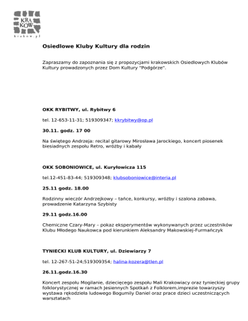 Osiedlowe Kluby Kultury dla rodzin Zapraszamy do zapoznania się z propozycjami krakowskich Osiedlowych Klubów Kultury prowadzonych przez Dom Kultury "Podgórze". OKK RYBITWY, ul. Rybitwy 6 tel. 12-653-11-31; 519309347; [email protected] 30.11. godz. 17 00 Na świętego Andrzeja: recital gitarowy Mirosława Jarockiego, koncert piosenek biesiadnych zespołu Retro, wróżby i kabały OKK SOBONIOWICE, ul. Kuryłowicza 115 tel.12-451-83-44; 519309348; [email protected] 25.11 godz. 18.00 Rodzinny wieczór Andrzejkowy – tańce, konkursy, wróżby i szalona zabawa, prowadzenie Katarzyna Szybisty 29.11 godz.16.00 Chemiczne Czary-Mary – pokaz eksperymentów wykonywanych przez uczestników Klubu Młodego Naukowca pod kierunkiem Aleksandry Makowskiej-Furmańczyk TYNIECKI KLUB KULTURY, ul. Dziewiarzy 7 tel. 12-267-51-24;519309354; [email protected] 26.11.godz.16.30 Koncert zespołu Mogilanie, dziecięcego zespołu Mali Krakowiacy oraz tynieckiej grupy folklorystycznej w ramach Jesiennych Spotkań z Folklorem,imprezie towarzyszy wystawa rękodzieła ludowego Bogumily Daniel oraz prace dzieci uczestniczących warsztatach OKK WRÓBLOWICE, ul. Niewodniczańskiego 72 tel. 12-654-95-63; 519309351; [email protected]; www.okkw.webserwer.pl Klub Rodzica: 18, 25.11.godz.13.30 Warsztaty umuzykalniające E.E. Gordona Gordonki w ramach Klubu rodzica, prowadzenie Monika Madej dla dzieci 1 – 3 lat 19.11.godz.13.30 Zajęcia animacyjne i ogólnorozwojowe w ramach Klubu Rodzica, prowadzenie Magdalena Szwarcbach dla dzieci 2- 3 lat i rodziców 21,28.11.godz.13.30 Warsztaty języka migowego w ramach Klubu Rodzica, prowadzenie Edyta Pokrzywa dla dzieci 1 – 4 lat i rodziców 22,29.11.godz.13.30 Fitness mama w ramach Klubu Rodzica, prowadzenie Justyna Czudek, dla dzieci od niemowlaka do 3 lat i rodziców 23.11.godz.13.30 Zajęcia teatralno-logopedyczne w ramach Klubu Rodzica, prowadzenie Agnieszka Kolanowska, dla dzieci 2 – 3 lat i rodziców OKK ZBYDNIOWICE, ul. Matematyków Krakowskich 102 tel.12-659-71-20; 519309352; [email protected] lub [email protected] www.klubkultury.com 28. 11. godz.16.30 Blok zabaw integracyjnych dla dzieci oraz wróżby andrzejkowe, prowadzenie Wiesława Tais i Bożenna Milewska-Nowak Zapraszamy! Powered by TCPDF (www.tcpdf.org)