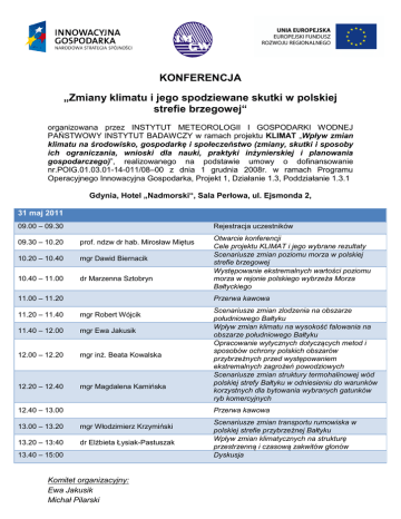 KONFERENCJA „Zmiany klimatu i jego spodziewane skutki w polskiej strefie brzegowej“ organizowana przez INSTYTUT METEOROLOGII I GOSPODARKI WODNEJ PAŃSTWOWY INSTYTUT BADAWCZY w ramach projektu KLIMAT „Wpływ zmian klimatu na środowisko, gospodarkę i społeczeństwo (zmiany, skutki i sposoby ich ograniczania, wnioski dla nauki, praktyki inżynierskiej i planowania gospodarczego)”, realizowanego na podstawie umowy o dofinansowanie nr.POIG.01.03.01-14-011/08–00 z dnia 1 grudnia 2008r. w ramach Programu Operacyjnego Innowacyjna Gospodarka, Projekt 1, Działanie 1.3, Poddziałanie 1.3.1 Gdynia, Hotel „Nadmorski“, Sala Perłowa, ul. Ejsmonda 2, 31 maj 2011 09.00 – 09.30 Rejestracja uczestników 09.30 – 10.20 prof. ndzw dr hab. Mirosław Miętus 10.20 – 10.40 mgr Dawid Biernacik 10.40 – 11.00 dr Marzenna Sztobryn 11.00 – 11.20 Otwarcie konferencji Cele projektu KLIMAT i jego wybrane rezultaty Scenariusze zmian poziomu morza w polskiej strefie brzegowej Występowanie ekstremalnych wartości poziomu morza w rejonie polskiego wybrzeża Morza Bałtyckiego Przerwa kawowa 11.20 – 11.40 mgr Robert Wójcik 11.40 – 12.00 mgr Ewa Jakusik 12.00 – 12.20 mgr inż. Beata Kowalska 12.20 – 12.40 mgr Magdalena Kamińska 12.40 – 13.00 Scenariusze zmian zlodzenia na obszarze południowego Bałtyku Wpływ zmian klimatu na wysokość falowania na obszarze południowego Bałtyku Opracowanie wytycznych dotyczących metod i sposobów ochrony polskich obszarów przybrzeżnych przed występowaniem ekstremalnych zagrożeń powodziowych Scenariusze zmian struktury termohalinowej wód polskiej strefy Bałtyku w odniesieniu do warunków korzystnych dla bytowania wybranych gatunków ryb komercyjnych Przerwa kawowa 13.00 – 13.20 mgr Włodzimierz Krzymiński 13.20 – 13:40 dr Elżbieta Łysiak-Pastuszak 13.40 – 15:00 Komitet organizacyjny: Ewa Jakusik Michał Pilarski Scenariusze zmian transportu rumowiska w polskiej strefie przybrzeżnej Bałtyku Wpływ zmian klimatycznych na strukturę przestrzenną i czasową zakwitów glonów Dyskusja