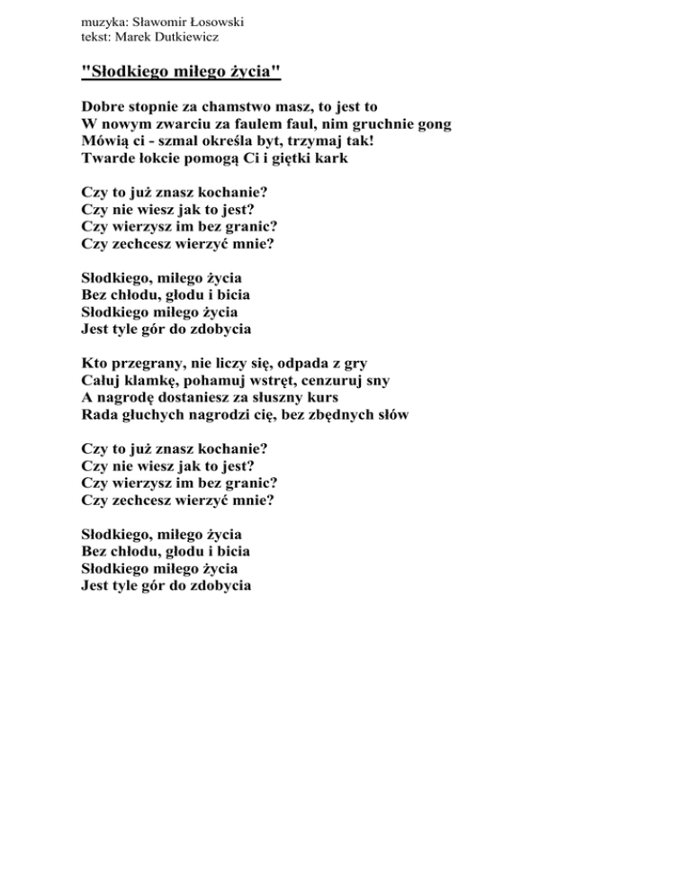 muzyka: Sławomir Łosowski tekst: Marek Dutkiewicz "Słodkiego miłego życia" Dobre stopnie za chamstwo masz, to jest to W nowym zwarciu za faulem faul, nim gruchnie gong Mówią ci - szmal określa byt, trzymaj tak! Twarde łokcie pomogą Ci i giętki kark Czy to już znasz kochanie? Czy nie wiesz jak to jest? Czy wierzysz im bez granic? Czy zechcesz wierzyć mnie? Słodkiego, miłego życia Bez chłodu, głodu i bicia Słodkiego miłego życia Jest tyle gór do zdobycia Kto przegrany, nie liczy się, odpada z gry Całuj klamkę, pohamuj wstręt, cenzuruj sny A nagrodę dostaniesz za słuszny kurs Rada głuchych nagrodzi cię, bez zbędnych słów Czy to już znasz kochanie? Czy nie wiesz jak to jest? Czy wierzysz im bez granic? Czy zechcesz wierzyć mnie? Słodkiego, miłego życia Bez chłodu, głodu i bicia Słodkiego miłego życia Jest tyle gór do zdobycia