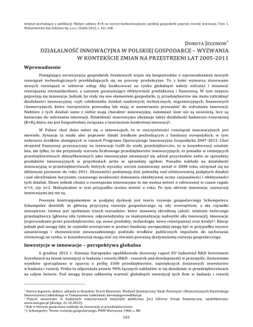 Artykuł pochodzący z publikacji: Wpływ sektora B+R na wzrost konkurencyjności polskiej gospodarki poprzez rozwój innowacji. Tom 1, Wydawnictwo Sun Solution Sp. z.o.o., Chełm 2012, s. 161-168. DOROTA JEGOROW DZIAŁALNOŚĆ INNOWACYJNA W POLSKIEJ GOSPODARCE – WYZWANIA W KONTEKŚCIE ZMIAN NA PRZESTRZENI LAT 2005-2011 Wprowadzenie Postępująca serwicyzacja gospodarek światowych wiąże się bezpośrednio z wprowadzaniem nowych rozwiązań technologicznych przekładających się na procesy produkcyjne. To z kolei wymusza stosowanie nowych rozwiązań w sektorze usług. Aby konkurować na rynku globalnym należy wdrażać i stosować rozwiązania niestandardowe, a zarazem gwarantujące efektywność produktową i finansową. W tym miejscu pojawiają się innowacje. Jednak, by stały się one elementem gospodarki, tj. przedsiębiorstw nie może zabraknąć działalności innowacyjnej, czyli całokształtu działań naukowych, technicznych, organizacyjnych, finansowych i komercyjnych, które rzeczywiście prowadzą lub mają w zamierzeniu prowadzić do wdrażania innowacji. Niektóre z tych działań same z siebie mają charakter innowacyjny, natomiast inne nie są nowością, lecz są konieczne do wdrażania innowacji. Działalność innowacyjna obejmuje także działalność badawczo-rozwojową (B+R), która nie jest bezpośrednio związana z tworzeniem konkretnej innowacji1. W Polsce choć dużo mówi się o innowacjach, to w rzeczywistości rozwiązań innowacyjnych jest niewiele. Sytuacja ta miała ulec poprawie dzięki środkom pochodzącym z funduszy europejskich, w tym zwłaszcza środków dostępnych w ramach Programu Operacyjnego Innowacyjna Gospodarka 2007-2013. Choć strumień finansowy przeznaczony na innowacje trafił do wielu przedsiębiorców, to w konsekwencji ostatnie lata, nie tylko, że nie przyniosły wzrostu liczbowego przedsiębiorstw innowacyjnych, to ponadto w istniejących przedsiębiorstwach sklasyfikowanych jako innowacyjne zmniejszył się udział przychodów netto ze sprzedaży produktów innowacyjnych w przychodach netto ze sprzedaży ogółem. Ponadto nakłady na działalność innowacyjną w przedsiębiorstwach, których wyraźny wzrost zanotowany został w 2008 roku, utrzymał się na zbliżonym poziomie do roku 2011. Ekonomiści podejmują dziś polemikę nad efektywnością podjętych działań i nad określeniem horyzontu czasowego możliwości dokonania obiektywnej oceny racjonalności i efektywności tych działań. Skoro jednak chodzi o rozwiązania innowacyjne to nie można mówić o odroczonej w czasie regule n2+3, czy n+2. Maksymalnie w tym przypadku można mówić o roku. Po tym okresie innowacje, zazwyczaj innowacjami już nie są. Pewnym kontrargumentem w podjętej dyskusji jest teoria rozwoju gospodarczego Schumpetera. Schumpeter dowiódł, że główną przyczyną rozwoju gospodarczego są siły wewnętrzne, a nie czynniki zewnętrzne. Istotne jest spełnienie trzech warunków, które stanowią określoną całość: istnienie twórczego przedsiębiorcy (główna siła rynkowa; odpowiedzialny za maksymalizację nadwyżki siła innowacji), innowacje (wprowadzane przez przedsiębiorców; np. nowe produkty, technologie, nowe rozwiązania) oraz kredyt 3. Biorąc jednak pod uwagę fakt, że czynniki zewnętrzne w postaci funduszy europejskiej mogą być w przypadku wysoce uznaniowego i ekonomicznie nieuzasadnionego podziału środków publicznych impulsem do zachwiania równowagi na rynku, w konsekwencji mogą stać się również poważną destymulantą rozwoju gospodarczego. Inwestycje w innowacje – perspektywa globalna 6 grudnia 2012 r. Komisja Europejska opublikowała doroczny raport EU Industrial R&D Investment Scoreboard na temat inwestycji w badania i rozwój (R&D - research and development) w przemyśle. Zestawienie wyników sporządzono w oparciu o próbę 1500 przedsiębiorstw, największych światowych inwestorów w badania i rozwój. Próba ta odpowiada prawie 90% łącznych nakładów w tej dziedzinie w przedsiębiorstwach na całym świecie. Pod uwagę brano całkowitą wartość globalnych inwestycji tych firm w badania i rozwój Dorota Jegorow, doktor, adiunkt w Katedrze Teorii Ekonomii, Wydział Zamiejscowy Nauk Prawnych i Ekonomicznych Katolickiego Uniwersytetu Lubelskiego w Tomaszowie Lubelskim, [email protected]. 1 Pojęcie stosowane w badaniach statystycznych statystyki publicznej [w:] Główny Urząd Statystyczny, opublikowano: www.stat.gov.pl [dostęp: 21.12.2012]. 2 Rok w którym poniesiono nakłady na innowacje w przedsiębiorstwie. 3 J. Schumpeter, Teorie rozwoju gospodarczego, PWN Warszawa 1960, s. 88. 161 finansowanych z własnych środków, niezależnie od tego, gdzie działania te mają miejsce. Z 1500 firm uwzględnionych w rankingu 405 ma siedzibę w UE, 503 w USA, 296 w Japonii i 296 w innych częściach świata, w tym w Szwajcarii, Korei Południowej, Chinach, Indiach i 23 innych państwach. Każde państwo występujące w zestawieniu zainwestowało w 2011 r. co najmniej 35 mln euro w badania i rozwój. Niestety, ale w rankingu tym nie pojawiła się żadna polska firma4. Komisja Europejska na łamach mniejszej publikacji stawia tezę, że pomimo trwającego kryzysu gospodarczego i finansowego główne unijne przedsiębiorstwa nadal budują swoją konkurencyjność w oparciu o badania naukowe i rozwój. Dowodem na to mają być m.in. dane statystyczne z których wynika, że inwestycje w tej dziedzinie wzrosły w 2011 r. o 8,9%, podczas gdy w 2010 r. wzrost ten sięgnął 6,1%. Dzięki takiemu wzrostowi przedsiębiorstwa unijne niemal dorównują firmom amerykańskim (9%), przewyższają światową średnią (7,6%) i zostawiają w tyle przedsiębiorstwa japońskie (1,7%). Co więcej, dane statystyczne wskazały, iż w sektorach intensywnie wykorzystujących badania i rozwój odnotowano ponadprzeciętny wzrost zatrudnienia. Wg danych zawartych w raporcie pierwsza pięćdziesiątka obejmuje 15 firm z UE, 18 z U