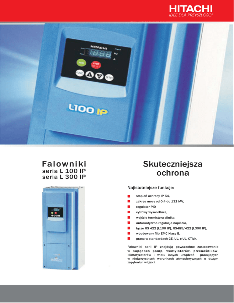 IDEE DLA PRZYSZŁOŚCI Falowniki seria L 100 IP seria L 300 IP Skuteczniejsza ochrona Najistotniejsze funkcje: stopień ochrony IP 54, zakres mocy od 0.4 do 132 kW, regulator PID cyfrowy wyświetlacz, wejście termistora silnika, automatyczna regulacja napiêcia, łącze RS 422 [L100 IP], RS485/422 [L300 IP], wbudowany filtr EMC klasy B, praca w standardach CE, UL, c-UL, CTick. Falowniki serii IP znajdują powszechne zastosowanie w nap ę dach pomp, wentylatorów, przeno ś ników, klimatyzatorów i wielu innych urządzeń pracujących w niekorzystnych warunkach atmosferycznych o dużym zapyleniu i wilgoci. Dane techniczne falowników: IDEE DLA PRZYSZŁOŚCI seria L100 IP Jednofazowe NFE - Model Trójfazowe HFE - 004 007 015 022 007 015 022 040 055 075 Maksymalna moc współpracującego silnika [kW] 0,4 0,75 1,5 2,2 0,75 1,5 2,2 4,0 5,5 7,5 Moc wyściowa falownika [kVA] 1,0 1,6 2,9 4,1 1,9 3,0 4,3 6,8 10,3 12,7 Znamionowe napięcie zasilania 1-fazowe: 220 V-10% ÷ 240 V+5%, f= 50/60 Hz ±5% 3-fazowe: 380 V-10% ÷ 460 V+10%, f= 50/60 Hz ±5% Znamionowe napięcie wyjściowe 3-fazowe: 200÷240 V (w powiązaniu z napięciem zasilania) 3-fazowe: 380÷460 V (w powiązaniu z napięciem zasilania) Znamionowy prąd wyjściowy [A] 4,0 2,6 10,0 7,1 2,5 Stopień ochrony 8,6 13,0 16,0 0,5 ÷ 360 Hz Charakterystyki sterowania U/f Stałomomentowa lub o momencie zredukowanym Od 0,1 s. do 3000 s. Przyspieszenie (zwalnianie) odbywać się może w sposób liniowy lub nieliniowy. Dostępny jest drugi zestaw czasów przyspieszania i zwalniania. Czas przyspieszania i zwalniania Wymiary [mm] 5,5 IP 54 Częstotliwość wyjściowa Moment hamujący 3,8 Bez opornika ~100 % ~70 % ~20 % ~100 % ~20 % ~70 % Hamowanie prądem stałym rozpoczyna się po zwolnieniu silnika do częstotliwości hamowania dynamicznego. Parametry hamowania ustawiane są przy pomocy pulpitu cyfrowego (częstotliwość hamowania, czas oczekiwania do rozpoczęcia hamowania oraz siła hamowania) Prądem stałym Szerokość 185 Wysokość 490 Głębokość 200 Masa [kg] 6,8 7,2 275 7,6 7,3 7,5 7,7 11,5 11,3 seria L300 IP Trójfazowe HFE - Model Maksymalna moc współpracującego silnika [kW] 015 022 040 055 075 110 150 185 220 300 370 450 550 750 900 1100 1320 1,5 2,2 4,0 5,5 7,5 11 15 18,5 22 30 37 45 55 75 90 110 132 105 135 160 195 230 Znamionowe napięcie zasilania 3-fazowe: 380 V-10% ÷ 460 V+10%, f= 50/60 Hz ±5% Znamionowe napięcie wyjściowe 3-fazowe: 380÷460 V (w powiązaniu z napięciem zasilania) Znamionowy prąd wyjściowy [A] 3,8 5,3 8,6 12 16 22 29 Stopień ochrony 57 70 85 0,1 ÷ 400 Hz Charakterystyki sterowania U/f Stałomomentowa zredukowa o wykładniku 1,7 swobodnie programowalna krzywa łamana (7 odcinków). Od 0,01 s. do 3600 s. liniowo, wg. krzywej S, krzywej U lub odwrotnej do U Czas przyspieszania i zwalniania 120 % prądu znamionowego przez 60 s., 150 % przez 0,5 s. Dopuszczalne przeciążenie prądowe Dokładność regulacji częstotliwości wyjściowej Szerokość Masa [kg] 43 IP 54 Częstotliwość wyjściowa Wymiary [mm] 37 Hamowanie prądem stałym rozpoczyna się po zwolnieniu silnika do częstotliwości hamowania dynamicznego. Parametry hamowania ustawiane są przy pomocy pulpitu cyfrowego (częstotliwość hamowania, czas oczekiwania do rozpoczęcia hamowania oraz siła hamowania) 310 250 350 410 490 580 Wysokość 620 760 910 1010 1300 Głębokość 320 340 345 400 440 41,0 67,0 81,0 160,0 22,0 23,0 Dystrybutor :