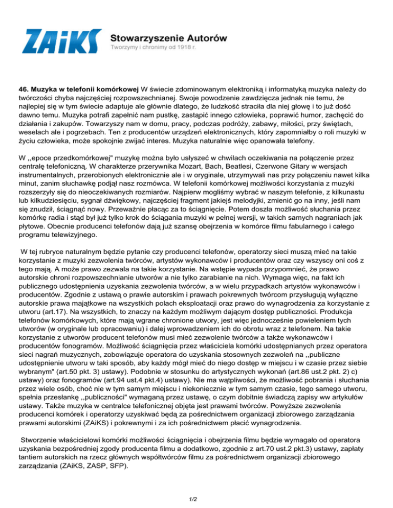 Stowarzyszenie Autorów ZAiKS - 46. Muzyka w telefonii komórkowej