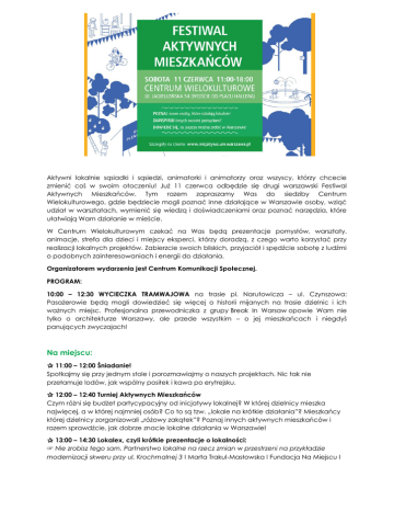 Aktywni lokalnie sąsiadki i sąsiedzi, animatorki i animatorzy oraz wszyscy, którzy chcecie zmienić coś w swoim otoczeniu! Już 11 czerwca odbędzie się drugi warszawski Festiwal Aktywnych Mieszkańców. Tym razem zapraszamy Was do siedziby Centrum Wielokulturowego, gdzie będziecie mogli poznać inne działające w Warszawie osoby, wziąć udział w warsztatach, wymienić się wiedzą i doświadczeniami oraz poznać narzędzia, które ułatwiają Wam działanie w mieście. W Centrum Wielokulturowym czekać na Was będą prezentacje pomysłów, warsztaty, animacje, strefa dla dzieci i miejscy eksperci, którzy doradzą, z czego warto korzystać przy realizacji lokalnych projektów. Zabierzcie swoich bliskich, przyjaciół i spędźcie sobotę z ludźmi o podobnych zainteresowaniach i energii do działania. Organizatorem wydarzenia jest Centrum Komunikacji Społecznej. PROGRAM: 10:00 – 12:30 WYCIECZKA TRAMWAJOWA na trasie pl. Narutowicza – ul. Czynszowa: Pasażerowie będą mogli dowiedzieć się więcej o historii mijanych na trasie dzielnic i ich ważnych miejsc. Profesjonalna przewodniczka z grupy Break In Warsaw opowie Wam nie tylko o architekturze Warszawy, ale przede wszystkim – o jej mieszkańcach i niegdyś panujących zwyczajach! Na miejscu: ✰ 11:00 – 12:00 Śniadanie! Spotkajmy się przy jednym stole i porozmawiajmy o naszych projektach. Nic tak nie przełamuje lodów, jak wspólny posiłek i kawa po erytrejsku. ✰ 12:00 – 12:40 Turniej Aktywnych Mieszkańców Czym różni się budżet partycypacyjny od inicjatywy lokalnej? W której dzielnicy mieszka najwięcej, a w której najmniej osób? Co to są tzw. „lokale na krótkie działania”? Mieszkańcy której dzielnicy zorganizowali „różowy zakątek”? Poznaj innych aktywnych mieszkańców i razem sprawdźcie, jak dobrze znacie lokalne działania w Warszawie! ✰ 13:00 – 14:30 Lokalex, czyli krótkie prezentacje o lokalności: ☞ Nie zrobisz tego sam. Partnerstwo lokalne na rzecz zmian w przestrzeni na przykładzie modernizacji skweru przy ul. Krochmalnej 3 I Marta Trakul-Masłowska I Fundacja Na Miejscu I W jaki sposób partnerstwo wpływa na trwałość działań – czy może dać szansę na kontynuację po zakończeniu projektu finansowanego z grantu? ☞ Orkiestra Sinfonia Varsovia – długo wyczekiwany dom na Kamionku I Janusz Marynowski I dyrektor Orkiestry Sinfonia Varsovia I Jak znana i ceniona na świecie orkiestra „zamieszkała” na warszawskim Kamionku. ☞ Muzeum dla mieszkańców Pragi I Ewa Kalnoj-Ziajkowska I Muzeum Warszawskiej Pragi, oddział Muzeum Warszawy I Jak znaleźliśmy odpowiedź na pytanie, po co i dla kogo tworzymy muzeum. ☞ Po co komu dom…sąsiedzki? I Zuzanna Włodarczyk, Agnieszka Matan I Centrum Komunikacji Społecznej Urzędu m.st. Warszawy I Jak oddolne idee stają się miejskim standardem. ☞ Centrum wielu kultur I Witek Hebanowski I Centrum Wielokulturowe ☞ Nowa Praga – nieformalna koalicja organizacji oraz instytucji aktywna na Pradze Północ I Justyna Chrościelewska I Nowa Praga = Nowe Centrum Warszawy ☞ Co się dzieje, gdy mieszkańcy wielkiego miasta uprawiają sporty zespołowe razem z sąsiadami? I Marek Kuszneruk I Naszeboisko.org ✰ 15:00 – 16:00 Warsztat muzyczny z senegalskim artystą - Pako Sarr' em Warsztaty poprowadzi Pako Sarr – niezwykła osobowość, gitarzysta, wokalista i kompozytor z Senegalu, który mieszka w Warszawie od wielu lat. Przedmiotem wspólnej nauki – zabawy będzie utwór „Sen o Warszawie” Czesława Niemena. Pako zaproponuje uczestnikom warsztatów także kilka tradycyjnych pieśni w senegalskim języku wolof. Finałem warsztatów będzie wspólny występ z całym zespołem Pako & Grzegorz & Mamadou podczas koncertu o godz. 17.00 ✰ 17:00 Zakończenie festiwalu: koncert Zespołu Pako & Grzegorz & Mamadou P&G&M to pomysł dwóch przyjaciół z Senegalu Pako Sarra i Mamadou Dioufa, którzy zaprosili swojego przyjaciela saksofonistę Grzegorza Rytkę do wspólnego grania. W grudniu 2013 r. z inicjatywy fundacji Afryka Inaczej wyszła płyta „Warszawa da się lubić” z polskimi szlagierami i muzyką w aranżacji Pako Sarr'a. Twórczość zespołu można określić jako World Music. Ich muzyka jest dialogiem kultur, sztuką eksperymentu, połączeniem rożnych gatunków. Pako Sarr: gitara akustyczna, śpiew, Grzegorz Rytka: saksofon, Mamadou Diouf: djembe, śpiew. ✰ 11:00-12:30 i 15:00-16:30 Zapraszamy na konsultacje społeczne: Pałacyk Konopackiego (dla) mieszkańców. Zaplanujmy razem ofertę nowego miejsca kultury! Towarzystwo Inicjatyw Twórczych „ę” prowadzi proces konsultacyjny dotyczącym Pałacyku Konopackiego i jego przeznaczenia na dom kultury. Celem działań jest odpowiedź na pytanie, co powinno się znaleźć w nowym centrum kultury, które ma działać w przyszłości w tym budynku. Wydarzenia otwarte związane z konsultacjami będą realizowane od 18 maja do 15 czerwca, więc Festiwal Aktywnych Mieszkańców to idealna okazja, żeby zapytać sąsiadów Centrum Wielokulturowego i jednocześnie sąsiadów Pałacyku Konopackiego o ich potrzeby kulturalne, pomysły, idee, które warto zrealizować w przyszłości w Pałacyku. Konsultacje będą się odbywały w godzinach: 11:00-12:30 i 15:00-16:30 w okolicach wejścia do Centrum Wielokulturowego. Znakiem rozpoznawczym będzie mobilna platforma konsultacyjna. ✰✰✰✰Przez cały dzień na terenie Centrum Wielokulturowego będą także działały:✰✰✰ ☞Strefa dzieci Na tegorocznej edycji Festiwalu Aktywnych Mieszkańców przestrzenią dla dzieci zajmie się Fundacja młodej kultury Hopsiup Project. Jej pracownicy poprowadzą warsztat edukacji architektonicznej, który będzie trwał przez cały czas trwania Festiwalu. Zadaniem uczestników warsztatów będzie zbudowanie miasta marzeń. Dołączyć można w dowolnej chwili! Powstanie makieta miasta idealnego dla każdego małego i dużego mieszkańca. ☞Strefa wiedzy Między go
