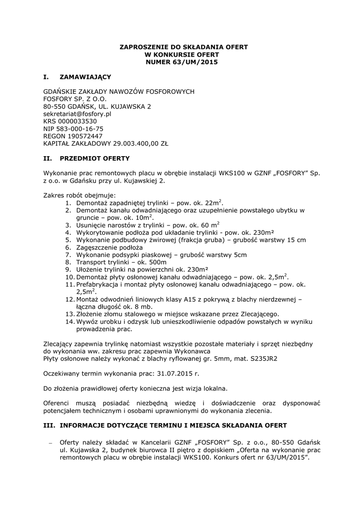 ZAPROSZENIE DO SKŁADANIA OFERT W KONKURSIE OFERT NUMER 63/UM/2015 I. ZAMAWIAJĄCY GDAŃSKIE ZAKŁADY NAWOZÓW FOSFOROWYCH FOSFORY SP. Z O.O. 80-550 GDAŃSK, UL. KUJAWSKA 2 [email protected] KRS 0000033530 NIP 583-000-16-75 REGON 190572447 KAPITAŁ ZAKŁADOWY 29.003.400,00 ZŁ II. PRZEDMIOT OFERTY Wykonanie prac remontowych placu w obrębie instalacji WKS100 w GZNF „FOSFORY” Sp. z o.o. w Gdańsku przy ul. Kujawskiej 2. Zakres robót obejmuje: 1. Demontaż zapadniętej trylinki – pow. ok. 22m2. 2. Demontaż kanału odwadniającego oraz uzupełnienie powstałego ubytku w gruncie – pow. ok. 10m2. 3. Usunięcie narostów z trylinki – pow. ok. 60 m2 4. Wykorytowanie podłoża pod układanie trylinki - pow. ok. 230m² 5. Wykonanie podbudowy żwirowej (frakcja gruba) – grubość warstwy 15 cm 6. Zagęszczenie podłoża 7. Wykonanie podsypki piaskowej – grubość warstwy 5cm 8. Transport trylinki – ok. 500m 9. Ułożenie trylinki na powierzchni ok. 230m² 10. Demontaż płyty osłonowej kanału odwadniającego – pow. ok. 2,5m2. 11. Prefabrykacja i montaż płyty osłonowej kanału odwadniającego – pow. ok. 2,5m2. 12. Montaż odwodnień liniowych klasy A15 z pokrywą z blachy nierdzewnej – łączna długość ok. 8 mb. 13. Złożenie złomu stalowego w miejsce wskazane przez Zlecającego. 14. Wywóz urobku i odzysk lub unieszkodliwienie odpadów powstałych w wyniku prowadzenia prac. Zlecający zapewnia trylinkę natomiast wszystkie pozostałe materiały i sprzęt niezbędny do wykonania ww. zakresu prac zapewnia Wykonawca Płyty osłonowe należy wykonać z blachy ryflowanej gr. 5mm, mat. S235JR2 Oczekiwany termin wykonania prac: 31.07.2015 r. Do złożenia prawidłowej oferty konieczna jest wizja lokalna. Oferenci muszą posiadać niezbędną wiedzę i doświadczenie oraz potencjałem technicznym i osobami uprawnionymi do wykonania zlecenia. dysponować III. INFORMACJE DOTYCZĄCE TERMINU I MIEJSCA SKŁADANIA OFERT Oferty należy składać w Kancelarii GZNF „FOSFORY” Sp. z o.o., 80-550 Gdańsk ul. Kujawska 2, budynek biurowca II piętro z dopiskiem „Oferta na wykonanie prac remontowych placu w obrębie instalacji WKS100. Konkurs ofert nr 63/UM/2015”. Osobą uprawnioną do kontaktów z oferentami jest Pan Jarosław Malinowski tel. /58/ 34 38 315, tel. 669 600 415. Termin składania ofert upływa w dniu 08.07.2015 roku. Za datę terminowego doręczenia oferty uważa się datę zarejestrowania oferty w Kancelarii GZNF „FOSFORY” Sp. z o.o. Oferty, które wpłyną po tym terminie nie będą rozpatrywane. IV. KRYTERIA OCENY SPEŁNIENIA DOSTAWCÓW/WYKONAWCÓW L.p. 1. 2. 3. 4. V. WARUNKÓW Kryteria Cena Czas realizacji Referencje Wiarygodność w ocenie członków Komisji WYMAGANYCH OD Znaczenie 70% 10% 10% 10% OFERTA POWINNA ZAWIERAĆ Szczegółowy zakres robót. Termin wykonania robót. Cenę ofertową za wykonanie kompletnego zakresu robót. Warunki płatności. Warunki gwarancyjne. Informację o kwalifikacjach posiadanej kadry technicznej. Referencje lub informacje o wykonanych pracach podobnego typu. VI. WYMAGANE ZAŁĄCZNIKI Kserokopia dokumentu rejestrowego oferenta. Kserokopia numeru NIP, REGON. Dokumenty pozwalające ocenić wiarygodność techniczną i ekonomiczną oferenta (np. kadra techniczna, sprzęt itp.) Oświadczenie o sytuacji finansowej zapewniającej wykonanie zamówienia. Oświadczenie o braku wszczęcia w stosunku do oferenta postępowania upadłościowego lub układowego. Oświadczenie o nie zaleganiu z uiszczaniem podatków, opłat lub składek na ubezpieczenia społeczne. VII. UWAGI KOŃCOWE Wszystkie dokumenty ofertowe muszą być podpisane przez osoby uprawnione do reprezentowania firmy. W przypadku zawarcia umowy deklarowane parametry rozliczeń nie będą podlegały zmianie przez cały jej okres działania. W przypadku wątpliwości lub koniecznych uzupełnień po otwarciu ofert zastrzega się prawo do przeprowadzenia rozmów uzupełniających i ewentualnych negocjacji lub do zamknięcia konkursu ofert bez dokonania wyboru którejkolwiek z ofert bez podania przyczyny.