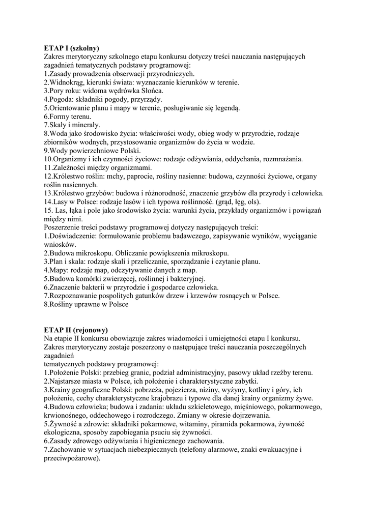 ETAP I (szkolny) Zakres merytoryczny szkolnego etapu konkursu dotyczy treści nauczania następujących zagadnień tematycznych podstawy programowej: 1.Zasady prowadzenia obserwacji przyrodniczych. 2.Widnokrąg, kierunki świata: wyznaczanie kierunków w terenie. 3.Pory roku: widoma wędrówka Słońca. 4.Pogoda: składniki pogody, przyrządy. 5.Orientowanie planu i mapy w terenie, posługiwanie się legendą. 6.Formy terenu. 7.Skały i minerały. 8.Woda jako środowisko życia: właściwości wody, obieg wody w przyrodzie, rodzaje zbiorników wodnych, przystosowanie organizmów do życia w wodzie. 9.Wody powierzchniowe Polski. 10.Organizmy i ich czynności życiowe: rodzaje odżywiania, oddychania, rozmnażania. 11.Zależności między organizmami. 12.Królestwo roślin: mchy, paprocie, rośliny nasienne: budowa, czynności życiowe, organy roślin nasiennych. 13.Królestwo grzybów: budowa i różnorodność, znaczenie grzybów dla przyrody i człowieka. 14.Lasy w Polsce: rodzaje lasów i ich typowa roślinność. (grąd, łęg, ols). 15. Las, łąka i pole jako środowisko życia: warunki życia, przykłady organizmów i powiązań między nimi. Poszerzenie treści podstawy programowej dotyczy następujących treści: 1.Doświadczenie: formułowanie problemu badawczego, zapisywanie wyników, wyciąganie wniosków. 2.Budowa mikroskopu. Obliczanie powiększenia mikroskopu. 3.Plan i skala: rodzaje skali i przeliczanie, sporządzanie i czytanie planu. 4.Mapy: rodzaje map, odczytywanie danych z map. 5.Budowa komórki zwierzęcej, roślinnej i bakteryjnej. 6.Znaczenie bakterii w przyrodzie i gospodarce człowieka. 7.Rozpoznawanie pospolitych gatunków drzew i krzewów rosnących w Polsce. 8.Rośliny uprawne w Polsce ETAP II (rejonowy) Na etapie II konkursu obowiązuje zakres wiadomości i umiejętności etapu I konkursu. Zakres merytoryczny zostaje poszerzony o następujące treści nauczania poszczególnych zagadnień tematycznych podstawy programowej: 1.Położenie Polski: przebieg granic, podział administracyjny, pasowy układ rzeźby terenu. 2.Najstarsze miasta w Polsce, ich położenie i charakterystyczne zabytki. 3.Krainy geograficzne Polski: pobrzeża, pojezierza, niziny, wyżyny, kotliny i góry, ich położenie, cechy charakterystyczne krajobrazu i typowe dla danej krainy organizmy żywe. 4.Budowa człowieka; budowa i zadania: układu szkieletowego, mięśniowego, pokarmowego, krwionośnego, oddechowego i rozrodczego. Zmiany w okresie dojrzewania. 5.Żywność a zdrowie: składniki pokarmowe, witaminy, piramida pokarmowa, żywność ekologiczna, sposoby zapobiegania psuciu się żywności. 6.Zasady zdrowego odżywiania i higienicznego zachowania. 7.Zachowanie w sytuacjach niebezpiecznych (telefony alarmowe, znaki ewakuacyjne i przeciwpożarowe). 8.Choroby człowieka: bakteryjne i wirusowe oraz odzwierzęce, zakaźne i niezakaźne, sposoby zarażania, zapobieganie i leczenie. 9.Budowa otaczającego nas świata: atomy i cząsteczki, stan skupienia substancji, budowa i właściwości ciał stałych, cieczy i gazów. 10. Substancje proste i złożone: pierwiastki i związki chemiczne, mieszaniny, roztwory. Poszerzenie treści podstawy programowej dotyczy następujących treści: 1.Gleby w Polsce: rodzaje i ogólna charakterystyka gleb, organizmy żyjące w glebie (czarnoziemy, mady, bielice). 2.Budowa, rola i higiena skóry. 3.Człowiek: budowa i rola narządu słuchu, budowa i rola narządu wzroku, układ nerwowy. 4.Ochrona przyrody w Polsce: formy ochrony przyrody, parki narodowe, ich rozmieszczenie, charakterystyczne obiekty chronione. ETAP III (wojewódzki) Na etapie III konkursu obowiązuje zakres wiadomości i umiejętności etapu I i II. Zakres merytoryczny dotyczy treści nauczania - następujących zagadnień tematycznych podstawy programowej: 1.Królestwo zwierząt: bezkręgowce i kręgowce, budowa, przystosowanie do środowiska życia, czynności życiowe. 2.Pogoda i klimat: strefy klimatyczne na Ziemi. 3.Ruch obiegowy i obrotowy Ziemi i następstwa tych ruchów. 4.Strefy krajobrazowe Ziemi: las równikowy, sawanny, pustynie,krajobraz śródziemnomorski, stepy, tajga, tundra, pustynie lodowe –Arktyka i Antarktyda. 5.Elektryczność, magnetyzm, grawitacja, ruch, prędkość. 6.Odnawialne i nieodnawialne źródła energii. Poszerzenie treści podstawy programowej dotyczy następujących treści: 1.Współrzędne geograficzne. 2.Oceany i kontynenty na Ziemi. Wyspy Morza Śródziemnego. 3.Płazy i gady w Polsce. 4.Globalne problemy ekologiczne: kwaśne opady, dziura ozonowa, efekt cieplarniany, skażenie powietrza wód i gleby. 5.Ziemia we Wszechświecie: ciała niebieskie w Układzie Słonecznym, fazy Księżyca. 6.Podróże i wielkie odkrycia geograficzne.