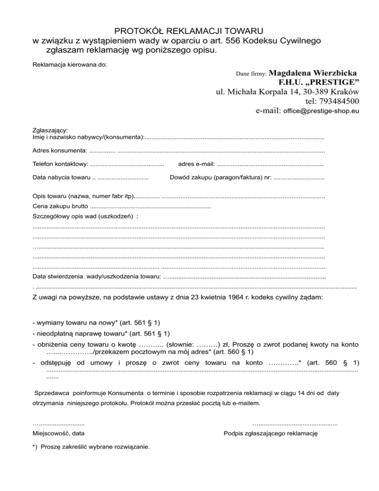 PROTOKÓŁ REKLAMACJI TOWARU w związku z wystąpieniem wady w oparciu o art. 556 Kodeksu Cywilnego zgłaszam reklamację wg poniższego opisu. Reklamacja kierowana do: Dane firmy: Magdalena Wierzbicka F.H.U. „PRESTIGE” ul. Michała Korpala 14, 30-389 Kraków tel: 793484500 e-mail: [email protected] Zgłaszający: Imię i nazwisko nabywcy/(konsumenta):...................................................................................................... Adres konsumenta: ............... ...................................................................................................................... Telefon kontaktowy: .......................................... Data nabycia towaru .. ............................. adres e-mail: ............................................................. Dowód zakupu (paragon/faktura) nr: ............................. Opis towaru (nazwa, numer fabr itp)............... …......................................................................................... Cena zakupu brutto ..................................................................... Szczegółowy opis wad (uszkodzeń) : ...................................................................................................................................................................... ...................................................................................................................................................................... ….................................................................................................................................................................. ...................................................................................................................................................................... ........................................................................ .............................................................................................. Data stwierdzenia wady/uszkodzenia towaru: …......................................................................................... . ...................................................................................................................................................................................... Z uwagi na powyższe, na podstawie ustawy z dnia 23 kwietnia 1964 r. kodeks cywilny żądam: - wymiany towaru na nowy* (art. 561 § 1) - nieodpłatną naprawę towaru* (art. 561 § 1) - obniżenia ceny towaru o kwotę ……….. (słownie: ………) zł, Proszę o zwrot podanej kwoty na konto …....…………../przekazem pocztowym na mój adres* (art. 560 § 1) - odstępuję od umowy i proszę o zwrot ceny towaru na konto ………….* (art. 560 § 1) ................................................................................................................................................................................. ....... Sprzedawca poinformuje Konsumenta o terminie i sposobie rozpatrzenia reklamacji w ciągu 14 dni od daty otrzymania niniejszego protokołu. Protokół można przesłać pocztą lub e-mailem. ….......................... Miejscowość, data *) Proszę zakreślić wybrane rozwiązanie. …............................................. Podpis zgłaszającego reklamację