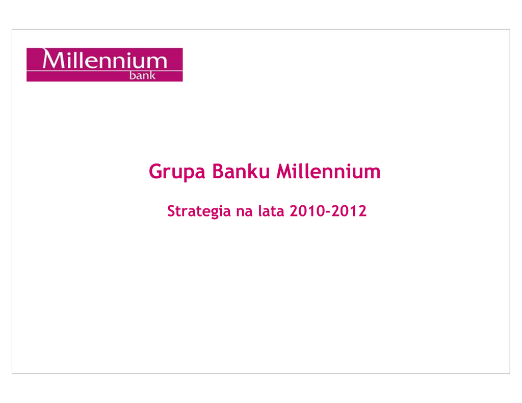 Grupa Banku Millennium Strategia na lata 2010-2012 Bank Millennium – Strategia 2010-2012 Zastrzeżenie Niniejsza prezentacja („Prezentacja”) została przygotowana przez Bank Millennium S.A. („Bank”) i w żadnym przypadku nie może być traktowana jako proponowanie nabycia papierów wartościowych, oferta, zaproszenie czy zachęta do złożenia oferty nabycia, dokonania inwestycji lub przeprowadzenia transakcji dotyczących takich papierów wartościowych lub rekomendacja do zawierania jakichkolwiek transakcji, w szczególności dotyczących papierów wartościowych Banku. Publikowanie przez Bank danych zawartych w Prezentacji nie stanowi naruszenia przepisów prawa obowiązujących spółki, których akcje są notowane na rynku regulowanym, w szczególności na rynku regulowanym prowadzonym przez Giełdę Papierów Wartościowych w Warszawie S.A. Informacje w niej zawarte zostały przekazane do publicznej wiadomości przez Bank w ramach raportów bieżących lub okresowych, albo stanowią ich uzupełnienie, nie dając jednocześnie podstawy do przekazywania ich w ramach wypełniania przez Bank jako spółkę publiczną obowiązków informacyjnych. W żadnym wypadku nie należy uznawać informacji znajdujących się w niniejszej Prezentacji za wyraźne lub dorozumiane oświadczenie czy zapewnienie jakiegokolwiek rodzaju składane przez Bank lub osoby działające w imieniu Banku. Ponadto, ani Bank, ani osoby działające w imieniu Banku nie ponoszą pod żadnym względem odpowiedzialności za jakiekolwiek szkody, jakie mogą powstać, wskutek niedbalstwa czy z innej przyczyny, w związku z wykorzystaniem niniejszej Prezentacji lub jakichkolwiek informacji w niej zawartych, ani za szkody, które mogą powstać w inny sposób w związku z informacjami stanowiącymi część niniejszej Prezentacji. Co do zasady, Bank nie ma obowiązku przekazywania do publicznej wiadomości aktualizacji i zmian informacji, danych oraz oświadczeń znajdujących się w niniejszej Prezentacji, chyba że obowiązek taki wynika z przepisów prawa. 2 Bank Millennium – Strategia 2010-2012 Główne mocne strony Banku Millennium Jedna z większych sieci bankowości detalicznej w Polsce Ponad 1,1 milion klientów Główne mocne strony Wysoki poziom świadomości marki Szeroka baza depozytowa i historycznie silny udział w rynku kredytów hipotecznych i leasingu Lepsza od średniej rynkowej jakość portfela kredytowego Pokazana historia wzrostu i poprawy zyskowności Zadeklarowana gotowość wsparcia przez naszego głównego udziałowca – Grupy Millennium bcp Względnie niewielka obecność w bankowości komercyjnej Obszary do poprawy Udział w rynku funduszy inwestycyjnych obecnie poniżej naturalnego poziomu Wskaźnik koszty/dochody historycznie powyżej niektórych głównych banków z grupy rówieśniczej 3 Bank Millennium – Strategia 2010-2012 2009: Restrukturyzacja modelu operacyjnego i biznesowego 2010:Znaczna poprawa rentowności Zrównoważone przychody § Zwiększony udział źródeł zrównoważonych przychodów Dostosowana platforma operacyjna § Prostsza, bardziej efektywna kosztowo i sprawna działalność Poprawiona oferta biznesowa § Dostosowane handlowe platformy biznesowe i wyższa jakość usług Bank Millennium ma obecnie silną pozycję umożliwiającą wznowienie rozwoju Skoncentrowani na zysk § Inicjatywy zmierzające do kapitalizacji istniejącej bazy klientów (cross-selling) Niższe ryzyko § Udoskonalony profil zarządzania ryzykiem z dobrą pozycją kapitałową i płynnościową 4 Bank Millennium – Strategia 2010-2012 Średniookresowe ambicje Banku Millennium W dniu 6 listopada 2009 roku, Bank Millennium ogłosił swoją nową średniookresową strategię na lata 2010-2012 z następującymi celami: Osiągnąć pozycję jednego z 5 największych polskich banków uniwersalnych, łączącego wysoką pozycję w detalu ze znaczącym udziałem w rynku bankowości komercyjnej Osiągnąć poziom zyskowności porównywalny z wynikami najlepszych Banków w naszej grupie, oparty na zrównoważonym modelu działalności biznesowej i naszych najsilniejszych stronach Prowadzić wysoce efektywną działalność, wyznaczając standardy w zakresie jakości usług świadczonych naszym Klientom Utrzymać mocną strukturę kapitałową i konserwatywny profil zarządzania ryzykiem wspierające przyszły wzrost Powrót do wzrostu biznesu z większym akcentem na zrównoważony rozwój Wzmocnić swoją pozycję na rynku w oparciu o długotrwałe relacje ze wszystkimi Interesariuszami W celu wspierania nowej strategii, Bank przeprowadził w lutym 2010 roku emisję akcji o wartości 1 mld zł, co wzmocniło bazę kapitałów własnych Banku o 40% 5 Bank Millennium – Strategia 2010-2012 1 miliard pozyskany z podwyższenia kapitału wspiera rozwój strategii Emisja z prawem poboru zrealizowana w lutym 2010 GŁÓWNY CELE Wzrost kapitału był głównym celem wspierania ambitnego wzrostu biznesu w ramach nowych celów średniookresowych i finansowania planu inwestycyjnego na kolejne 3 lata. ü Zwiększenie zdolności do absorpcji dalszej zmienności złotego INNE CELE ü Zaznaczenie silnego zaangażowania i wsparcia naszego głównego udziałowca Millennium bcp. ü Antycypowanie w prawdopodobnych posunięciach wielu banków w zakresie emisji nowego kapitału 6 Bank Millennium – Strategia 2010-2012 Kluczowe priorytety Zwiększenie tempa pozyskiwania Klientów Równoważenie silnego wzrostu z adekwatnym poziomem zyskowności głównych obszarów biznesu poprzez… Koncentracja na relacjach z Klientami Wykorzystanie potencjału wynikającego z cross-sellingu Rozwijanie inicjatyw zmierzających do poprawy przychodów Utrzymywanie pod kontrolą kosztów operacyjnych Równoważenie źródeł finansowania Utrzymywanie konserwatywnego podejścia do ryzyka Zapewnienie dyscypliny w zarządzaniu płynnością i kapitałem 7 Bank Millennium – Strategia 2010-2012 Nowe średniookresowe cele finansowe ROE W