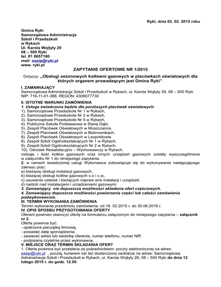 Ryki, dnia 02. 02. 2015 roku Gmina Ryki Samorządowa Administracja Szkół i Przedszkoli w Rykach Ul. Karola Wojtyły 29 08 – 500 Ryki tel. 81 8657180 mail: [email protected] www. ryki.pl ZAPYTANIE OFERTOWE NR 1/2015 Dotyczy: „Obsługi sezonowych kotłowni gazowych w placówkach oświatowych dla których organem prowadzącym jest Gmina Ryki” . I. ZAMAWIAJĄCY Samorządowa Administracja Szkół i Przedszkoli w Rykach, ul. Karola Wojtyły 29, 08 – 500 Ryki NIP: 716-11-01-388, REGON: 4306077730 II. ISTOTNE WARUNKI ZAMÓWIENIA 1. Usługa świadczona będzie dla poniższych placówek oświatowych: 1). Samorządowe Przedszkole Nr 1 w Rykach, 2). Samorządowe Przedszkole Nr 2 w Rykach, 3). Samorządowe Przedszkole Nr 5 w Rykach, 4). Publiczna Szkoła Podstawowa w Starej Dąbi, 5). Zespół Placówek Oświatowych w Moszczance, 7). Zespół Placówek Oświatowych w Bobrownikach, 8). Zespól Placówek Oświatowych w Leopoldowie 8). Zespół Szkół Ogólnokształcących Nr 1 w Rykach, 9). Zespół Szkół Ogólnokształcących Nr 2 w Rykach, 10). Ośrodek Rewalidacyjno – Wychowawczy w Rykach. rodzaje i ilość kotłów gazowych oraz innych urządzeń gazowych zostały wyszczególnione w załączniku Nr 1 do niniejszego zapytania. 2. w ramach świadczonej usługi Wykonawca zobowiązuje się do wykonywania następującego zakresu prac: a) bieżącej obsługi instalacji gazowych, b) bieżącej obsługi kotłów gazowych c.o i c.w., c) usuwanie usterek i bieżących napraw w/w instalacji i urządzeń, d) nadzór nad instalacjami i urządzeniami gazowymi 3. Zamawiający nie dopuszcza możliwości składania ofert częściowych. 4. Zamawiający dopuszcza możliwości powierzenia części lub całości zamówienia podwykonawcom. III. TERMIN WYKONANIA ZAMÓWIENIA Termin wykonania przedmiotu zamówienia: od 16. 02.2015 r. do 30.06.2016 r. IV. OPIS SPOSBU PRZYGOTOWANIA OFERTY Oferent powinien stworzyć ofertę na formularzu załączonym do niniejszego zapytania – załącznik nr 2. Oferta powinna być: - opatrzona pieczątką firmową, - posiadać datę sporządzenia, - zawierać adres lub siedzibę oferenta, numer telefonu, numer NIP, - podpisana czytelnie przez wykonawcę. V. MIEJSCE ORAZ TERMIN SKŁADANIA OFERT 1. Oferta powinna być przesłana za pośrednictwem: poczty elektronicznej na adres: [email protected] , pocztą, kurierem lub też dostarczona osobiście na adres: Samorządowa Administracja Szkół i Przedszkoli w Rykach, ul. Karola Wojtyły 29, 08 – 500 Ryki do dnia 12 lutego 2015 r. do godz. 12.00. 2. Ocena ofert zostanie dokonana w dniu 12 lutego 2015 r, a wyniki i wybór najkorzystniejszej oferty zostanie ogłoszony o godzinie 13:00 w siedzibie Samorządowej Administracji Szkół i Przedszkoli w Rykach oraz na stronie internetowej pod adresem www.ryki.pl 3. Oferty złożone po terminie nie będą rozpatrywane 4. Oferent może przed upływem terminu składania ofert zmienić lub wycofać swoją ofertę. 5. W toku badania i oceny ofert Zamawiający może żądać od oferentów wyjaśnień dotyczących treści złożonych ofert. 6. Zapytanie ofertowe zamieszczono na stronie: BIP Urzędu Miejskiego w Rykach www.ryki.pl VI. OCENA OFERT Zamawiający dokona oceny ważnych ofert na podstawie następujących kryteriów: 1 - Cena 100% ceny VII. INFORMACJE DOTYCZĄCE WYBORU NAJKORZYSTNIEJSZEJ OFERTY O wyborze najkorzystniejszej oferty Zamawiający zawiadomi oferentów za pośrednictwem strony internetowej znajdującej się pod adresem www.ryki.pl VIII. DODATKOWE INFORMACJE Dodatkowych informacji udziela Piotr Sulej – Dyrektor Samorządowej Administracji Szkół i Przedszkoli w Rykach pod numerem telefonu 81 8657180 oraz adresem email: [email protected] IX. ZAŁĄCZNIKI Formularz ofertowy. Załącznik Nr 1 do zapytania ofertowego Wykaz kotłów gazowych i innych urządzeń gazowych znajdujących się w placówkach oświatowych Gminy Ryki Lp Placówka oświatowa Rodzaj kotła (moc) Zespół Szkół Viessmann Werke 1. Ogólnokształcących Nr 1 GmbH 170kW w Rykach Zespół Szkół 2. Ogólnokształcących Nr 2 im. Jana Pawła II w Rykach Piec grzewczy gazowy Typ CA-400, 465:512 kW; moc palnika gazowego ELCO 700 kW Ilość szt. 2 2 3. Zespół Pacówek Oświatowych w Bobrownikach Piec co ViessmannVitodens 300, typ WB3A 66kW 4. Zespół Placówek Oświatowych w Moszczance Kocioł gazowy – R 30/85 kW RENDAMAX 5. Zespół Placówek Oświatowych w Leopoldowie Piec gazowy CO DE DIETRICH 90kW 6. Publiczna Szkoła Podstawowa w Starej Dąbi Piec gazowy ACV HEAT MASTER 63kW 1 7. Samorządowe Przedszkole Nr 1 w Rykach Kocioł kondensacyjny Co Rendamax R30/45 45 kW 1 Samorządowe 8. Przedszkole nr 2 w Rykach 9. Samorządowe Przedszkole Nr 5 w Rykach Kocioł gazowy na ACV typ CA 200 EKON.34 Kocioł gazowy naścienny kondensacyjny typ MCA 45, moc do 43 kW 10 Ośrodek Rewalidacyjno- Kocioł gazowy . Wychowawczy w Rykach IMMERGAS VICTRIX PRO 35-55 1 I Inne urządzenia gazowe Ilość szt. - kuchnia gazowa typ 000KG-4L 1 - taboret gazowy typ 000TG-1F 2 - kocioł warzelny typ KG 150.8 1 - piecyk do ciepłej wody 24kW 1 -Taboret gazowy typ TCZ-ZA 5,2kW 2 - Kocioł warzelny typ KG150.8.II.X 13 kW 2 - Kuchnia gazowa czteropalnikowa typ TGZ-5AIIIxZŁ 10 kW 1 2 1 3 1 2 1 - kuchnia na gaz z butli - kuchnia gazowa Amica 2 - taborety do gotowania gazowe Argos 2 - kuchnia gazowo-elektryczna na gaz małej butli 1 - piecyk gazowy przepływowy Opalia 19kW 1 - taboret gazowy TG-1 1 - kuchnia Gazowa WGZ-4 1 - kuchnia gazowo-elektryczna Mastercook 1 - piecyk gazowy do grzania wody 2 - trzony kuchenne 2 - taboret gazowy kuchenny 1 - kuchnia gazowo-elektryczna 1 - kuchnia gazowa Ewa 2 - taboret gazowy 1 - taboret gazowy typ TG-110 2 - kuchenka gazowa 4 palnikowa 1 Załącznik Nr 2 Formularz ofertowy …........................................................... (miejscowość, data) …...................................................... (pieczęć oferenta) Zamawiający …................................................