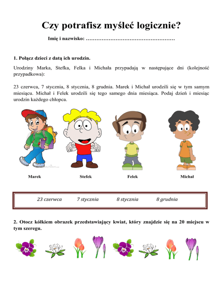 Czy potrafisz myśleć logicznie? Imię i nazwisko: …………………………………………… 1. Połącz dzieci z datą ich urodzin. Urodziny Marka, Stefka, Felka i Michała przypadają w następujące dni (kolejność przypadkowa): 23 czerwca, 7 stycznia, 8 stycznia, 8 grudnia. Marek i Michał urodzili się w tym samym miesiącu. Michał i Felek urodzili się tego samego dnia miesiąca. Podaj dzień i miesiąc urodzin każdego chłopca. Marek 23 czerwca Stefek 7 stycznia Michał Felek 8 stycznia 8 grudnia 2. Otocz kółkiem obrazek przedstawiający kwiat, który znajdzie się na 20 miejscu w tym szeregu. 3. Połącz zwierzę z właścicielem. Każda z dziewcząt: Zosia, Marysia, Julia i Ada hoduje w domu jedno zwierzątko spośród następujących: kot, papużka, kanarek, wąż boa. Jakie zwierzątko hoduje każda z dziewcząt, jeśli wiadomo, że: Marysia nie lubi ptaków? Julia nie hoduje kanarka. Zosia ma zwierzątko o największej liczbie nóg. Wiadomo również, że każda z dziewcząt ma inne zwierzątko. ZOSIA MARYSIA JULIA ADA 4. Odpowiedz na pytanie. Jak mając domową wagę służącą do ważenia ludzi (pokazującą rzeczywistą wagę), zważyć rowerek dziecięcy? …………………………………………………………………………………………………. …………………………………………………………………………………………………. …………………………………………………………………………………………………. 5. Rozwiąż sudoku 3 3 2 4 2 3 6 5 1 1 4 5 2 1 4 1 3 4 2 6 4 2 2 3 5 4 1 5