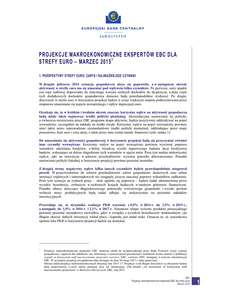 PROJEKCJE MAKROEKONOMICZNE EKSPERTÓW EBC DLA STREFY EURO – MARZEC 2015 1 1. PERSPEKTYWY STREFY EURO: ZARYS I NAJWAŻNIEJSZE CZYNNIKI W drugim półroczu 2014 sytuacja gospodarcza nieco się poprawiła, a w następnym okresie aktywność w strefie euro ma się umacniać pod wpływem kilku czynników. Po pierwsze, ostry spadek cen ropy naftowej doprowadzi do znacznego wzrostu realnych dochodów do dyspozycji, a dużą część tych dodatkowych dochodów gospodarstwa domowe będą prawdopodobnie wydawać. Po drugie, aktywność w strefie euro w horyzoncie projekcji będzie w coraz większym stopniu podtrzymywana przez stopniowe umacnianie się popytu zewnętrznego i wpływ deprecjacji euro. Oczekuje się, że w krótkim i średnim okresie znaczny korzystny wpływ na aktywność gospodarczą będą miały także najnowsze środki polityki pieniężnej. Akomodacyjne nastawienie tej polityki, a zwłaszcza rozszerzenie przez EBC programu skupu aktywów, będzie pozytywnie oddziaływać na popyt wewnętrzny, szczególnie na nakłady na środki trwałe. Korzystny wpływ na popyt wewnętrzny powinny mieć także nowo wprowadzone niestandardowe środki polityki pieniężnej, oddziałujące przez stopy procentowe, kurs euro i ceny akcji, a także przez inne ważne kanały finansowe (zob. ramka 1). Do umacniania się aktywności gospodarczej w horyzoncie projekcji będą się przyczyniać również inne czynniki wewnętrzne. Korzystny wpływ na popyt wewnętrzny powinna wywierać poprawa warunków udzielania kredytów, o której świadczą wyniki najnowszego badania akcji kredytowej banków, wskazujące na dalsze złagodzenie tych warunków w ujęciu netto. Poza tym maleje niekorzystny wpływ, jaki na inwestycje w sektorze przedsiębiorstw wywiera potrzeba delewarowania. Ponadto nastawienie polityki fiskalnej w horyzoncie projekcji powinno pozostać neutralne. Z drugiej strony negatywny wpływ kilku innych czynników będzie prawdopodobnie ustępował powoli. W przeciwieństwie do sektora przedsiębiorstw sektor gospodarstw domowych oraz sektor instytucji rządowych i samorządowych nie osiągnęły jeszcze znacznej poprawy wskaźników zadłużenia. Poza tym sytuacja na rynkach pracy – choć ogólnie się poprawia – będzie nadal zdominowana przez wysokie bezrobocie, zwłaszcza w niektórych krajach będących w trudnym położeniu finansowym. Ponadto obawy dotyczące długookresowego potencjału wzrostowego gospodarki i wysoki poziom wolnych mocy produkcyjnych będą nadal odbijać się niekorzystnie na poziomie nakładów inwestycyjnych. Przewiduje się, że dynamika realnego PKB wzrośnie z 0,9% w 2014 r. do 1,5% w 2015 r., a następnie do 1,9% w 2016 r. i 2,1% w 2017 r. Natomiast tempo wzrostu produktu potencjalnego powinno pozostać stosunkowo niewielkie, gdyż w związku z wysokim bezrobociem strukturalnym i po długim okresie słabych inwestycji wkład pracy i kapitału jest nadal niski. Oznacza to, że szacunkowa ujemna luka PKB w horyzoncie projekcji będzie się domykać. 1 Projekcje makroekonomiczne ekspertów EBC stanowią wkład do przeprowadzanej przez Radę Prezesów oceny sytuacji gospodarczej i zagrożeń dla stabilności cen. Informacje o zastosowanych procedurach i technikach można znaleźć w publikacji A guide to Eurosystem staff macroeconomic projection exercises, EBC, czerwiec 2001, dostępnej w serwisie internetowym EBC. W tej rundzie projekcji uwzględniono dane dostępne do dnia 20 lutego 2015 r. (data graniczna). Obecna runda projekcji makroekonomicznych obejmuje lata 2015–17. Projekcje o tak długim horyzoncie są obciążone bardzo dużą niepewnością, o czym należy pamiętać przy ich interpretacji. Zob. artykuł „An assessment of Eurosystem staff macroeconomic projections” w Biuletynie Miesięcznym, EBC, maj 2013. EBC Projekcje makroekonomiczne ekspertów EBC dla strefy euro Marzec 2015 1 Wykres 1 Projekcje makroekonomiczne 1) (dane kwartalne) Realny PKB strefy euro2) Inflacja HICP w strefie euro (kwartał do kwartału w proc.) (rok do roku w proc.) 1,5 4,5 1,0 4,0 0,5 3,5 0,0 3,0 -0,5 -1,0 -1,5 -2,0 2,5 2,0 1,5 1,0 0,5 -2,5 0,0 -3,0 -0,5 -3,5 -1,0 1) Przedziały wokół projekcji centralnych wyznaczono na podstawie różnic między rzeczywistymi wynikami a wcześniejszymi projekcjami z wielu lat. Rozpiętość przedziałów jest równa dwukrotności średniej wartości bezwzględnej tych różnic. Zastosowana metoda wyznaczania przedziałów, obejmująca korektę z tytułu zdarzeń nadzwyczajnych, została przedstawiona w publikacji New procedure for constructing Eurosystem and ECB staff projection ranges, EBC, grudzień 2009, dostępnej w serwisie internetowym EBC. 2) Dane skorygowane o liczbę dni roboczych. Stopa inflacji HICP była w ostatnich miesiącach ujemna, głównie w związku ze spadkiem cen ropy. Głęboki spadek dolarowych cen tego surowca został jedynie w niewielkiej części zrównoważony przez obniżenie się kursu euro. W ostatnich miesiącach nastąpił również spadek innych składowych HICP. Zgodnie z projekcjami średnia stopa inflacji HICP w 2015 r. ma być zerowa, a następnie powinna wzrosnąć do 1,5% w 2016 r. oraz do 1,8% w 2017 r. Niska stopa inflacji HICP w 2015 r. wynika z dużego ujemnego wkładu składowej „energia”. Jednak spadkowe oddziaływanie cen energii na inflację ogółem powinno pod koniec 2015 r. słabnąć, w miarę jak spadki cen energii z wcześniejszego okresu będą stopniowo eliminowane z obliczania zmiany rok do roku, a także w związku z założeniem wzrostu cen ropy w horyzoncie projekcji zgodnie z rosnącą krzywą terminową cen tego surowca. Przewiduje się, że w wyniku oddziaływania tych czynników wkład cen energii do inflacji ogółem w 2016 i 2017 r. będzie dodatni. Choć skok inflacji między 2015 a 2016 r. w dużej części będzie prawdopodobnie wynikał ze zwrotu cen energii, to jednak wraz z poprawą sytuacji gospodarczej powinna także rosnąć inflacja HICP z wyłączeniem 
