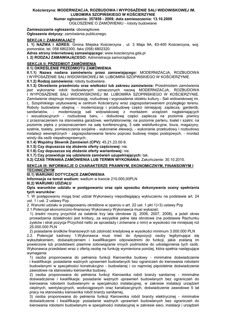 Kościerzyna: MODERNIZACJA, ROZBUDOWA I WYPOSAśENIE SALI WIDOWISKOWEJ IM. LUBOMIRA SZOPIŃSKIEGO W KOŚCIERZYNIE Numer ogłoszenia: 357858 - 2009; data zamieszczenia: 13.10.2009 OGŁOSZENIE O ZAMÓWIENIU - roboty budowlane Zamieszczanie ogłoszenia: obowiązkowe. Ogłoszenie dotyczy: zamówienia publicznego. SEKCJA I: ZAMAWIAJĄCY I. 1) NAZWA I ADRES: Gmina Miejska Kościerzyna , ul. 3 Maja 9A, 83-400 Kościerzyna, woj. pomorskie, tel. 058 6802300, faks (058) 6802320. Adres strony internetowej zamawiającego: www.koscierzyna.gda.pl I. 2) RODZAJ ZAMAWIAJĄCEGO: Administracja samorządowa. SEKCJA II: PRZEDMIOT ZAMÓWIENIA II.1) OKREŚLENIE PRZEDMIOTU ZAMÓWIENIA II.1.1) Nazwa nadana zamówieniu przez zamawiającego: MODERNIZACJA, ROZBUDOWA I WYPOSAśENIE SALI WIDOWISKOWEJ IM. LUBOMIRA SZOPIŃSKIEGO W KOŚCIERZYNIE. II.1.2) Rodzaj zamówienia: roboty budowlane. II.1.3) Określenie przedmiotu oraz wielkości lub zakresu zamówienia: Przedmiotem zamówienia jest wykonanie robót budowlanych oznaczonych nazwą MODERNIZACJA, ROZBUDOWA I WYPOSAśENIE SALI WIDOWISKOWEJ IM. LUBOMIRA SZOPIŃSKIEGO W KOŚCIERZYNIE. Zamówienie obejmuje modernizację, rozbudowę i wyposaŜenie obiektu kultury - Sali widowiskowej im. L. Szopińskiego usytuowanej w centrum Kościerzyny wraz zagospodarowaniem przyległego terenu. Roboty budowlane obejmą: - modernizację i przebudowę części istniejącej: zaplecza, garderób, sanitariatów, - modernizację sali widowiskowej z montaŜem urządzeń nagłaśniających i wizualizacyjnych - rozbudowę baru, - dobudowę części zaplecza na poziomie piwnicy z przeznaczeniem na stanowiska garaŜowe, wentylatorownię; na poziomie parteru, toalet i szatni; na poziomie piętra z przeznaczeniem na salę konferencyjną, 3 sale wielofunkcyjne, biura, magazyny, szatnie, toalety, pomieszczenia socjalne - wykonanie elewacji, - wykonanie przebudowy i rozbudowy instalacji wewnętrznych - zagospodarowanie terenu poprzez budowę miejsc postojowych, - montaŜ windy dla osób niepełnosprawnych.. II.1.4) Wspólny Słownik Zamówień (CPV): 45.21.23.00-9. II.1.5) Czy dopuszcza się złoŜenie oferty częściowej: nie. II.1.6) Czy dopuszcza się złoŜenie oferty wariantowej: nie. II.1.7) Czy przewiduje się udzielenie zamówień uzupełniających: tak. II.2) CZAS TRWANIA ZAMÓWIENIA LUB TERMIN WYKONANIA: Zakończenie: 30.10.2010. SEKCJA III: INFORMACJE O CHARAKTERZE PRAWNYM, EKONOMICZNYM, FINANSOWYM I TECHNICZNYM III.1) WARUNKI DOTYCZĄCE ZAMÓWIENIA Informacja na temat wadium: wadium w kwocie 210.000,00PLN III.2) WARUNKI UDZIAŁU Opis warunków udziału w postępowaniu oraz opis sposobu dokonywania oceny spełniania tych warunków: 1. W postępowaniu mogą brać udział Wykonawcy niepodlegający wykluczeniu na podstawie art. 24 ust. 1 i ust. 2 ustawy Pzp. 2. Warunki udziału w postępowaniu określone w oparciu o art. 22 ust. 1 pkt 1)÷3) ustawy Pzp 2.1.Potencjał ekonomiczno-finansowy Wykonawcy Wykonawca musi wykazać: 1) średni roczny przychód za ostatnie trzy lata obrotowe (tj. 2006, 2007, 2008), a jeŜeli okres prowadzenia działalności jest krótszy, za wszystkie pełne lata obrotowe (na podstawie Rachunku zysków i strat pozycja Przychód netto ze sprzedaŜy i zrównane z nimi) w wysokości nie mniejszej niŜ 25.000.000 PLN 2) posiadanie środków finansowych lub zdolność kredytową w wysokości minimum 3.000.000 PLN 2.2. Potencjał kadrowy 1.Wykonawca musi mieć do dyspozycji osoby legitymujące się wykształceniem, doświadczeniem i kwalifikacjami odpowiednimi do funkcji, jakie zostaną im powierzone lub przedstawić pisemne zobowiązanie innych podmiotów do udostępnienia tych osób. Wykonawca przedstawi wraz z ofertą osobę na funkcję wymieniona poniŜej, która spełnia następujące wymagania: 1) osoba proponowana do pełnienia funkcji Kierownika budowy - minimalne doświadczenie i kwalifikacje: posiadanie waŜnych uprawnień budowlanych bez ograniczeń do kierowania robotami budowlanymi w specjalności konstrukcyjno - budowlanej i co najmniej pięcioletnie doświadczenie zawodowe na stanowisku kierownika budowy, 2) osoba proponowana do pełnienia funkcji Kierownika robót branŜy sanitarnej - minimalne doświadczenie i kwalifikacje: posiadanie waŜnych uprawnień budowlanych bez ograniczeń do kierowania robotami budowlanymi w specjalności instalacyjnej, w zakresie instalacji urządzeń cieplnych, wentylacyjnych, wodociągowych oraz kanalizacyjnych, doświadczenie zawodowe 5 lat pracy na stanowisku kierownika robót branŜy sanitarnej, 3) osoba proponowana do pełnienia funkcji Kierownika robót branŜy elektrycznej - minimalne doświadczenie i kwalifikacje: posiadanie waŜnych uprawnień budowlanych bez ograniczeń do kierowania robotami budowlanymi w specjalności instalacyjnej w zakresie sieci, instalacji i urządzeń elektrycznych oraz elektroenergetycznych, doświadczenie zawodowe 5 lat pracy na stanowisku kierownika robót branŜy energetycznej. a) Osoba wskazana na w/w stanowisko winna posiadać uprawnienia budowlane do kierowania robotami zgodnie z ustawa Prawo Budowlane w podanej wymaganej branŜy oraz przynaleŜeć do Polskiej (właściwej) Izby InŜynierów Budownictwa b) Przez wymagane minimalne doświadczenie zawodowe na w/w stanowisku rozumie się łączną ilość miesięcy (lat) przepracowanych na stanowisku jak proponowane, przy realizacji podobnych robót c) Do doświadczenia zawodowego na stanowisku Kierownika budowy/robót nie zalicza się okresu zatrudnienia danej osoby na innych budowach w tym samym czasie d)Zamawiający dopuszcza łączenie stanowisk. 2. Wykonawca zatrudniał średniorocznie w okresie ostatnich trzech lat, a jeŜeli okres prowadzenia działalności jest krótszy to w tym okresie, minimum 80 pracowników. 2.3. Doświadczenie Wykonawcy Wykonawca musi wykazać, Ŝe w okresie ostatnich 5 lat przed dniem wszczęcia niniejszego postępowania o udzielenia zamówienia, a jeŜeli okres prowadzenia działalności jest krótszy - w tym o