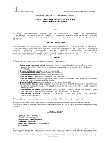 ART OF PACKAGING Regulamin konkursu ART OF PACKAGING DEBIUTY REGULAMIN KONKURSU ART OF PACKAGING – DEBIUTY Konkurs na Najlepsze Opakowanie Roku! Perła wśród Opakowań! 1. CEL 1. Celem ogólnopolskiego Konkursu ART OF PACKAGING – Debiuty jest promowanie i nagradzanie pomysłów młodych artystów w segmencie projektowania opakowań, odkrycie i pokazanie branży opakowaniowej nowych talentów oraz wyjątkowych w formie i wartości użytkowej opakowań. 2. PRZEDMIOT KONKURSU 1. Przedmiotem Konkursu jest wyłonienie najlepszego opakowania, które nie funkcjonuje jeszcze na rynku, oraz zaprezentowanie potencjalnych możliwości wykorzystania go w praktyce. Nagrodzony zostanie najbardziej innowacyjny pomysł (projekt) opakowania, przedstawiony w formie wizualizacji i/lub zdjęć oraz prototypu jako wzoru doświadczalnego, będącego odwzorowaniem zaprojektowanego wyrobu, zgodnie z przesłaną dokumentacją. 3. KATEGORIE 1. Opakowania można zgłaszać w poszczególnych kategoriach: □ Opakowanie Premium & Nature (opakowanie kartonowe dla dóbr luksusowych wykonane z kartonu firmy Stora Enso Performa Brilliance CKB lub CKB Nude. Karton otrzymała każda Uczelnia); □ Opakowanie Urody (opakowanie kosmetyczne); □ Opakowanie Smakowite (opakowanie dla żywności); □ Opakowanie Pragnienia (opakowanie dla napojów); □ Opakowanie Etykieta (projekt etykiety samoprzylepnej); □ Opakowanie Biznes (opakowanie zbiorcze na materiały handlowe i marketingowe, wykonane z tektury) – patrz załączony Brief z opisem; □ Opakowanie Zdrowia (opakowanie na para- lub farmaceutyk); □ Opakowanie Udekorowane (opakowanie lub graficzny projekt propozycji uszlachetnienia butelki na napoje alkoholowe lub bezalkoholowe lub flakonu na kosmetyk) – patrz załączony Brief z opisem; □ Opakowanie na miarę (opakowanie typu SRP, POS z tektury falistej lub kartonu, które w sposób niekonwencjonalny umożliwia dystrybucję/sprzedaż towarów); □ Opakowanie Freestyle (dowolne opakowanie, które nie mieści się tematem w innych kategoriach). 2. Poza głównymi nagrodami przyznane zostaną także wyróżnienia niektórych sponsorów. 3.Przyjmowane będą prace wykonane dowolnymi technikami: ze szkła, metalu, papieru/tektury, tworzyw sztucznych, ceramiki i materiałów kompozytowych, etc. (o ile będą zgodne z wymogami danej kategorii). 4. KRYTERIA OCENY - pomysł – idea – emocje - design – innowacyjność - ergonomia – funkcjonalność - ekologia – recykling - marketing – promocja – komunikacja - wykonanie 1. Prace konkursowe powinny odznaczać się przede wszystkim innowacyjnością, funkcjonalnością, interesującym designem i estetycznym wykonaniem. Ważny jest pomysł, idea oraz towarzyszące temu Biuro konkursu ART OF PACKAGING: ul. Fredry 1/18, 61-701 Poznań, tel.: (61) 855 19 90, fax: (61) 855 19 90 wew. 126, e-mail: [email protected] www.artofpackaging.pl 1 ART OF PACKAGING Regulamin konkursu ART OF PACKAGING DEBIUTY emocje, zamysł ekonomiczny i ekologiczny. Szukamy cech artystycznych w estetycznym technicznie wykonaniu. Szukamy sztuki w opakowaniach. i funkcjonalnych WARUNKI UCZESTNICTWA 1. Konkurs ma charakter otwarty. Może wziąć w nim udział każda osoba, która w chwili przystąpienia do Konkursu jest pełnoletnia, posiada pełną zdolność do czynności prawnych i która samodzielnie zaprojektowała opakowanie oraz posiada prawa autorskie do niego. Plagiat wiąże się z dyskwalifikacją. Uczestnik edycji Debiuty nie może być na stałe zawodowo związany umową o pracę z firmą komercyjną związaną z branżą opakowaniową. 2. Każdy uczestnik może zgłosić nieograniczoną liczbę projektów. Jeden projekt może być zgłoszony tylko do jednej kategorii. Jury może zdecydować o zakwalifikowaniu opakowania do innej kategorii, niż widnieje w zgłoszeniu. 3. Do Konkursu można zgłosić projekt, który jest pracą zbiorową. 4. Zgłoszenie do Konkursu jest bezpłatne. Uczestnik pokrywa jedynie koszty wynikające z przygotowania i przesłania prac. Opakowanie może zgłosić jedynie jego twórca i jednocześnie właściciel (autor). 5. Podstawą przyjęcia zgłoszenia udziału w Konkursie jest: o o o przesłanie płyty CD/DVD lub pendrive’a zawierającego: wypełnioną ankietę zgłoszeniową w postaci cyfrowej (w formacie MS Word) oraz minimum 3 zdjęcia i/lub wizualizacje zgłoszonego rozwiązania opakowaniowego: w postaci cyfrowej, zapisane jako CMYK, w formacie JPG lub PDF, w rozdzielczości 300 dpi, przesłanie prototypu/modelu opakowania jako symulacyjne odwzorowanie określonego przedmiotu wykonane z dowolnego materiału, dołączenie wydrukowanej ankiety zgłoszeniowej z własnoręcznym podpisem. 6. Ankietę zgłoszeniową można pobrać ze strony internetowej www.artofpackaging.pl. 7. Na jednej płycie CD/DVD lub pendrivie można zapisać wszystkie projekty właściwie opisane (z osobną ankietą do każdej pracy). Każdy plik z pracą winien być zapisany nazwą zgłaszanego opakowania, która została umieszczona w ankiecie (np. opakowanie annapurna_anna kowalska). W wypadku pracy zbiorowej współautorzy pierwszą stronę ankiety zawierającą dane osobowe wypełniają osobno. 8. Zgłoszenie do Konkursu wraz z dokumentacją musi dotrzeć do siedziby Organizatora Konkursu pod adresem: EUROPEAN MEDIA GROUP Sp. z o.o., Biuro Konkursu ART OF PACKAGING, ul. Aleksandra Fredry 1/18, 61–701 Poznań, do dnia 23 stycznia 2017 r. 9. Zakończenie Konkursu nastąpi po uroczystym ogłoszeniu jego wyników podczas Gali Finałowej w Poznaniu, która planowana jest w marcu 2017 roku (jej data zostanie ogłoszona odrębnym trybem). 10. Organizator zastrzega sobie prawo do dyskwalifikacji zgłoszenia, jeżeli nie spełnia ono wymogów formalnych oraz ideowych Konkursu. 6. NOMINACJE I NAGRODA GŁÓWNA 1. Nagrodą główną w konkursie ART OF PACKAGING Debiuty jest miano zwycięzcy Konkursu ART OF PACKAGING Debiuty dla Najlepszego Opakowania Roku oraz: a) prestiżowa s