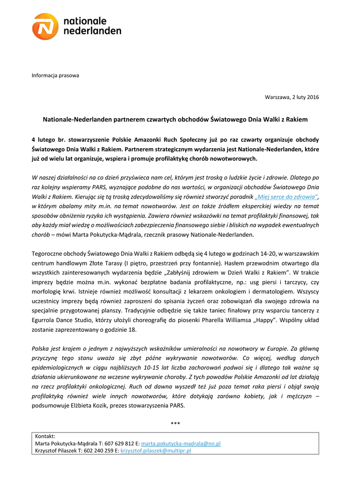 Informacja prasowa Warszawa, 2 luty 2016 Nationale-Nederlanden partnerem czwartych obchodów Światowego Dnia Walki z Rakiem 4 lutego br. stowarzyszenie Polskie Amazonki Ruch Społeczny już po raz czwarty organizuje obchody Światowego Dnia Walki z Rakiem. Partnerem strategicznym wydarzenia jest Nationale-Nederlanden, które już od wielu lat organizuje, wspiera i promuje profilaktykę chorób nowotworowych. W naszej działalności na co dzień przyświeca nam cel, którym jest troską o ludzkie życie i zdrowie. Dlatego po raz kolejny wspieramy PARS, wyznające podobne do nas wartości, w organizacji obchodów Światowego Dnia Walki z Rakiem. Kierując się tą troską zdecydowaliśmy się również stworzyć poradnik „Miej serce do zdrowia”, w którym obalamy mity m.in. na temat nowotworów. Jest on także źródłem eksperckiej wiedzy na temat sposobów obniżenia ryzyka ich wystąpienia. Zawiera również wskazówki na temat profilaktyki finansowej, tak aby każdy miał wiedzę o możliwościach zabezpieczenia finansowego siebie i bliskich na wypadek ewentualnych chorób – mówi Marta Pokutycka-Mądrala, rzecznik prasowy Nationale-Nederlanden. Tegoroczne obchody Światowego Dnia Walki z Rakiem odbędą się 4 lutego w godzinach 14-20, w warszawskim centrum handlowym Złote Tarasy (I piętro, przestrzeń przy fontannie). Hasłem przewodnim otwartego dla wszystkich zainteresowanych wydarzenia będzie „Zabłyśnij zdrowiem w Dzień Walki z Rakiem”. W trakcie imprezy będzie można m.in. wykonać bezpłatne badania profilaktyczne, np.: usg piersi i tarczycy, czy morfologię krwi. Istnieje również możliwość konsultacji z lekarzem onkologiem i dermatologiem. Wszyscy uczestnicy imprezy będą również zaproszeni do spisania życzeń oraz zobowiązań dla swojego zdrowia na specjalnie przygotowanej planszy. Tradycyjnie odbędzie się także taniec finałowy przy wsparciu tancerzy z Egurrola Dance Studio, którzy ułożyli choreografię do piosenki Pharella Williamsa „Happy”. Wspólny układ zostanie zaprezentowany o godzinie 18. Polska jest krajem o jednym z najwyższych wskaźników umieralności na nowotwory w Europie. Za główną przyczynę tego stanu uważa się zbyt późne wykrywanie nowotworów. Co więcej, według danych epidemiologicznych w ciągu najbliższych 10-15 lat liczba zachorowań podwoi się i dlatego tak ważne są działania ukierunkowane na wczesne wykrywanie choroby. Z tych powodów Polskie Amazonki od lat działają na rzecz profilaktyki onkologicznej. Ruch od dawna wyszedł też już poza temat raka piersi i objął swoją profilaktyką również wiele innych nowotworów, które dotykają zarówno kobiety, jak i mężczyzn – podsumowuje Elżbieta Kozik, prezes stowarzyszenia PARS. *** Kontakt: Marta Pokutycka-Mądrala T: 607 629 812 E: [email protected] Krzysztof Pilaszek T: 602 240 259 E: [email protected] Nationale-Nederlanden oferuje produkty ubezpieczeniowe, emerytalne i inwestycyjne zabezpieczając finansową przyszłość swoich Klientów i ich bliskich. Jako firma odpowiedzialna społecznie angażuje się również i działa w obszarze istotnych problemów społecznych dotyczących zdrowia i jakości życia Polaków. Nationale-Nederlanden Towarzystwo Ubezpieczeń na Życie S.A. rozpoczęło działalność w Polsce 2 sierpnia 1994 roku na podstawie zezwolenia Ministra Finansów. Nationale-Nederlanden TUnŻ jest częścią NN Group N.V., spółki notowanej na giełdzie w Amsterdamie, która powstała w wyniku wydzielenia z Grupy ING działalności ubezpieczeniowej i zarządzania aktywami.