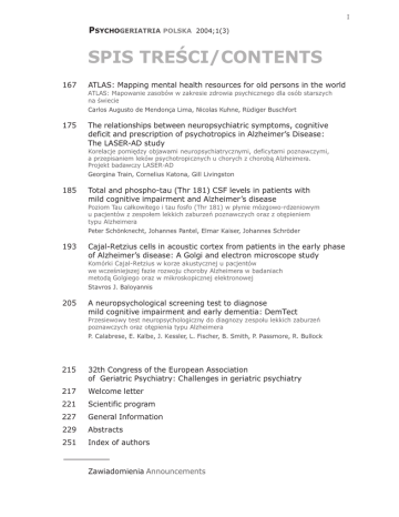 I PSYCHOGERIATRIA POLSKA 2004;1(3) SPIS TRECI/CONTENTS 167 ATLAS: Mapping mental health resources for old persons in the world ATLAS: Mapowanie zasobów w zakresie zdrowia psychicznego dla osób starszych na wiecie Carlos Augusto de Mendonça Lima, Nicolas Kuhne, Rüdiger Buschfort 175 The relationships between neuropsychiatric symptoms, cognitive deficit and prescription of psychotropics in Alzheimers Disease: The LASER-AD study Korelacje pomiêdzy objawami neuropsychiatrycznymi, deficytami poznawczymi, a przepisaniem leków psychotropicznych u chorych z chorob¹ Alzheimera. Projekt badawczy LASER-AD Georgina Train, Cornelius Katona, Gill Livingston 185 Total and phospho-tau (Thr 181) CSF levels in patients with mild cognitive impairment and Alzheimers disease Poziom Tau ca³kowitego i tau fosfo (Thr 181) w p³ynie mózgowo-rdzeniowym u pacjentów z zespo³em lekkich zaburzeñ poznawczych oraz z otêpieniem typu Alzheimera Peter Schönknecht, Johannes Pantel, Elmar Kaiser, Johannes Schröder 193 Cajal-Retzius cells in acoustic cortex from patients in the early phase of Alzheimers disease: A Golgi and electron microscope study Komórki Cajal-Retzius w korze akustycznej u pacjentów we wczeniejszej fazie rozwoju choroby Alzheimera w badaniach metod¹ Golgiego oraz w mikroskopicznej elektronowej Stavros J. Baloyannis 205 A neuropsychological screening test to diagnose mild cognitive impairment and early dementia: DemTect Przesiewowy test neuropsychologiczny do diagnozy zespo³u lekkich zaburzeñ poznawczych oraz otêpienia typu Alzheimera P. Calabrese, E. Kalbe, J. Kessler, L. Fischer, B. Smith, P. Passmore, R. Bullock 215 32th Congress of the European Association of Geriatric Psychiatry: Challenges in geriatric psychiatry 217 Welcome letter 221 Scientific program 227 General Information 229 Abstracts 251 Index of authors Zawiadomienia Announcements II Redaktor Naczelny/Editor-in-Chief Jerzy Leszek (Wroc³aw, Poland) Poprzedni Redaktor Naczelny i Za³o¿yciel/Founding Editor and Past Editor in Chief Adam Bilikiewicz (Gdañsk, Poland) Redaktor Naukowy/Scientific Editor Andrzej Kiejna (Wroc³aw, Poland) Redaktor Miêdzynarodowy/International Editor Ralf Ihl (Düsseldorf, Germany) Rada Naukowa/Editorial Board Aleksander Araszkiewicz (Bydgoszcz, Poland) Stavros Baloyannis (Thessaloniki, Greece) Leszek Bidzan (Gdañsk, Poland) Adam Bilikiewicz (Gdañsk, Poland) Jason Brown (New York, USA) Pasquale Calabrese (Bochum, Germany) Salvatore DiMauro (New York, USA) Knut Engedal (Oslo, Norway) Tomasz Gabryelewicz (Warszawa, Poland) Andrzej Górski (Wroc³aw, Poland) Lars Gustafson (Lund, Sweden) Marek Jarema (Warszawa, Poland) Marek Jutel (Wroc³aw, Poland) Thomas Kallert (Dresden, Germany) Siegfried Kanowski (Berlin, Germany) Cornelius Katona (London, Great Britain) Iwona K³oszewska (£ód, Poland) Raimundo Mateos (Santiago de Compostela, Spain) Konrad Maurer (Frankfurt/Main, Germany) Carlos Augusto de Mendonça Lima (Prilly, Switzerland) Bruce Duncan MacQueen (Bydgoszcz, Poland) Janusz Mory (Gdañsk, Poland) Grzegorz Opala (Katowice, Poland) Tadeusz Parnowski (Warszawa, Poland) Maria P¹chalska (Kraków, Poland) Michael Philpot (London, Great Britain) Ryszard Podemski (Wroc³aw, Poland) Martin Prince (London, Great Britain) Stanis³aw Pu¿yñski (Warszawa, Poland) Jiøi Raboch (Prague, Czech Republic) Jarl Risberg (Lund, Sweden) Joanna Rymaszewska (Wroc³aw, Poland) Johannes Schröder (Heidelberg, Germany) Andrzej Szczudlik (Kraków, Poland) Nicoleta Tataru (Oradea, Romania) Stanis³aw Wolfarth (Kraków, Poland) Jerzy Vetulani (Kraków, Poland) Kolegium Redakcyjne/Executive Board Jerzy Leszek, Andrzej Kiejna, Ralf Ihl, Joanna Rymaszewska, Aleksandra Zawadzka, Tomasz Adamowski Sekretarz Redakcyjny/Editorial Secretary Aleksandra Zawadzka e-mail: [email protected] Adres Korespondencyjny Redakcji/Correspondence Address PSYCHOGERIATRIA POLSKA 50-119 Wroc³aw, ul. No¿ownicza 4/8, Poland tel. (+48) (71) 343 21 52; fax (+48) (71) 343 21 55 Dzia³ Reklamy i Marketingu/Advertising and Marketing Section Tomasz Adamowski e-mail: [email protected] Redakcja nie odpowiada za treæ zamieszczonych reklam Projekt graficzny/design: Pawe³ Jaszczuk Sk³ad i druk/press: Mediacom sp. z o.o., www.mediacom.com.pl Wydawca/Publisher FUNDACJA OCHRONY ZDROWIA PSYCHICZNEGO FOUNDATION OF MENTAL HEALTH 50-119 Wroc³aw, ul. No¿ownicza 4/8, Poland http://www.fozp.org.pl nak³ad 1000 egz. Copyright ©2004 Fundacja Ochrony Zdrowia Psychicznego III PSYCHOGERIATRIA POLSKA 2004;1(3) Od Redakcji Szanowni Pañstwo, Drogie Kole¿anki i Koledzy, Z radoci¹ oddajemy w Wasze rêce trzeci numer Psychogeriatrii Polskiej, który przygotowany zosta³ z okazji 32th European Association of Geriatric Psychiatry, odbywaj¹cego siê w tym roku w dniach 23-25 wrzenia w Oslo. Mo¿liwoæ uczestniczenia, poprzez t¹ edycjê czasopisma, w tak wa¿nym wydarzeniu, stanowi dla Redakcji du¿e wyró¿nienie. Niech wiadczy to równie¿ o naszym sta³ym d¹¿eniu, by Psychogeriatria Polska, której numer zerowy powsta³ dla potrzeb organizowanego we Wroc³awiu 31 Kongresu EAGP, by³a platform¹ wymiany myli dla klinicystów i naukowców z ca³ej Europy. Temu celowi s³u¿yæ ma równie¿ publikowanie artyku³ów angielskojêzycznych, wprowadzenie mo¿liwoci prenumeraty on- line, a tak¿e starania Redakcji o jak najszybsze zarejestrowanie kwartalnika w EMBASE / Excerpta Medica. Równoczenie pragniemy poinformowaæ, ¿e czasopismo Psychogeriatria Polska otrzyma³o 3 punkty KBN, co stanowi najwy¿sz¹ mo¿liw¹ ocenê dla czasopisma w pierwszym roku wydawania. Mamy nadziejê, i¿ zabiegi te przybli¿¹ pismo czytelnikom zagranicznym, a jednoczenie stan¹ siê dla nas czynnikiem mobilizuj¹cym, aby kwartalnik uzyska³ miêdzynarodow¹ rangê. Trzeci numer Psychogeriatrii Polskiej sk³ada siê z dwóch czêci. W pierwszej zamieszczone zosta³y artyku³y cz³onków Rady Naukowej, cenionych specjalistów z tej dziedziny psychiatrii. Druga czêæ to program zjazdu oraz