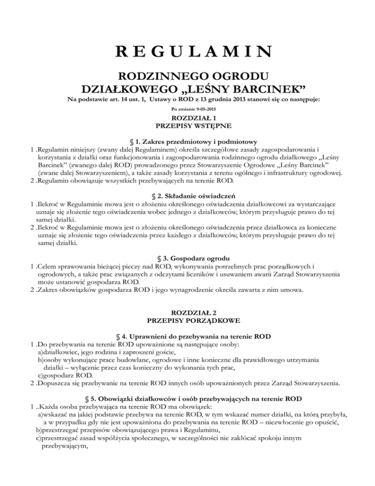 REGULAMIN RODZINNEGO OGRODU DZIAŁKOWEGO „LEŚNY BARCINEK” Na podstawie art. 14 ust. 1, Ustawy o ROD z 13 grudnia 2013 stanowi się co następuje: Po zmianie 9-05-2015 ROZDZIAŁ 1 PRZEPISY WSTĘPNE § 1. Zakres przedmiotowy i podmiotowy 1 .Regulamin niniejszy (zwany dalej Regulaminem) określa szczegółowe zasady zagospodarowania i korzystania z działki oraz funkcjonowania i zagospodarowania rodzinnego ogrodu działkowego „Leśny Barcinek” (zwanego dalej ROD) prowadzonego przez Stowarzyszenie Ogrodowe „Leśny Barcinek” (zwane dalej Stowarzyszeniem), a także zasady korzystania z terenu ogólnego i infrastruktury ogrodowej. 2 .Regulamin obowiązuje wszystkich przebywających na terenie ROD. § 2. Składanie oświadczeń 1 .Ilekroć w Regulaminie mowa jest o złożeniu określonego oświadczenia działkowcowi za wystarczające uznaje się złożenie tego oświadczenia wobec jednego z działkowców, którym przysługuje prawo do tej samej działki. 2 .Ilekroć w Regulaminie mowa jest o złożeniu określonego oświadczenia przez działkowca za konieczne uznaje się złożenie tego oświadczenia przez każdego z działkowców, którym przysługuje prawo do tej samej działki. § 3. Gospodarz ogrodu 1 .Celem sprawowania bieżącej pieczy nad ROD, wykonywania potrzebnych prac porządkowych i ogrodowych, a także prac związanych z odczytami liczników i usuwaniem awarii Zarząd Stowarzyszenia może ustanowić gospodarza ROD. 2 .Zakres obowiązków gospodarza ROD i jego wynagrodzenie określa zawarta z nim umowa. ROZDZIAŁ 2 PRZEPISY PORZĄDKOWE § 4. Uprawnieni do przebywania na terenie ROD 1 .Do przebywania na terenie ROD upoważnione są następujące osoby: a)działkowiec, jego rodzina i zaproszeni goście, b)osoby wykonujące prace budowlane, ogrodowe i inne konieczne dla prawidłowego utrzymania działki – wyłącznie przez czas konieczny do wykonania tych prac, c)gospodarz ROD. 2 .Dopuszcza się przebywanie na terenie ROD innych osób upoważnionych przez Zarząd Stowarzyszenia. § 5. Obowiązki działkowców i osób przebywających na terenie ROD 1 ..Każda osoba przebywająca na terenie ROD ma obowiązek: a)wskazać na jakiej podstawie przebywa na terenie ROD, w tym wskazać numer działki, na którą przybyła, a w przypadku gdy nie jest upoważniona do przebywania na terenie ROD – niezwłocznie go opuścić, b)przestrzegać przepisów obowiązującego prawa i Regulaminu, c)przestrzegać zasad współżycia społecznego, w szczególności nie zakłócać spokoju innym przebywającym, d)dbać o roślinność w ROD i infrastrukturę ROD, w szczególności nie niszczyć oraz nie usuwać jakichkolwiek nasadzeń i urządzeń w ROD. e)zamykania bramy wjazdowej oraz furtki na klucz 2. Każdy działkowiec ma ponadto obowiązek: a)dbać o estetyczny wygląd działki i terenów ogólnych ROD do niej przyległych, b)aktualizować swoje dane osobowe i adresowe w Zarządzie Stowarzyszenia c)działać w interesie ROD, d)zapewnić przestrzeganie niniejszego Regulaminu przez osoby wykonujące na jego zlecenie prace w ROD lub przebywające na terenie ROD jako jego goście. 3. W celu sprawdzenia stanu zagospodarowania działki, odczytu liczników wody i energii elektrycznej, sprawdzenia prawidłowości podłączeń instalacji elektrycznej i wodociągowej, działkowiec ma obowiązek umożliwić wstęp na działkę i do altany - domku działkowego osobom upoważnionym przez organy Stowarzyszenia. 4. Działkowiec ponosi odpowiedzialność za skutki niezgłoszenia zmiany danych osobowych, które mogły mieć wpływ na decyzje Zarządu Stowarzyszenia związane z prawem do działki, § 6. Poruszanie się po ROD 1 .Na teren ROD dopuszcza się wjazd samochodów osobowych oraz silnikowych pojazdów jednośladowych osób upoważnionych do przebywania w ROD, a także wjazd innych pojazdów silnikowych o ile jest on konieczny dla wykonania prac, o którym mowa w § 4 ust. 1 b). 2 .W ROD dopuszcza się parkowanie pojazdów w następujących miejscach: a)na wyznaczonych parkingach i miejscach postojowych, b)na działce, c)bezpośrednio przy granicy działki, o ile nie utrudnia to korzystania z sąsiednich działek, poruszania się po ROD i nie szkodzi infrastrukturze ogrodowej ROD. 3.Na terenie ROD zabrania się jazdy pojazdami silnikowymi w innych celach niż dojazd na działkę i wyjazd z działki oraz jazdy quadami. § 7. Zachowanie ciszy i spokoju 1 .W ROD obowiązuje cisza nocna w godzinach od 22.00 do 7.00. 2 .Zarząd Stowarzyszenia może skrócić godziny ciszy nocnej w określone dni roku z uwagi na organizowane w ROD imprezy integracyjne lub z innych ważnych przyczyn. 3 .W ROD zabrania się: a)prowadzenia głośnych prac, w szczególności koszenia trawy i przycinania żywopłotów oraz używania innych narzędzi spalinowych lub głośnych urządzeń elektrycznych w niedziele, święta, a także w soboty po godz. 18.00 – dotyczy wyłącznie czerwca, lipca i sierpnia każdego roku. b)głośnego słuchania muzyki, c)polowania, d)detonowania petard i innych ładunków wybuchowych, e)strzelania z wszelkiej broni, w tym także pneumatycznej, § 8. Zwierzęta 1 .Działkowiec obowiązany jest zapewnić odpowiednie warunki sanitarne dla trzymanych zwierząt, sprzątać po nich, a także zapewnić, aby zwierzęta te nie zakłócały spokoju innym działkowcom oraz nie niszczyły roślinności w ROD i infrastruktury ogrodowej ROD. 2 .W ROD zabrania się: a)prowadzenia stałej hodowli jakichkolwiek zwierząt. b)trzymania na stałe zwierząt w tym psów i kotów, c)wyprowadzania psów bez smyczy i kagańca niezależnie od ich wielkości. § 9. Odpady i nieczystości 1 .Odpady organiczne powinny być gromadzone na kompostowniku. 2 .Odpady komunalne i inne odpady podlegające sortowaniu powinny być sortowane i wyrzucane do odpowiednich ogrodowych pojemników na śmieci. 3 .W ROD zabrania się: a)zanieczyszczania działek i terenu ogólnego ROD jakimikolwiek odpadami w tym organicznymi, b)spalania ja
