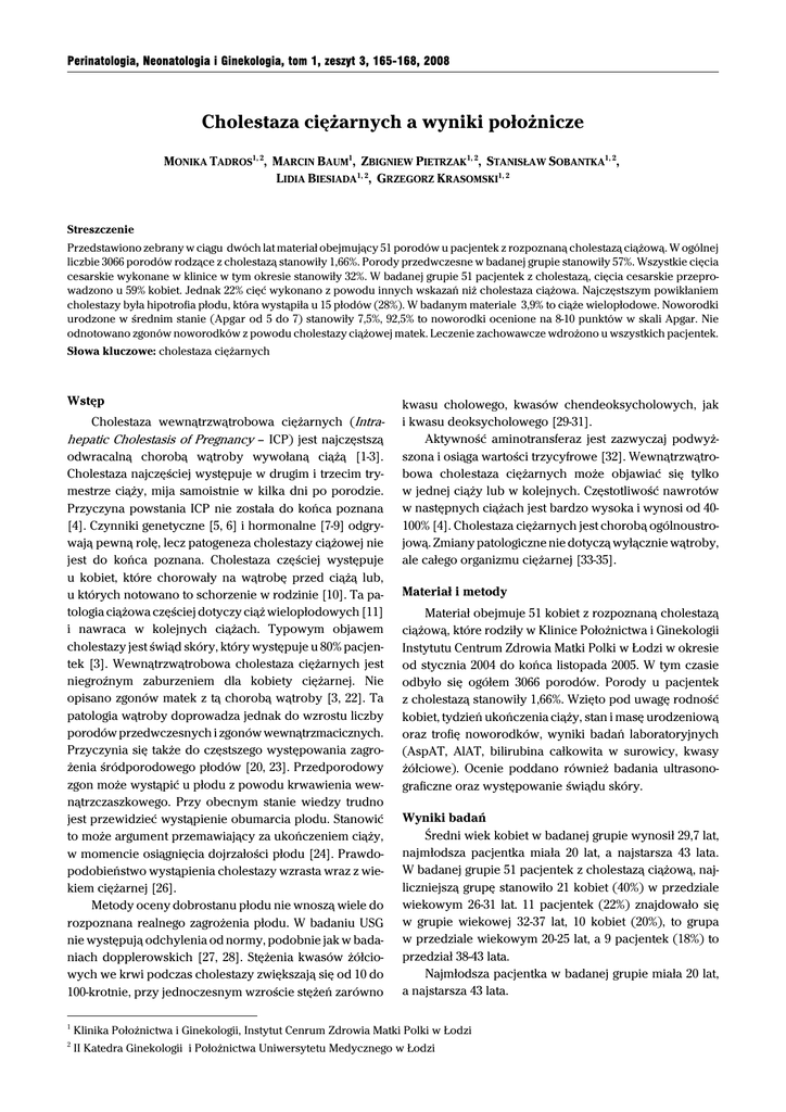 Perinatologia, Neonatologia i Ginekologia, tom 1, zeszyt 3, 165-168, 2008 Cholestaza ciężarnych a wyniki położnicze MONIKA TADROS1, 2, MARCIN BAUM1, ZBIGNIEW PIETRZAK1, 2, STANISŁAW SOBANTKA1, 2, LIDIA BIESIADA1, 2, GRZEGORZ KRASOMSKI1, 2 Streszczenie Przedstawiono zebrany w ciągu dwóch lat materiał obejmujący 51 porodów u pacjentek z rozpoznaną cholestazą ciążową. W ogólnej liczbie 3066 porodów rodzące z cholestazą stanowiły 1,66%. Porody przedwczesne w badanej grupie stanowiły 57%. Wszystkie cięcia cesarskie wykonane w klinice w tym okresie stanowiły 32%. W badanej grupie 51 pacjentek z cholestazą, cięcia cesarskie przeprowadzono u 59% kobiet. Jednak 22% cięć wykonano z powodu innych wskazań niż cholestaza ciążowa. Najczęstszym powikłaniem cholestazy była hipotrofia płodu, która wystąpiła u 15 płodów (28%). W badanym materiale 3,9% to ciąże wielopłodowe. Noworodki urodzone w średnim stanie (Apgar od 5 do 7) stanowiły 7,5%, 92,5% to noworodki ocenione na 8-10 punktów w skali Apgar. Nie odnotowano zgonów noworodków z powodu cholestazy ciążowej matek. Leczenie zachowawcze wdrożono u wszystkich pacjentek. Słowa kluczowe: cholestaza ciężarnych Wstęp Cholestaza wewnątrzwątrobowa ciężarnych (Intrahepatic Cholestasis of Pregnancy – ICP) jest najczęstszą odwracalną chorobą wątroby wywołaną ciążą [1-3]. Cholestaza najczęściej występuje w drugim i trzecim trymestrze ciąży, mija samoistnie w kilka dni po porodzie. Przyczyna powstania ICP nie została do końca poznana [4]. Czynniki genetyczne [5, 6] i hormonalne [7-9] odgrywają pewną rolę, lecz patogeneza cholestazy ciążowej nie jest do końca poznana. Cholestaza częściej występuje u kobiet, które chorowały na wątrobę przed ciążą lub, u których notowano to schorzenie w rodzinie [10]. Ta patologia ciążowa częściej dotyczy ciąż wielopłodowych [11] i nawraca w kolejnych ciążach. Typowym objawem cholestazy jest świąd skóry, który występuje u 80% pacjentek [3]. Wewnątrzwątrobowa cholestaza ciężarnych jest niegroźnym zaburzeniem dla kobiety ciężarnej. Nie opisano zgonów matek z tą chorobą wątroby [3, 22]. Ta patologia wątroby doprowadza jednak do wzrostu liczby porodów przedwczesnych i zgonów wewnątrzmacicznych. Przyczynia się także do częstszego występowania zagrożenia śródporodowego płodów [20, 23]. Przedporodowy zgon może wystąpić u płodu z powodu krwawienia wewnątrzczaszkowego. Przy obecnym stanie wiedzy trudno jest przewidzieć wystąpienie obumarcia plodu. Stanowić to może argument przemawiający za ukończeniem ciąży, w momencie osiągnięcia dojrzałości płodu [24]. Prawdopodobieństwo wystąpienia cholestazy wzrasta wraz z wiekiem ciężarnej [26]. Metody oceny dobrostanu płodu nie wnoszą wiele do rozpoznana realnego zagrożenia płodu. W badaniu USG nie występują odchylenia od normy, podobnie jak w badaniach dopplerowskich [27, 28]. Stężenia kwasów żółciowych we krwi podczas cholestazy zwiększają się od 10 do 100-krotnie, przy jednoczesnym wzroście stężeń zarówno kwasu cholowego, kwasów chendeoksycholowych, jak i kwasu deoksycholowego [29-31]. Aktywność aminotransferaz jest zazwyczaj podwyższona i osiąga wartości trzycyfrowe [32]. Wewnątrzwątrobowa cholestaza ciężarnych może objawiać się tylko w jednej ciąży lub w kolejnych. Częstotliwość nawrotów w następnych ciążach jest bardzo wysoka i wynosi od 40100% [4]. Cholestaza ciężarnych jest chorobą ogólnoustrojową. Zmiany patologiczne nie dotyczą wyłącznie wątroby, ale całego organizmu ciężarnej [33-35]. Materiał i metody Materiał obejmuje 51 kobiet z rozpoznaną cholestazą ciążową, które rodziły w Klinice Położnictwa i Ginekologii Instytutu Centrum Zdrowia Matki Polki w Łodzi w okresie od stycznia 2004 do końca listopada 2005. W tym czasie odbyło się ogółem 3066 porodów. Porody u pacjentek z cholestazą stanowiły 1,66%. Wzięto pod uwagę rodność kobiet, tydzień ukończenia ciąży, stan i masę urodzeniową oraz trofię noworodków, wyniki badań laboratoryjnych (AspAT, AlAT, bilirubina całkowita w surowicy, kwasy żółciowe). Ocenie poddano również badania ultrasonograficzne oraz występowanie świądu skóry. Wyniki badań Średni wiek kobiet w badanej grupie wynosił 29,7 lat, najmłodsza pacjentka miała 20 lat, a najstarsza 43 lata. W badanej grupie 51 pacjentek z cholestazą ciążową, najliczniejszą grupę stanowiło 21 kobiet (40%) w przedziale wiekowym 26-31 lat. 11 pacjentek (22%) znajdowało się w grupie wiekowej 32-37 lat, 10 kobiet (20%), to grupa w przedziale wiekowym 20-25 lat, a 9 pacjentek (18%) to przedział 38-43 lata. Najmłodsza pacjentka w badanej grupie miała 20 lat, a najstarsza 43 lata. 1 Klinika Położnictwa i Ginekologii, Instytut Cenrum Zdrowia Matki Polki w Łodzi 2 II Katedra Ginekologii i Położnictwa Uniwersytetu Medycznego w Łodzi 166 M. Tadros, M. Baum, Z. Pietrzak et al. Pierworódki stanowiły 65% (33 pacjentki) ciężarnych z cholestazą w badanej grupie 35% (18 pacjentek) – wieloródki 3,9% to ciąże wielopłodowe. Badania laboratoryjne prób wątrobowych były podwyższone w 90% przypadków. Tylko 10% ciężarnych miało prawidłowe wartości AspAT, AlAT. Badanie stężenia kwasów żółciowych określono 50 pacjentkom, stwierdzając wartości powyżej normy aż u 97% kobiet. Średnie wartości AspAT wynosiły 184 IU/l, AlAT 347 IU/l, bilirubiny całkowitej 0,64 μmol/l, kwasów żółciowych 24 mg/dl. Główny objaw cholestazy ciążowej, jakim jest świąd skóry, wystąpił u 37 pacjentek (73%). Ze względu na dynamikę rozwoju cholestazy ciążowej mogliśmy wyodrębnić dwie grupy pacjnetek: – pacjentki z cholestazą umiarkowaną – gdzie przyrost wartości aminotransferaz oraz kwasów żółciowych następował powoli – 39 ciężarnych (76%), – pacjentki z ciężką postacią cholestazy – gdzie mimo zastosowanego lecz