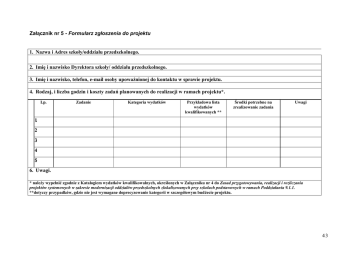 Załącznik nr 5 - Formularz zgłoszenia do projektu 1. Nazwa i Adres szkoły/oddziału przedszkolnego. 2. Imię i nazwisko Dyrektora szkoły/ oddziału przedszkolnego. 3. Imię i nazwisko, telefon, e-mail osoby upoważnionej do kontaktu w sprawie projektu. 4. Rodzaj, i liczba godzin i koszty zadań planowanych do realizacji w ramach projektu*. Lp. Zadanie Kategoria wydatków Przykładowa lista wydatków kwalifikowanych ** Środki potrzebne na zrealizowanie zadania Uwagi 1. 2. 3. 4. 5. 6. Uwagi. * należy wypełnić zgodnie z Katalogiem wydatków kwalifikowalnych, określonych w Załączniku nr 4 do Zasad przygotowywania, realizacji i rozliczania projektów systemowych w zakresie modernizacji oddziałów przedszkolnych zlokalizowanych przy szkołach podstawowych w ramach Poddziałania 9.1.1. **dotyczy przypadków, gdzie nie jest wymagane doprecyzowanie kategorii w szczegółowym budżecie projektu. 43 Załącznik nr 6 – Wzór wniosku o dofinansowanie Wniosek o dofinansowanie projektu nale ży przygotować zgodnie z zaleceniami zawartymi w dokumencie Instrukcja wypełniania wniosku o dofinansowanie projektu w ramach Programu Operacyjnego Kapitał Ludzki. Niniejsza instrukcja jest jedynie uzupełnieniem instrukcji ogólnej i wskazuje sposób wypełniania poszczególnych pól we wniosku dla projektów systemowych realizowanych w ramach Poddziałania 9.1.1. Do wszystkich kwestii nieuregulowanych niniejszą instrukcją zastosowanie mają zapisy instrukcji ogólnej. 3.1.1 Uzasadnienie potrzeby realizacji projektu Uzasadniając potrzebę realizacji projektu projektodawca musi precyzyjnie wskaza ć rozpoznane problemy, na które odpowiedź stanowi cel projektu, a do rozwiązania czy też złagodzenia których powinien przyczynić się projekt. W uzasadnieniu powinny znaleźć się informacje dotyczące: stopnia upowszechnienia edukacji przedszkolnej w gminie, na terenie której funkcjonują oddziały przedszkolne planowane do objęcia wsparciem w ramach projektu; UWAGA: Przez wskaźnik upowszechnienia edukacji przedszkolnej należy rozumieć procent dzieci objętych wychowaniem przedszkolnym, tj. stosunek liczby dzieci w wieku 3-5 lat objętych wychowaniem przedszkolnym do liczby populacji dzieci w wieku 3-5 lat w gminie, pomnożone przez 100%. liczby oddziałów przedszkolnych funkcjonujących na terenie gminy i planowanych do objęcia wsparciem oraz liczbę placówek tj. szkół, w których te oddziały występują; UWAGA: Jeśli oddział przedszkolny jest łączony z oddziałem szkolnym (np. I klasą), to należy wykazać, jaką część oddziału łączonego stanowi oddział przedszkolny oraz wykazać tylko dzieci objęte wychowaniem przedszkolnym. problemów gminy, na terenie której funkcjonują oddziały przedszkolne planowane do objęcia wsparciem w ramach projektu, z zapewnieniem dostępu do wysokiej jakości edukacji przedszkolnej (z uwzględnieniem informacji nt. przyczyn niskiego poziomu upowszechnienia, funkcjonowania alternatywnych form wczesnej edukacji, ewentualnej konieczności dowożenia dzieci do oddalonych od miejsca zamieszkania placówek itp.) oraz działań podejmowanych w tym zakresie; uzasadnienia dla konieczności skierowania dodatkowego wsparcia do oddziałów przedszkolnych, planowanych do objęcia wsparciem w ramach projektu systemowego (z uwzględnieniem informacji nt. stanu technicznego oddziałów przedszkolnych planowanych do objęcia wsparciem, w tym warunków lokalowych i organizacyjnych, wyposażenia w pomoce dydaktyczne i zabawki edukacyjne). Ponadto, w uzasadnieniu należy opisać w jaki sposób realizacja projektu przyczyni się do zwiększenia dostępności i jakości edukacji przedszkolnej w konkretnej gminie. W związku z charakterem realizowanego wsparcia polegaj ącym tylko na doposażeniu oddziałów przedszkolnych, niniejsze projekty należy traktować jako wyjątek nr 3 od standardu minimum (zamknięta rekrutacja). Przedmiotowa informacja powinna zostać umieszczone w ramach wniosku o dofinansowanie. Niemniej należy podkreślić że wszystkie działania podejmowane w ramach projektu, zwłaszcza w zakresie zakupu pomocy dydaktycznych, powinny odbyć się z zachowaniem zasady równości szans płci i niestereotypizacji. Jednocześnie, z uwagi na konieczność zachowania trwałości wspartych oddziałów przedszkolnych, projektodawca powinien we wniosku o dofinansowanie zawrzeć deklarację zachowania rezultatów projektu przez okres co najmniej 2 lat od zakończenia projektu. 44 Poniżej znajdują się przykładowe zapisy części 3.1.1 wniosku o dofinansowanie projektu systemowego realizowanego w ramach Poddziałania 9.1.1, wraz ze wskazaniem miejsc, które wymagają uzupełniana przez konkretnego beneficjenta systemowego. W gminie X nie ma funkcjonujących przedszkoli zarówno publicznych, jak i niepublicznych, znajduj ą się natomiast (tu podać liczbę) oddziały przedszkolne w (tu podać liczbę) szkołach podstawowych (zarówno publicznych, jak i niepublicznych), w których wychowaniem przedszkolnym objętych jest X dziewczynek i X chłopców, w tym dzieci w wieku 3 lat: X, w wieku 4 lat X, w wieku 5 X, w wieku 6 lat X (łącznie w oddziałach przedszkolnych – X dzieci). Alternatywnie W gminie wiejskiej X jest X działających przedszkoli (zarówno publicznych jak i niepublicznych) oraz funkcjonują (tu podać liczbę) oddziały przedszkolne w (tu podać liczbę) szkołach podstawowych (zarówno publicznych jak i niepublicznych). Łącznie wychowaniem przedszkolnym w gminie X objętych jest X dziewczynek i X chłopców, w tym dzieci w wieku 3 lat: X, w wieku 4 lat X, w wieku 5 X, w wieku 6 lat X (łącznie w przedszkolach i oddziałach przedszkolnych – X dzieci). Procent dzieci w wieku 3-5 w gminie X objętych wychowaniem przedszkolnym wynosi X, taki wynik na tle innych gmin w województwie oznacza jeden z najniższych wskaźników upowszechnienia edukacji przedszkolnej w regionie. Gmina X podjęła działania w celu upowszechnienia eduk