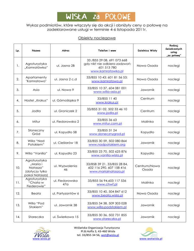 Wykaz podmiotów, które włączyły się do akcji i obniżyły ceny o połowę na zadeklarowane usługi w terminie 4-6 listopada 2011r. Obiekty noclegowe Adres Telefon i www Dzielnica Wisły Rodzaj świadczonych usług „za połowę” 1. Agroturystyka „Kamratówka” ul. Jasna 2B 33 /855 29 08, 691 073 668 gdy nikt nie odbiera zadzwoń: 601 513 780 www.kamratowka.pl Nowa Osada noclegi 2. Apartamenty "Kamratowo" ul. Jasna 2 c,d 33/855 10 43; 601 81 56 53; www.kamratowo.pl Nowa Osada noclegi 3. Asia ul. Nowa 9 33/855 10 37, 604 081 001 www.willa-asia.pl Jawornik noclegi 4. Hostel „Krokus” ul. Górnośląska 9 33/855 11 40 www.krokus.pl 5. Jodła ul. Groniczek 2 33/855 31 02, 502 33 46 10 www.jodla.pl Centrum noclegi 6. Mitur ul. Fiedorowska 2 33/855 36 63 www.mitur.com.pl Malinka noclegi 7. Słoneczny Gród ul. Kopydło 58 33/855 31 24 www.slonecznygrod.pl Kopydło noclegi 8. Willa “Nad Potokiem” ul. Cieślarów 18 33/855 30 59, 502 080 864 www.nadpotokiem.org Jawornik noclegi 9. Willa “Vanilla” ul. Kopydło 23 33/855 23 70, 502 625 876 www.vanilla-wisla.pl Kopydło noclegi ul. Wyzwolenia 46 33/858 39 21, 33/855 28 84, 602 116 290, 607 158 416 www.mariainatasza.pl Centrum/Nowa Osada noclegi ul. Fiedorowska 47a 33/855 56 94,603 117 536 www.chwf.pl Malinka noclegi Lp. Nazwa 10. 11. Agroturystyka „Maria i Natasza” (dotyczy tylko pokoi Natasza) Agroturystyka “Chata w Fiederowie” Centrum noclegi 12. Beata ul. Partyzantów 6 33/855 10 40, 504 847 612 www.beata.wisla.pl Nowa Osada noclegi 13. Willa “Pod Stokiem” ul. Jawornik 38 33/855 34 38, 509 303 028 www.willa.podstokiem.pl Jawornik noclegi 14. Stareczka ul. Świerkowa 15 33/855 30 36, 502 731 855 www.stareczka.pl Jawornik noclegi Wiślańska Organizacja Turystyczna Pl.B.Hoffa 3, 43-460 Wisła tel. 33/855 34 56, [email protected] www.wisla.pl www.wotwisla.pl Wykaz podmiotów, które włączyły się do akcji i obniżyły ceny o połowę na zadeklarowane usługi w terminie 4-6 listopada 2011r. 15. 16. Agroturystyka “U Młynarczyka” Pod Cieńkowem ul. Kędzierowska 3 33/855 54 82, 880 560 677 Malinka noclegi ul. Kędziorowska 12 33/855 36 25 ,609 233 273 Malinka noclegi 17. Pensjonat Ogrodzisko*** ul. Malinka 8 33/855 36 32, 33/855 36 07 www.nat.pl Malinka noclegi z wyżywieniem 18. Gawra ul. Górnośląska 44 33/855 23 92, 33/855 13 92 www.hotelgawra.pl Centrum noclegi 19. Willa Montana ul. 1 Maja 71 33/857 84 91, 501 543 884 www.montana-wisla.eu Centrum noclegi 20. Centrum Willa Różana ul. Różana 3 33/ 857 84 91, 501 543 884 www.rozana-wisla.eu Centrum noclegi 21. Agroturystyka “Irena” ul. B.Prusa 5 33/855 28 29, 600 749 380 www.agrogoscina.pl Centrum noclegi 22. Dworek Sylwia ul. Al. Ks. Bpa J. Bursche 55 33/855 17 61, 603 869 947 www.dworeksylwia.pl Centrum noclegi 23. Willa Niby Nic ul. 1 Maja 66 33/857 83 17 www.nibynic.pl Centrum noclegi 24. Willa Stok ul. Willowa 16 33/855 24 40 www.willastok.pl Centrum noclegi 25. Gospodarstwo agroturystyczne “Zosia” ul. Jawornik 66 660 312 843 Jawornik noclegi 26. Willa Almira ul. Górnośląska 1a 33/857 84 50 www.almira.pl Centrum noclegi 27. Apartament Caffe ul. Wyzwolenia 4c/14 502 742 884 Nowa Osada noclegi 28. Willa Wisełka ul. Czarna Wisełka 1 33/855 37 88, 501 521 323 www.wiselka.ccm.pl Czarne noclegi 29. Soszów ul. Cieślarów 30 33/855 28 32 www.soszow.pl Jawornik noclegi i wyżywienie 30. Chata Kleszczonka ul. Głębce 22 33/855 16 57, 603 323 454, 607 894 129 www.kleszczonka.pl Głębce noclegi 31. Zuzanna ul. Jawornik 6 33/858 39 89, 660 789 270 www.zuzanna.wisla.pl Jawornik noclegi Wiślańska Organizacja Turystyczna Pl.B.Hoffa 3, 43-460 Wisła tel. 33/855 34 56, [email protected] www.wisla.pl www.wotwisla.pl Wykaz podmiotów, które włączyły się do akcji i obniżyły ceny o połowę na zadeklarowane usługi w terminie 4-6 listopada 2011r. 32. Centrum WypocynkowoKonferencyjne “Cisówka” ul. Górnośląska 7 33/855 21 03 www.cisowka.com Centrum noclegi 33. Willa Retro ul. Torfowa 7 33/855 22 30, 601 131 795, 609 218 278 www.willaretro.pl Nowa Osada noclegi 34. Ośrodek wczasowy “Izabella” ul. Gimnazjalna 10 33/855 23 20 www.izabella.wisla.pl Centrum noclegi 35. U Danusi ul. Malinka 40a Malinka noclegi 36. Szary Kącik ul. Kopydło 24 33/855 26 27; 606 218 798 www.szarykacik.pl Kopydło noclegi 37. Karina ul. Bukowa 16b 33/855 19 93, 33/855 24 70, 609 752 751 www.karina.wisla.pl Centrum noclegi 38. Apartamenty Belweder ul. Wyzwolenia 4a/4b 665 007 066 www.apartamentybelweder.pl Nowa Osada noclegi 39. Dom wypoczynkowy “Beskidy” ul. Wypoczynkowa 10 33/855 20 13 www.dwbeskidy.pl Nowa Osada noclegi 40. Geovita os. Bajcary 14 33/855 23 12, 601 580 906 www.geovita.pl Malinka noclegi 41. Pokoje Martyna ul. Na Groń 5d 33/855 12 76; 604 297 168 Nowa Osada noclegi 42. Chata pod Jałowcem ul. Jałowcowa 6 33/855 36 35,604 942 921,500 026 168 www.podjalowcem.cal.pl Malinka noclegi 33/855 52 71; 513 043 480 www.udanusi.wczasywpolsce.pl Wiślańska Organizacja Turystyczna Pl.B.Hoffa 3, 43-460 Wisła tel. 33/855 34 56, [email protected] www.wisla.pl www.wotwisla.pl Wykaz podmiotów, które włączyły się do akcji i obniżyły ceny o połowę na zadeklarowane usługi w terminie 4-6 listopada 2011r. Obiekty gastronomiczne Lp. Nazwa 43. Hotel Gołębiewski****Restauracja Zielona Adres Telefon i www Dzielnica Wisły Rodzaj świadczonych usług „za połowę” Centrum Gastronomia w Restauracji Zielonej (za wyjątkiem papierosów) al. Ks. Bpa J. Bursche 33/855 47 00 www.golebiewski.pl Jawornik gastronomia (nie dotyczy alkoholu i napoi) 44. Soszów ul. Cieślarów 30 33/855 28 32 www.soszow.pl 45. Pizzeria „Amadeo” ul. 1 Maja 61 33/857 83 16, 533 301 301 www.pizzeria-amadeo.pl Centrum trzy wybrane produkty z lokalu 46. Bar „Pietrówka” ul. 1 Maja 61 33/855 22 38, 33/857 83 16 Centrum trzy wybrane produkty z lokalu 47. Cukiernia „Deicje” ul. 1 Maja 53 Centrum kawa, herbata, 2 rodzaje ciast 48. Naleśnikarnia ul. 1 Maja na przeciw DH 