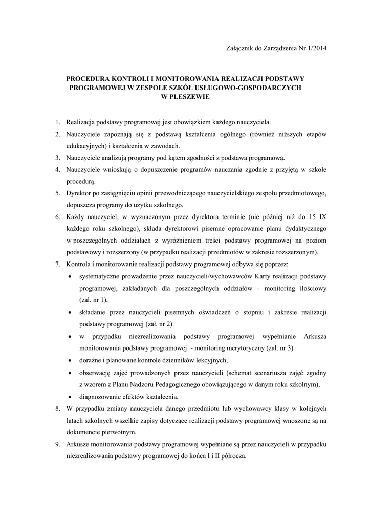 Załącznik do Zarządzenia Nr 1/2014 PROCEDURA KONTROLI I MONITOROWANIA REALIZACJI PODSTAWY PROGRAMOWEJ W ZESPOLE SZKÓŁ USŁUGOWO-GOSPODARCZYCH W PLESZEWIE 1. Realizacja podstawy programowej jest obowiązkiem każdego nauczyciela. 2. Nauczyciele zapoznają się z podstawą kształcenia ogólnego (również niższych etapów edukacyjnych) i kształcenia w zawodach. 3. Nauczyciele analizują programy pod kątem zgodności z podstawą programową. 4. Nauczyciele wnioskują o dopuszczenie programów nauczania zgodnie z przyjętą w szkole procedurą. 5. Dyrektor po zasięgnięciu opinii przewodniczącego nauczycielskiego zespołu przedmiotowego, dopuszcza programy do użytku szkolnego. 6. Każdy nauczyciel, w wyznaczonym przez dyrektora terminie (nie później niż do 15 IX każdego roku szkolnego), składa dyrektorowi pisemne opracowanie planu dydaktycznego w poszczególnych oddziałach z wyróżnieniem treści podstawy programowej na poziom podstawowy i rozszerzony (w przypadku realizacji przedmiotów w zakresie rozszerzonym). 7. Kontrola i monitorowanie realizacji podstawy programowej odbywa się poprzez: systematyczne prowadzenie przez nauczycieli/wychowawców Karty realizacji podstawy programowej, zakładanych dla poszczególnych oddziałów - monitoring ilościowy (zał. nr 1), składanie przez nauczycieli pisemnych oświadczeń o stopniu i zakresie realizacji podstawy programowej (zał. nr 2) w przypadku niezrealizowania podstawy programowej wypełnianie Arkusza monitorowania podstawy programowej - monitoring merytoryczny (zał. nr 3) doraźne i planowane kontrole dzienników lekcyjnych, obserwację zajęć prowadzonych przez nauczycieli (schemat scenariusza zajęć zgodny z wzorem z Planu Nadzoru Pedagogicznego obowiązującego w danym roku szkolnym), diagnozowanie efektów kształcenia, 8. W przypadku zmiany nauczyciela danego przedmiotu lub wychowawcy klasy w kolejnych latach szkolnych wszelkie zapisy dotyczące realizacji podstawy programowej wnoszone są na dokumencie pierwotnym. 9. Arkusze monitorowania podstawy programowej wypełniane są przez nauczycieli w przypadku niezrealizowania podstawy programowej do końca I i II półrocza. 10. Arkusze monitorowania i Karty realizacji podstawy programowej są własnością szkoły i podlegają kontroli. 11. Na zakończenie roku szkolnego nauczyciele/wychowawcy przekazują Arkusze monitorowania i Karty realizacji podstawy programowej do sekretariatu szkoły. Arkusze i Karty przechowuje się wraz z dokumentacją pedagogiczną danego oddziału. W kolejnym roku szkolnym nauczyciel odbiera Kartę celem jej uzupełnienia. 12. Karta realizacji podstawy programowej i Arkusz monitorowania nie są dokumentami podlegającymi archiwizacji. 13. W terminie do końca I półrocza i 15 czerwca każdego roku szkolnego nauczyciel składa dyrektorowi pisemne oświadczenie o stopniu i zakresie realizacji podstawy programowej. 14. Złożenie oświadczeń jest podstawą do stwierdzenia w protokole Rady Pedagogicznej faktu zrealizowania podstawy programowej w poszczególnych klasach. 15. W przypadku jakichkolwiek trudności z realizacją podstawy programowej nauczyciel jest obowiązany zgłaszać je dyrektorowi wraz z propozycją weryfikacji planu dydaktycznego, która zapewni zrealizowanie koniecznych treści w cyklu kształcenia (oświadczenie - zał. nr 2 i arkusz monitorowania - zał. nr 3). Załącznik Nr 2 OŚWIADCZENIE NAUCZYCIELA O REALIZACJI PODSTAWY PROGRAMOWEJ Oświadczam, że w roku szkolnym/I półroczu ........................................................................................... zrealizowałam/em podstawę programową z ........................................................................................... w klasach .................................................................................................................................................. zgodnie z przedstawionym planem dydaktycznym. Nie zrealizowałam/em podstawy programowej w klasach ...................................................................... z przedmiotu ............................................................................................................................................, w załączeniu arkusz monitorowania realizacji podstawy programowej (zał. nr 3 - ....... szt.) Przyczyna niezrealizowania: ................................................................................................................................................................... ................................................................................................................................................................... Propozycja weryfikacji planu dydaktycznego w celu uzupełnienia zaległości: ................................................................................................................................................................... ................................................................................................................................................................... ................................................................................................................................................................... ................................................................................................................................................................... ................................................................................................................................................................... ..................................................... data ............................................................. podpis nauczyciela