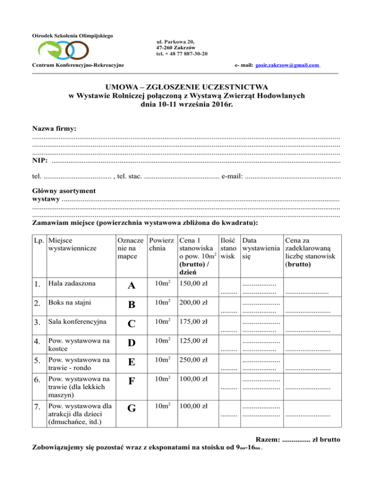 Ośrodek Szkolenia Olimpijskiego ul. Parkowa 20, 47-260 Zakrzów tel. + 48 77 887-30-20 Centrum Konferencyjno-Rekreacyjne e- mail: [email protected] ____________________________________________________________________________________________________________ UMOWA – ZGŁOSZENIE UCZESTNICTWA w Wystawie Rolniczej połączoną z Wystawą Zwierząt Hodowlanych dnia 10-11 września 2016r. Nazwa firmy: ................................................................................................................................................................... ................................................................................................................................................................... ................................................................................................................................................................... NIP: ......................................................................................................................................................... tel. .................................... , tel. stac. ........................................ e-mail: ................................................... Główny asortyment wystawy ................................................................................................................................................... ................................................................................................................................................................... ................................................................................................................................................................... Zamawiam miejsce (powierzchnia wystawowa zbliżona do kwadratu): Lp. Miejsce wystawiennicze Oznacze Powierz Cena 1 Ilość Data Cena za nie na chnia stanowiska stano wystawienia zadeklarowaną mapce o pow. 10m2 wisk się liczbę stanowisk (brutto) / (brutto) dzień A 10m2 2. Boks na stajni B 2 10m 200,00 zł .................... ......... .................. ........................ 3. Sala konferencyjna C 10m2 175,00 zł .................... ......... .................. ........................ 4. Pow. wystawowa na D 10m2 125,00 zł .................... ......... .................. ........................ 5. Pow. wystawowa na E 10m2 250,00 zł .................... ......... .................. ........................ 6. Pow. wystawowa na F 10m2 100,00 zł .................... ......... .................... ........................ 7. Pow. wystawowa dla G 10m2 100,00 zł .................... ......... .................... ........................ 1. Hala zadaszona kostce trawie - rondo trawie (dla lekkich maszyn) atrakcji dla dzieci (dmuchańce, itd.) 150,00 zł .................. ......... .................. ....................... Razem: ............... zł brutto Zobowiązujemy się pozostać wraz z eksponatami na stoisku od 9oo-16oo . ............................................................................... (podpis i pieczątka zamawiającego) Kartę umowy – zgłoszenia przesłać na adres: Gminny Ośrodek Sportu i Rekreacji Sp. z o.o. ul. Parkowa 20 47-260 Zakrzów tel. 77 887 30 20, 506-849-406 Zapoznałem się z regulaminem Wystawy Rolniczej połączonej z Wystawą Zwierząt Hodowlanych i akceptuję warunki uczestnictwa. ........................................................ podpis zamawiającego Warunkiem przyjęcia zgłoszenia jest dokonanie przez Państwa wpłaty na konto: 11 88821016 2002 0040 6785 0001, koniecznie z dopiskiem Wystawa Rolnicza 2016r. oraz przesłanie wraz ze zgłoszeniem kserokopii dowodu wpłaty na adres: Gminny Ośrodek Sportu i Rekreacji Sp. z o.o., ul. Parkowa 20, 47-260 Zakrzów. Wystawić fakturę VAT tak / nie . Dane do wystawienia faktury: Nazwa firmy .................................................................................................................................................................. .................................................................................................................................................................. Adres ........................................................................................................................................................ ................................................................................................................................................................... NIP (obowiązkowo)………………………………………………….. PESEL………………………………………………………………. (jeżeli nie prowadzi działalności gospodarczej lub nie jest zarejestrowanym podatnikiem podatku VAT) .................................................... ............................................ data podpis i pieczęć
