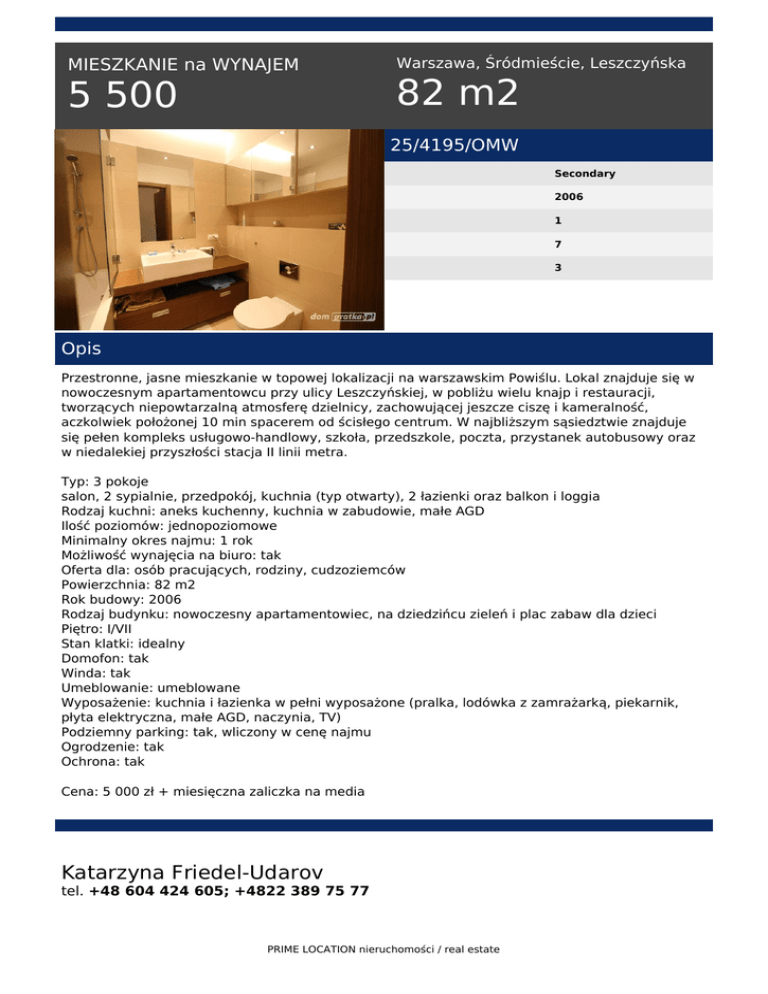 MIESZKANIE na WYNAJEM 5 500 Warszawa, Śródmieście, Leszczyńska 82 m2 25/4195/OMW Secondary 2006 1 7 3 Opis Przestronne, jasne mieszkanie w topowej lokalizacji na warszawskim Powiślu. Lokal znajduje się w nowoczesnym apartamentowcu przy ulicy Leszczyńskiej, w pobliżu wielu knajp i restauracji, tworzących niepowtarzalną atmosferę dzielnicy, zachowującej jeszcze ciszę i kameralność, aczkolwiek położonej 10 min spacerem od ścisłego centrum. W najbliższym sąsiedztwie znajduje się pełen kompleks usługowo-handlowy, szkoła, przedszkole, poczta, przystanek autobusowy oraz w niedalekiej przyszłości stacja II linii metra. Typ: 3 pokoje salon, 2 sypialnie, przedpokój, kuchnia (typ otwarty), 2 łazienki oraz balkon i loggia Rodzaj kuchni: aneks kuchenny, kuchnia w zabudowie, małe AGD Ilość poziomów: jednopoziomowe Minimalny okres najmu: 1 rok Możliwość wynajęcia na biuro: tak Oferta dla: osób pracujących, rodziny, cudzoziemców Powierzchnia: 82 m2 Rok budowy: 2006 Rodzaj budynku: nowoczesny apartamentowiec, na dziedzińcu zieleń i plac zabaw dla dzieci Piętro: I/VII Stan klatki: idealny Domofon: tak Winda: tak Umeblowanie: umeblowane Wyposażenie: kuchnia i łazienka w pełni wyposażone (pralka, lodówka z zamrażarką, piekarnik, płyta elektryczna, małe AGD, naczynia, TV) Podziemny parking: tak, wliczony w cenę najmu Ogrodzenie: tak Ochrona: tak Cena: 5 000 zł + miesięczna zaliczka na media Katarzyna Friedel-Udarov tel. +48 604 424 605; +4822 389 75 77 PRIME LOCATION nieruchomości / real estate tel. +48 604 424 605 email: [email protected] PRIME LOCATION nieruchomości / real estate Powered by TCPDF (www.tcpdf.org)