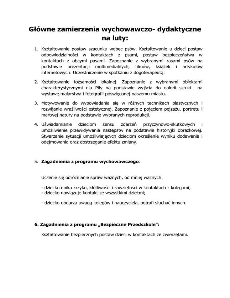 Główne zamierzenia wychowawczo- dydaktyczne na luty: 1. Kształtowanie postaw szacunku wobec psów. Kształtowanie u dzieci postaw odpowiedzialności w kontaktach z psami, postaw bezpieczeństwa w kontaktach z obcymi pasami. Zapoznanie z wybranymi rasami psów na podstawie prezentacji multimedialnych, filmów, książek i artykułów internetowych. Uczestniczenie w spotkaniu z dogoterapeutą. 2. Kształtowanie tożsamości lokalnej. Zapoznanie z wybranymi obiektami charakterystycznymi dla Piły na podstawie wyjścia do galerii sztuki na wystawę malarstwa i fotografii poświęconej naszemu miastu. 3. Motywowanie do wypowiadania się w różnych technikach plastycznych i rozwijanie wrażliwości estetycznej. Zapoznanie z pojęciem pejzażu, portretu i martwej natury na podstawie wybranych reprodukcji. 4. Uświadamianie dzieciom sensu zdarzeń przyczynowo-skutkowych i umożliwienie przewidywania następstw na podstawie historyjki obrazkowej. Stwarzanie sytuacji umożliwiających dzieciom określenie wyniku dodawania i odejmowania oraz dostrzeganie efektu zmiany. 5. Zagadnienia z programu wychowawczego: Uczenie się odróżnianie spraw ważnych, od mniej ważnych: - dziecko unika krzyku, kłótliwości i zawziętości w kontaktach z kolegami; - dziecko nawiązuje kontakt ze wszystkimi dziećmi; - dziecko obdarza uwagą kolegów i nauczyciela, potrafi słuchać innych. 6. Zagadnienia z programu „Bezpieczne Przedszkole”: Kształtowanie bezpiecznych postaw dzieci w kontaktach ze zwierzętami. JĘZYK ANGIELSKI: TYDZIEŃ: stroje karnawałowe, bajka, Królewna Śnieżka, Kopciuszek, Spiderman, Batman I - przyporządkowuje napis pod odpowiednimi ilustracjami postaci z bajek II TYDZIEŃ: śnieg, sanki, narty, łyżwy, zabawa na śniegu - potrafi ułożyć puzzle i poprawnie dobrać do nich podpis: „śnieg- snow, sanki- sledding, narty- skiing, łyżwy- ice skating, zabawa na śniegu- fun in the snow” III TYDZIEŃ: miłość, walentynki, serce, czerwony - przelicza ozdoby związane z walentynkami: „serceheart” IV TYDZIEŃ: apteka, lekarz, lekarstwa, recepta, zwrot: jestem chory - wskazuje przedmioty związane z wizytą w aptece tj.: „apteka- pharmacy, lekarstwa- medication” PIOSENKA słowa: Dorota Gellner, muzyka: Barbara Kolago „Popatrzcie na jamniczka” 1. Popatrzcie na jamniczka! Wyturlał się z koszyczka, Zaczaił się na babcie i porwał babci kapcie. Ref: A jak spał, a jak spał taką grzeczną minę miał. 2. Poszarpał chustkę w róże i zrobił dwie kałuże, i moją nowa lalkę zaciągnął pod wersalkę. 3. A teraz gdzieś ucieka i szczeka, szczeka, szczeka, łapiemy więc jamniczka, niech wraca do koszyczka. 4. Pod stołem jest koszyczek, w koszyczku śpi jamniczek. Jamniczek sobie śpi (pss..) jak się zbudzi, będzie zły. WIERSZ „Pieski” D.Gellnerowa Raz dwa pieski na podwórzu zobaczyły kość niedużą! Biegną do niej ile siły! Już ją mają! Już chwyciły! Biały piesek do czarnego warczy: - Oddaj kość kolego! Oddać kostkę? Nie, mój miły, ja ją pierwszy zobaczyłem Kłótnia toczy się zajadła. Nagle pieskom kość upadła, ale wówczas, patrzcie dzieci, porwał kostkę piesek trzeci.