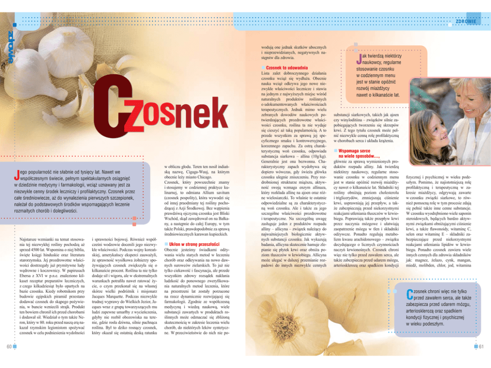 ZDROWIE zdrowie wodują one jednak skutków ubocznych i nieprzewidzianych, negatywnych następstw dla zdrowia. Czosnek to udowadnia J ego popularność nie słabnie od tysięcy lat. Nawet we współczesnym świecie, pełnym spektakularnych osiągnięć w dziedzinie medycyny i farmakologii, wciąż uznawany jest za niezwykle cenny środek leczniczy i profilaktyczny. Czosnek przez całe średniowiecze, aż do wynalezienia pierwszych szczepionek, należał do podstawowych środków wspomagających leczenie rozmaitych chorób i dolegliwości. Najstarsze wzmianki na temat stosowania tej niezwykłej rośliny pochodzą aż sprzed 4500 lat. Wspomina o niej biblia, święte księgi hinduskie oraz literatura starorzymska. Jej prozdrowotne właściwości dostrzegały już prymitywne ludy wędrowne i koczownicy. W papirusach Ebersa z XVI w p.n.e. znaleziono kilkaset receptur preparatów leczniczych, z czego kilkadziesiąt było opartych na bazie czosnku. Kiedy robotnikom przy budowie egipskich piramid przestano dodawać czosnek do skąpego pożywienia, w buncie wzniecili strajk. Produkt ten bowiem chronił ich przed chorobami i dodawał sił. Wiedział o tym także Neron, który w 80. roku przed naszą erą nakazał rzymskim legionistom spożywać czosnek w celu podniesienia wydolności 60 i sprawności bojowej. Również współcześni wodzowie docenili jego niezwykłe właściwości. Podczas wojny koreańskiej, amerykańscy eksperci zauważyli, że sprawność wysiłkowa żołnierzy spożywających czosnek zwiększyła się o kilkanaście procent. Roślina ta nie tylko dodaje sił i wigoru, ale w ekstremalnych warunkach potrafiła nawet ratować życie, o czym przekonał się na własnej skórze wielki podróżnik i misjonarz Jacques Marquette. Podczas niezwykle trudnej wyprawy do Wielkich Jezior, Jacques wraz z grupą towarzyszących mu ludzi zapewne umarłby z wycieńczenia, gdyby nie rozbił obozowiska na terenie, gdzie rosła dziwna, silnie pachnąca roślina. Był to dziko rosnący czosnek, który okazał się ostatnią deską ratunku w obliczu głodu. Teren ten nosił indiańską nazwę, Cigaga-Wuuj, na którym obecnie leży miasto Chicago. Czosnek, który powszechnie znamy i stosujemy w codziennej praktyce kulinarnej, to odmiana Allium savitum (czosnek pospolity), która wywodzi się od innej praodmiany tej rośliny pochodzącej z Azji Środkowej. Bez wątpienia prawdziwą ojczyzną czosnku jest Bliski Wschód, skąd zawędrował on na Bałkany, a następnie do całej Europy, w tym także Polski, prawdopodobnie za sprawą średniowiecznych karawan kupieckich. Ukłon w stronę przeszłości Obecnie jesteśmy świadkami odżywania wielu starych metod w leczeniu chorób oraz odkrywania na nowo dawnych surowców zielarskich. To już nie tylko ciekawość i fascynacja, ale przede wszystkim zdrowy rozsądek nakłania ludzkość do ponownego zweryfikowania naturalnych metod leczenia, które na przestrzeni lat zostały porzucone na rzecz dynamicznie rozwijającej się farmakologii. Zgodnie ze współczesną medycyną i wiedzą naukową, wiele substancji zawartych w produktach roślinnych może odznaczać się zbliżoną skutecznością w zakresie leczenia wielu chorób, do niektórych leków syntetyczne. W przeciwieństwie do nich nie po- Lista zalet dobroczynnego działania czosnku wciąż się wydłuża. Obecnie nauka wciąż odkrywa jego nowe niezwykłe właściwości lecznicze i stawia na jednym z najwyższych miejsc wśród naturalnych produktów roślinnych o udokumentowanych właściwościach terapeutycznych. Jednak mimo wielu zebranych dowodów naukowych potwierdzających prozdrowotne właściwości czosnku, roślina ta nie wydaje się cieszyć aż taką popularnością. A to przede wszystkim za sprawą jej specyficznego smaku i kontrowersyjnego, korzennego zapachu. Za ostrą charakterystyczną woń czosnku, odpowiada substancja siarkowa – allina (10g/kg). Generalnie jest ona bezwonna. Charakterystyczny zapach wydobywa się dopiero wówczas, gdy świeża główka czosnku ulegnie zniszczeniu. Przy rozdrobnionej strukturze miąższu, aktywność swoją wzmaga enzym allinaza, który rozkłada allinę na ajoen oraz różne wielosiarczki. To właśnie te ostatnie odpowiedzialne są za charakterystyczną woń czosnku. Ale i także za jego szczególne właściwości prozdrowotne i terapeutyczne. Na szczególną uwagę zasługuje jeden z produktów rozpadu alliny – allicyna – związek należący do najważniejszych biologicznie aktywnych substancji czosnku. Jak wykazują badania, allicyna skutecznie hamuje zlepianie się płytek krwi oraz obniża poziom tłuszczów w krwiobiegu. Allicyna może ulegać w dalszej przemianie rozpadowi do innych niezwykle cennych J ak twierdzą niektórzy naukowcy, regularne stosowanie czosnku w codziennym menu jest w stanie opóźnić rozwój miażdżycy nawet o kilkanaście lat. substancji siarkowych, takich jak ajoen czy winyloditiina – związków silnie zapobiegających tworzeniu się skrzepów krwi. Z tego tytułu czosnek może pełnić niezwykle cenną rolę profilaktyczną w chorobach serca i układu krążenia. Wspomaga serce na wiele sposobów..., głównie za sprawą wymienionych produktów rozpadu alliny. Jak twierdzą niektórzy naukowcy, regularne stosowanie czosnku w codziennym menu jest w stanie opóźnić rozwój miażdżycy nawet o kilkanaście lat. Składniki tej rośliny obniżają poziom cholesterolu i triglicerydów, zmniejszają ciśnienie krwi, usprawniają jej przepływ, a także zabezpieczają przed niekorzystnymi reakcjami utleniania tłuszczów w krwiobiegu. Poprawiają także przepływ krwi przez naczynia mózgowe i ułatwiają zaopatrzenie mózgu w tlen i składniki odżywcze. Ponadto regulują metabolizm kwasu arachidonowego – związku decydującego o licznych czynnościach naczyń krwionośnych. Czosnek chroni więc nie tylko przed zawałem serca, ale także zabezpiecza przed udarem mózgu, arteriosklerozą oraz spadkiem kondycj