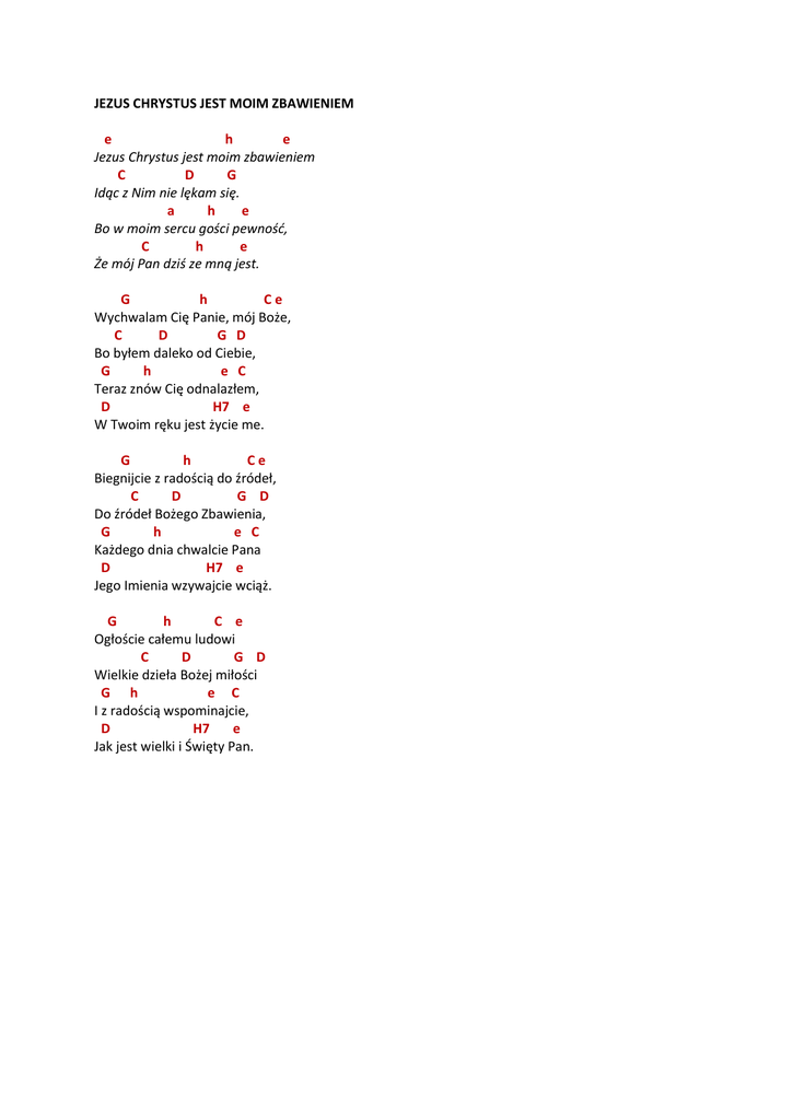 JEZUS CHRYSTUS JEST MOIM ZBAWIENIEM e h e Jezus Chrystus jest moim zbawieniem C D G Idąc z Nim nie lękam się. a h e Bo w moim sercu gości pewność, C h e Że mój Pan dziś ze mną jest. G h Ce Wychwalam Cię Panie, mój Boże, C D G D Bo byłem daleko od Ciebie, G h e C Teraz znów Cię odnalazłem, D H7 e W Twoim ręku jest życie me. G h Ce Biegnijcie z radością do źródeł, C D G D Do źródeł Bożego Zbawienia, G h e C Każdego dnia chwalcie Pana D H7 e Jego Imienia wzywajcie wciąż. G h C e Ogłoście całemu ludowi C D G D Wielkie dzieła Bożej miłości G h e C I z radością wspominajcie, D H7 e Jak jest wielki i Święty Pan.