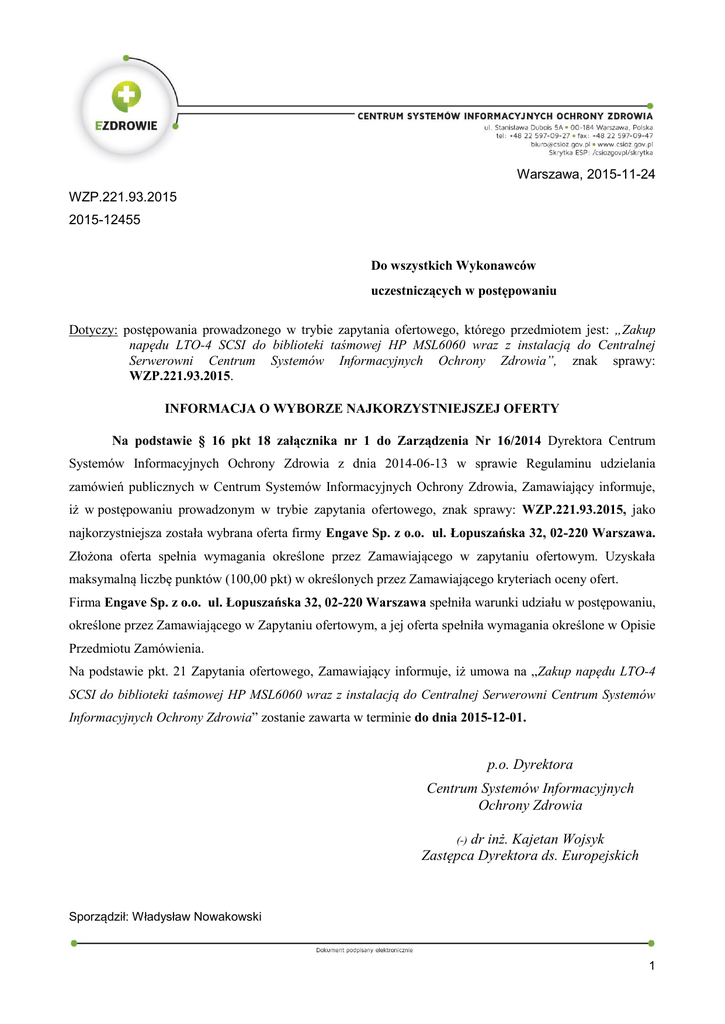 Warszawa, 2015-11-24 WZP.221.93.2015 2015-12455 Do wszystkich Wykonawców uczestniczących w postępowaniu Dotyczy: postępowania prowadzonego w trybie zapytania ofertowego, którego przedmiotem jest: „Zakup napędu LTO-4 SCSI do biblioteki taśmowej HP MSL6060 wraz z instalacją do Centralnej Serwerowni Centrum Systemów Informacyjnych Ochrony Zdrowia”, znak sprawy: WZP.221.93.2015. INFORMACJA O WYBORZE NAJKORZYSTNIEJSZEJ OFERTY Na podstawie § 16 pkt 18 załącznika nr 1 do Zarządzenia Nr 16/2014 Dyrektora Centrum Systemów Informacyjnych Ochrony Zdrowia z dnia 2014-06-13 w sprawie Regulaminu udzielania zamówień publicznych w Centrum Systemów Informacyjnych Ochrony Zdrowia, Zamawiający informuje, iż w postępowaniu prowadzonym w trybie zapytania ofertowego, znak sprawy: WZP.221.93.2015, jako najkorzystniejsza została wybrana oferta firmy Engave Sp. z o.o. ul. Łopuszańska 32, 02-220 Warszawa. Złożona oferta spełnia wymagania określone przez Zamawiającego w zapytaniu ofertowym. Uzyskała maksymalną liczbę punktów (100,00 pkt) w określonych przez Zamawiającego kryteriach oceny ofert. Firma Engave Sp. z o.o. ul. Łopuszańska 32, 02-220 Warszawa spełniła warunki udziału w postępowaniu, określone przez Zamawiającego w Zapytaniu ofertowym, a jej oferta spełniła wymagania określone w Opisie Przedmiotu Zamówienia. Na podstawie pkt. 21 Zapytania ofertowego, Zamawiający informuje, iż umowa na „Zakup napędu LTO-4 SCSI do biblioteki taśmowej HP MSL6060 wraz z instalacją do Centralnej Serwerowni Centrum Systemów Informacyjnych Ochrony Zdrowia” zostanie zawarta w terminie do dnia 2015-12-01. p.o. Dyrektora Centrum Systemów Informacyjnych Ochrony Zdrowia (-) dr inż. Kajetan Wojsyk Zastępca Dyrektora ds. Europejskich Sporządził: Władysław Nowakowski 1