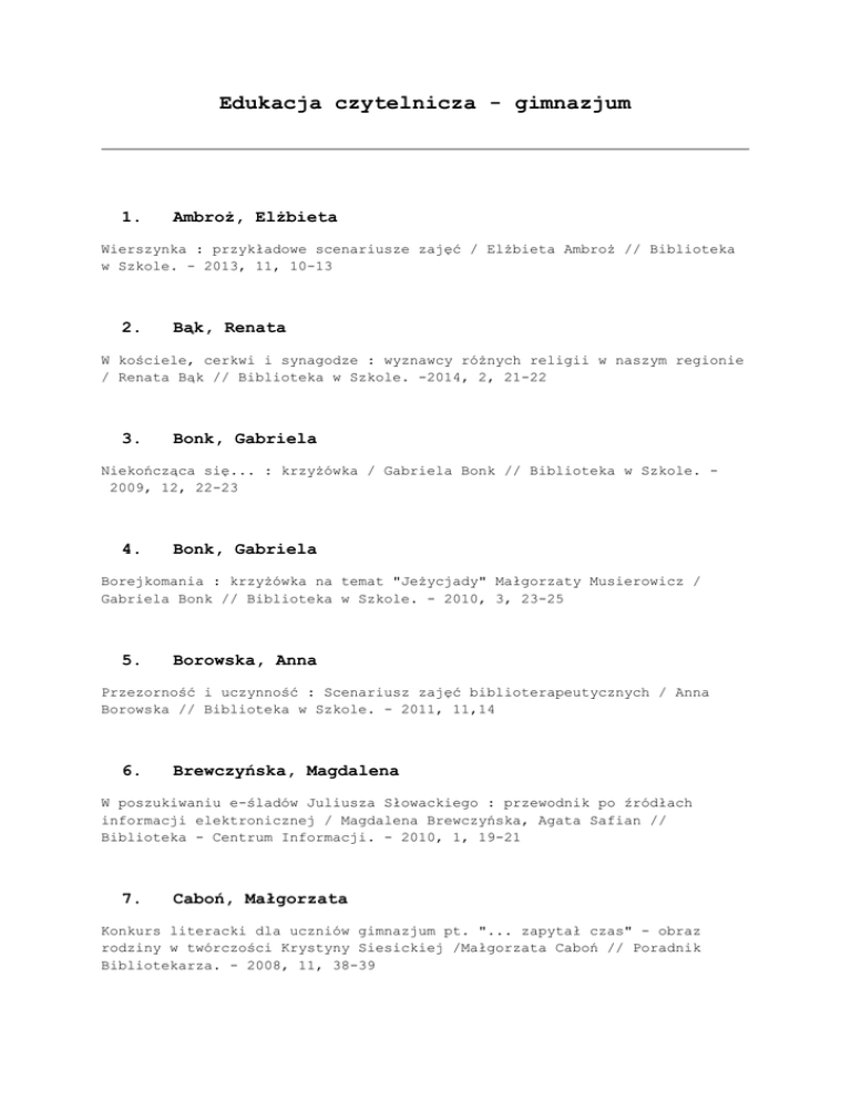 Edukacja czytelnicza - gimnazjum 1. Ambroż, Elżbieta Wierszynka : przykładowe scenariusze zajęć / Elżbieta Ambroż // Biblioteka w Szkole. - 2013, 11, 10-13 2. Bąk, Renata W kościele, cerkwi i synagodze : wyznawcy różnych religii w naszym regionie / Renata Bąk // Biblioteka w Szkole. -2014, 2, 21-22 3. Bonk, Gabriela Niekończąca się... : krzyżówka / Gabriela Bonk // Biblioteka w Szkole. 2009, 12, 22-23 4. Bonk, Gabriela Borejkomania : krzyżówka na temat "Jeżycjady" Małgorzaty Musierowicz / Gabriela Bonk // Biblioteka w Szkole. - 2010, 3, 23-25 5. Borowska, Anna Przezorność i uczynność : Scenariusz zajęć biblioterapeutycznych / Anna Borowska // Biblioteka w Szkole. - 2011, 11,14 6. Brewczyńska, Magdalena W poszukiwaniu e-śladów Juliusza Słowackiego : przewodnik po źródłach informacji elektronicznej / Magdalena Brewczyńska, Agata Safian // Biblioteka - Centrum Informacji. - 2010, 1, 19-21 7. Caboń, Małgorzata Konkurs literacki dla uczniów gimnazjum pt. "... zapytał czas" - obraz rodziny w twórczości Krystyny Siesickiej /Małgorzata Caboń // Poradnik Bibliotekarza. - 2008, 11, 38-39 8. Diduszko, Hanna Burdubasta czyli skapcaniały osioł... Dlaczego co nieco rozumiem? : scenariusz lekcji dla gimnazjalistów i licealistów/ Hanna Diduszko // Poradnik Bibliotekarza. - 2015, 10, 41-43 9. Dobek, Edyta Porozmawiajmy o emocjach : scenariusz zajęć dla uczniów gimnazjum / Edyta Dobek // Poradnik Bibliotekarza. - 2010, 6,36-37 10. Drogoś, Katarzyna Tylko dla młodzieży! : Internetowy konkurs czytelniczy. W świecie Marty Fox / Katarzyna Drogoś, Ewa Piątek //Biblioteka w Szkole. - 2015, 7-8, 2829 11. Drozd, Iwona Zostań mistrzem pięknego czytania : konkurs czytelniczy przeznaczony dla uczniów klas I szkoły ponadgimnazjalnej lub gimnazjum / Iwona Drozd // Biblioteka w Szkole. - 2009, 9, 24 12. Filipek, Dorota Śladami Miłosza. Międzyszkolny konkurs biblioteczny przeznaczony dla uczniów gimnazjum / Dorota Filipek // Biblioteka w Szkole. - 2013, 6, 20-21 13. Frel, Aneta Stephen King - mistrz horroru : scenariusz konkursu dla uczniów gimnazjum i szkoły średniej / Aneta Frel //Biblioteka w Szkole. - 2011, 12, 21 14. Frygier-Śliwa, Honorata Jestem świadomym i kulturalnym czytelnikiem : program edukacyjny biblioteki szkolnej / Honorata Frygier-Śliwa,Elżbieta Szczepańska // Biblioteka w Szkole. - 2011, 1, 14-15 15. Frygier-Śliwa, Honorata Świadomy i kulturalny czytelnik : Program edukacyjny. Przeznaczony dla uczniów gimnazjum / Honorata Frygier-Śliwa,Elżbieta Szczepańska // Biblioteka w Szkole. - 2011, 9, 19-21 16. Furtak-Wiśniewska, Elżbieta Fotosafari, czyli podróż do świata książek : scenariusz zajęć bibliotecznych dla uczniów klas IV-VI szkoły podstawowej i uczniów gimnazjum / Elżbieta Furtak-Wiśniewska, Jolanta Pytel // Biblioteka w Szkole. - 2008, 4, 17 17. Główka, Alicja "Król Olch" Goethego źródłem inspiracji kultury : scenariusz interdyscyplinarnej lekcji bibliotecznej / Alicja Główka, Aleksandra Zięba // Biblioteka w Szkole. - 2015, 2, 12-13 18. Gmerek-Biniek, Gabriela My i świat, który nas otacza : program czytelniczo-wychowawczy z elementami profilaktyki / Gabriela Gmerek-Biniek,Barbara Kozłowska // Biblioteka w Szkole. - 2010, 2, 13-17 19. Gobis, Ewa Zagadkus. Konkurs interdyscyplinarny : materiał jest przeznaczony dla uczniów klasy VI szkoły podstawowej i uczniów gimnazjum / Ewa Gobis, Małgorzata Masłowska // Biblioteka w Szkole. - 2008, 9, 20-22 20. Grzywacz, Beata Kolorowy zawrót głowy. Jeszcze o związkach frazeologicznych / Beata Grzywacz // Biblioteka w Szkole. - 2013, 11, 20-21 21. Hem, Betyna Drugie życie książki / Betyna Hem // Forum Nauczycieli. - 2015, 2, 26-27 22. Imańska, Danuta Śladami Jana Kochanowskiego : scenariusz konkursu dla uczniów gimnazjum / Danuta Imańska, Agnieszka Kaczmarska,Elżbieta Kramek // Biblioteka w Szkole. - 2008, 9, 23-24 23. Janik, Beata Życie i twórczość Janusza Korczaka : scenariusz zajęć / Beata Janik // Biblioteka w Szkole. - 2014, 12, 24-25 24. Jaśkiewicz, Renata Bohaterowie naszych lektur : scenariusz konkursu czytelniczego / Renata Jaśkiewicz // Biblioteka w Szkole. - 2015, 3,35-37 25. Jeż, M. Uczyła żyć Polską : turniej literacko-czytelniczy poświęcony twórczości Marii Konopnickiej (szk. podst. i gimnazjum) /M. Jeż, Ż. Majewska, A. Spiżewska // Wychowawca. - 2009, 7-8, 32-33 26. Kołodziej, Ilona Emocje w tekstach kultury i w życiu : scenariusz zajęć / Ilona Kołodziej // Biblioteka w Szkole . - 2014, 4, 16-17 27. Korzeń, Agata Strofy o Ojczyźnie : konkurs dla uczniów szkoły podstawowej (starsze klasy) i gimnazjum / Agata Korzeń // Wychowawca. - 2008, 11, 21 28. Kostecka, Marta w świecie wyobraźni Christophera Paoliniego : Konkurs literacki / Marta Kostecka // Biblioteka w Szkole. - 2010, 9, 19 29. Kostecka, Marta Harry Potter i Insygnia Śmierci : Konkurs ze znajomości książki i filmu. Przeznaczony dla uczniów gimnazjum / Marta Kostecka // Biblioteka w Szkole. - 2011, 11, 15-16 30. Kownatka-Ruszkowska, Agnieszka Hobbit : konkurs czytelniczy / Agnieszka Kownatka-Ruszkowska // Biblioteka w Szkole. - 2015, 10, 31 31. Medyńska, Marzena Spotkanie z Martą Fox : konkurs literacko-internetowy / Marzena Medyńska // Biblioteka w Szkole. - 2010, 1, 20 32. Nagowska, Monika Nowa podstawa programowa z pomocą biblioteki szkolnej / Monika Nagowska. Warszawa : Agencja Sukurs, 2010. - 253 s. : il. ; 21 cm. - Na okł.: Poradnik dla nauczycieli wszystkich przedmiotów, konspekty i scenariusze zajęć dla różnych przedmiotów,przejrzyste tabele umiejętności kluczowych. U góry okł.: Reforma programowa. - Bibliogr. s. 191-195 i przy niektórych rozdz. Indeks. - ik. - ISBN 978-83-924008-5-1 Nr inw.: 33404, Sygnatura: 33404 33. Okroj, Grażyna Oskar i pani Róża. Propozycja pracy z książką / Grażyna Okroj // Biblioteka w Szkole. - 2012, 10, 16-17 34. Okroj, Grażyna Morderstwo w Orient Expressie. Odkrywamy prawdę o bo