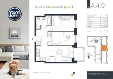 budynek A liczba pokoi 3 piętro 4 NR A.4.9 Salon z aneksem kuchennym Hall łazienka 4,30 m2 pokój 2 11,22 m2 17,14 m2 6,21 m2 Pokój 1 10,44 m2 Pokój 2 11,22 m2 Łazienka 4,30 m2 Suma 49,31 m2 Balkon 3,82 m2 hall 6,21 m2 pokój 1 10,44 m2 salon z aneksem kuchennym 17,14 m2 balkon 3,82 m2 ściany nadające się do usunięcia Biuro Sprzedaży: tel. 604 171 459 e-mail: [email protected], www.fajnydom.pl