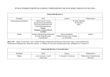 WYKAZ PODRĘCZNIKÓW DLA SZKOŁY PODSTAWOWEJ NR 204 W ROKU SZKOLNYM 2015/2016 Podręczniki dla klasy 0 Przedmiot Tytuł Wychowanie przedszkolne „Szkoła tuż-tuż” roczne przygotowanie przedszkolne Ćwiczenia grafomotoryczne Ćwiczenia matematyczne Ważne! Dostępne u nauczyciela od września Religia Kocham dobrego Boga Podręcznik do nauki religii dla dzieci sześcioletnich Autorzy Wydawnictwo W. Żaba- Żabińska M. Skrobacz MAC Dariusz Kurpiński, Elżbieta Osewska, Jerzy Snopek, ks. Józef Stala Jedność Klasy I SP - religia- W imię Ojca, i Syna, i Ducha Świętego. Podręcznik katechetyczny dla uczniów klasy I szkoły podstawowej. Wydawnictwo Katechetyczne, Warszawa, Autorzy: A. Frączak, R. Szewczyk (wydanie poprawione, składające się z 2 tomów!!!) Podręczniki dla klasy 2 (wszystkie klasy) Przedmiot Tytuł Autorzy Wydawnictwo Religia „A oto Ja jestem z wami” + karty pracy A. Frączak, R. Szewczyk Wydawnictwo Katechetyczne, Warszawa Podręczniki dla klasy 3 (wszystkie klasy) Przedmiot Tytuł Autorzy Wydawnictwo Edukacja wczesnoszkolna Pakiet A do Z J. Białobrzeska Didasko Religia „Kto spożywa moje Ciało, ma życie” + karty pracy A. Frączak, R. Szewczyk Wydawnictwo Katechetyczne, Warszawa Język angielski English Quest 3 podręcznik + zeszyt ćwiczeń Roisin O`Farrell, Jeanette Corbett Macmillan Religia Podręczniki dla klasy 4 (wszystkie klasy) „Jestem chrześcijaninem” ks. M. Czyżewski Wydawnictwo Katechetyczne, Warszawa Podręczniki dla klasy 5 (wszystkie klasy) Przedmiot Tytuł Język polski „Słowa na start” podręcznik, ćwiczenia + Radzę sobie Historia i społeczeństwo „Historia i społeczeństwo” Podręcznik, ćwiczenia Małkowski, Rześniowiecki GWO Matematyka „Matematyka z plusem”, podręcznik, ćwiczenia Dobrowolska. Karpiński, Zarzycki GWO Przyroda „Przyrodo witaj” podręcznik dla klasy 5, Zeszyt ćwiczeń, Zajęcia warsztatowe dla SP 5 E. Gromek, E. Kłos, WSiP Autorzy Wydawnictwo Nowa Era W. Kofta, E. Laskowska A. Melson Atlas przyrodniczy Wyd. Wiking Technika Nowa Era Plastyka Zeszyt ćwiczeń kl. 5 (niebieska, na okładce chłopiec z bryłami geometrycznymi) Muzyka Ale muzyka! zeszyt ćwiczeń Religia „Wierzę w Jednego Boga” ks. M. Czyżewski Wydawnictwo Katechetyczne, Warszawa J. angielski New Friends 2 Students` Book +Activity Book (gr. podstawowa) New Friends 3 Students` Book +Activity Book (gr. zawansowana) M. Bogucka Pearson S. Stopczyk, B. Neubart B. Neubart WSiP Wydawnictwo szkolne PWN C. Skinner Podręczniki dla klasy 6 (wszystkie klasy) Przedmiot Tytuł Autorzy Wydawnictwo Język polski „Słowa na start” podręcznik + ćwiczenia Repetytorium E. Horwath, A. Żegleń Nowa Era Historia i społeczeństwo „Historia i społeczeństwo” Podręcznik, ćwiczenia Małkowski, Rześniowiecki GWO Matematyka „Matematyka z plusem”, podręcznik, ćwiczenia Kalendarz szóstoklasisty Dobrowolska. Karpiński, Zarzycki GWO „Przyrodo witaj” podręcznik dla klasy 6, Zeszyt ćwiczeń, Zajęcia warsztatowe dla SP 6 E. Gromek, E. Kłos, Przyroda Atlas przyrodniczy „Zrozumieć przyrodę” - testy Plastyka „Plastyka”, podręcznik Zeszyt ćwiczeń kl. 6 (czerwona, na okładce dziewczynka z aparatem fotograficznym) Muzyka Ale muzyka! zeszyt ćwiczeń Religia „Wierzę w Święty Kościół powszechny” Język angielski Grupa podstawowa: New Friends 3 Students` Book Repetytorium Szóstoklasisty Grupa zaawansowana: New Friends 4 Students` Book Repetytorium Szóstoklasisty WSiP GWO WSiP W. Kofta, E. Laskowska A. Melson M. Światkowska Wyd. Wiking Tales S. Stopczyk, J.Chołaścińska B. Neubart WSiP Wydawnictwo Szkolne PWN ks. M. Czyżewski Wydawnictwo Katechetyczne, Warszawa C. Skinner C. Bright, L. Kilbey Pearson Pearson C. Skinner C. Bright, L. Kilbey Pearson Pearson